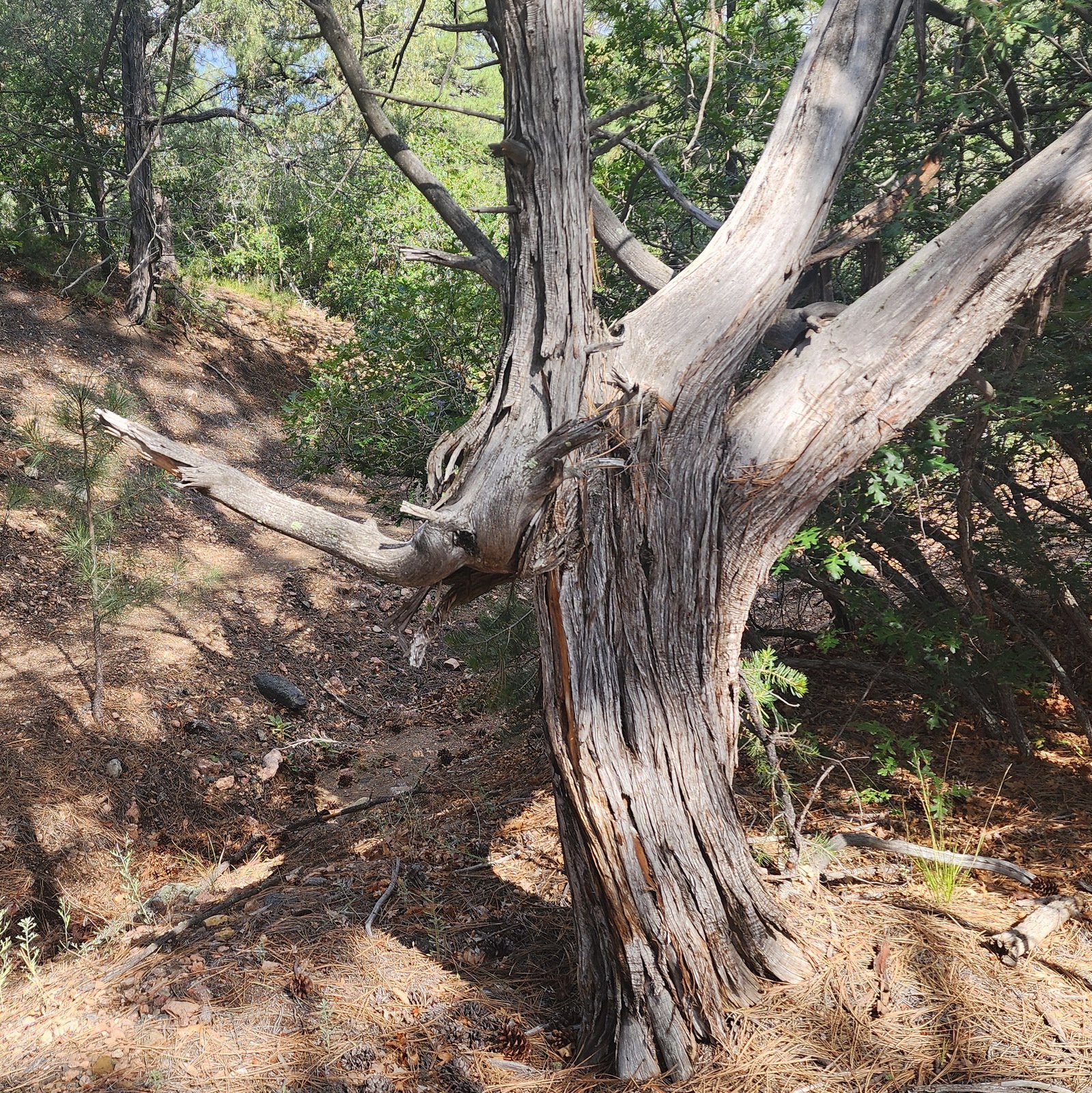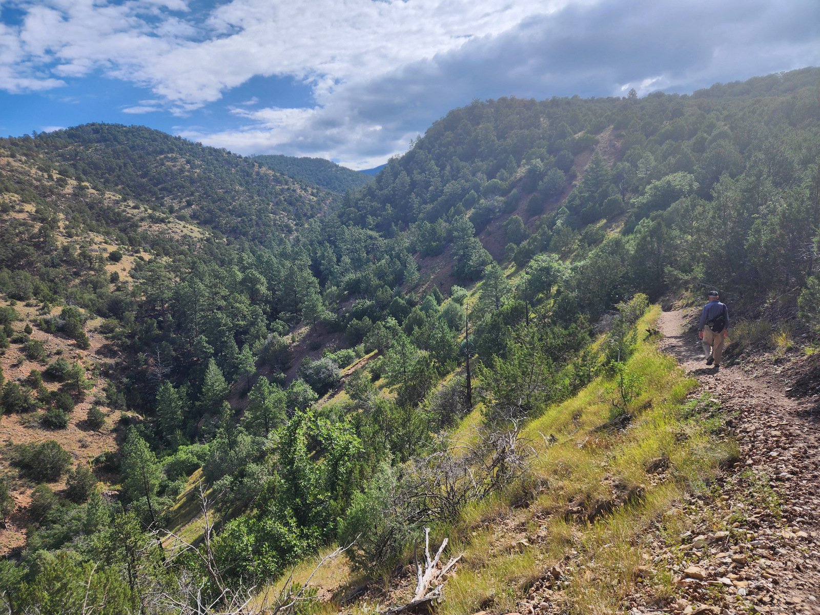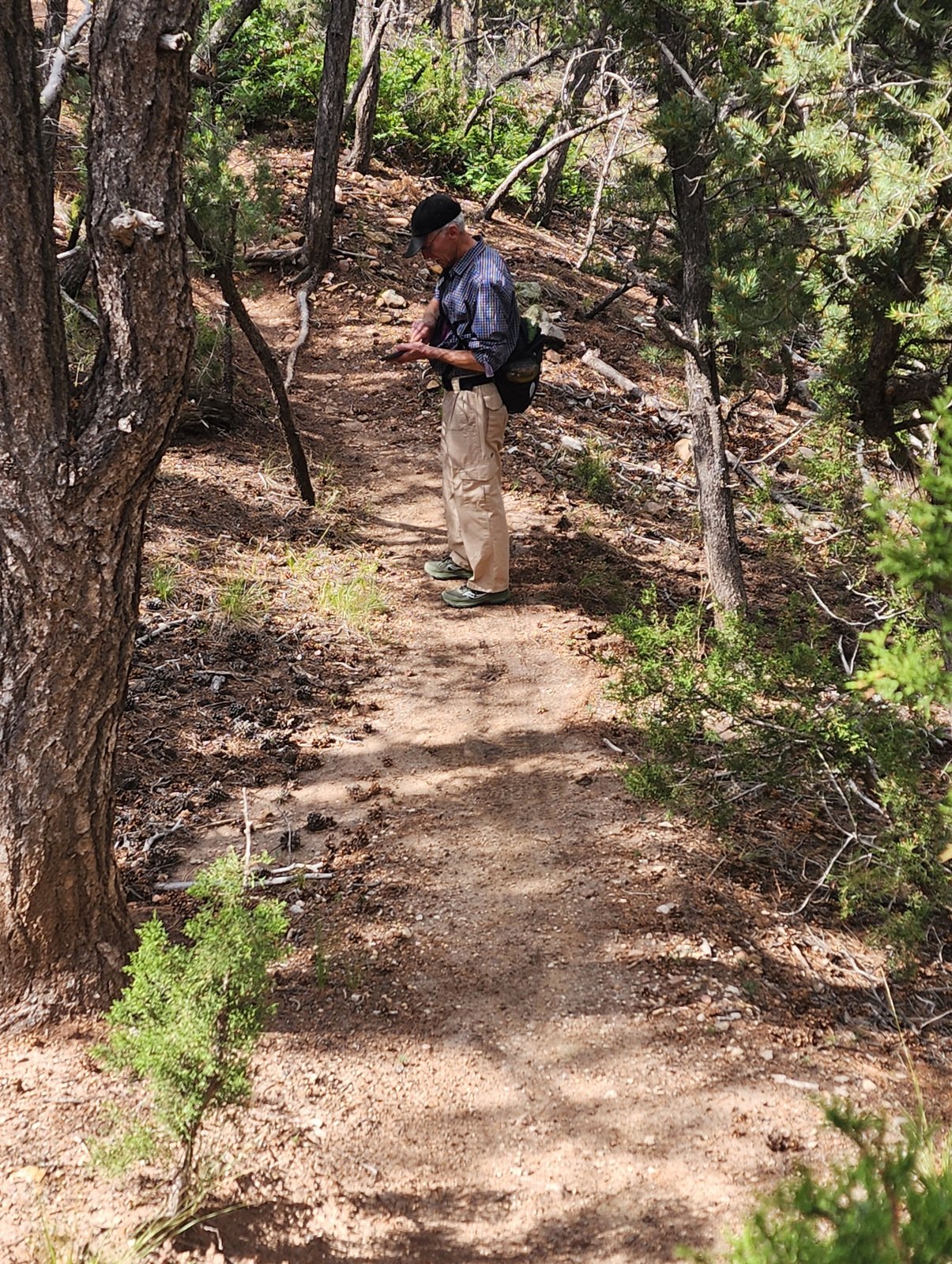 Topping out, we encountered the junction with the Carol-to-Juan trail, which we had contemplated at the beginning of our hike. But having come only half a mile, the loop Juan-Carol-Little Tesuque loop would not be long enough. So we chose to continue on Juan (further on named Burn Trail on some older maps) then pick up Carol to return south to the Little Tesuque.