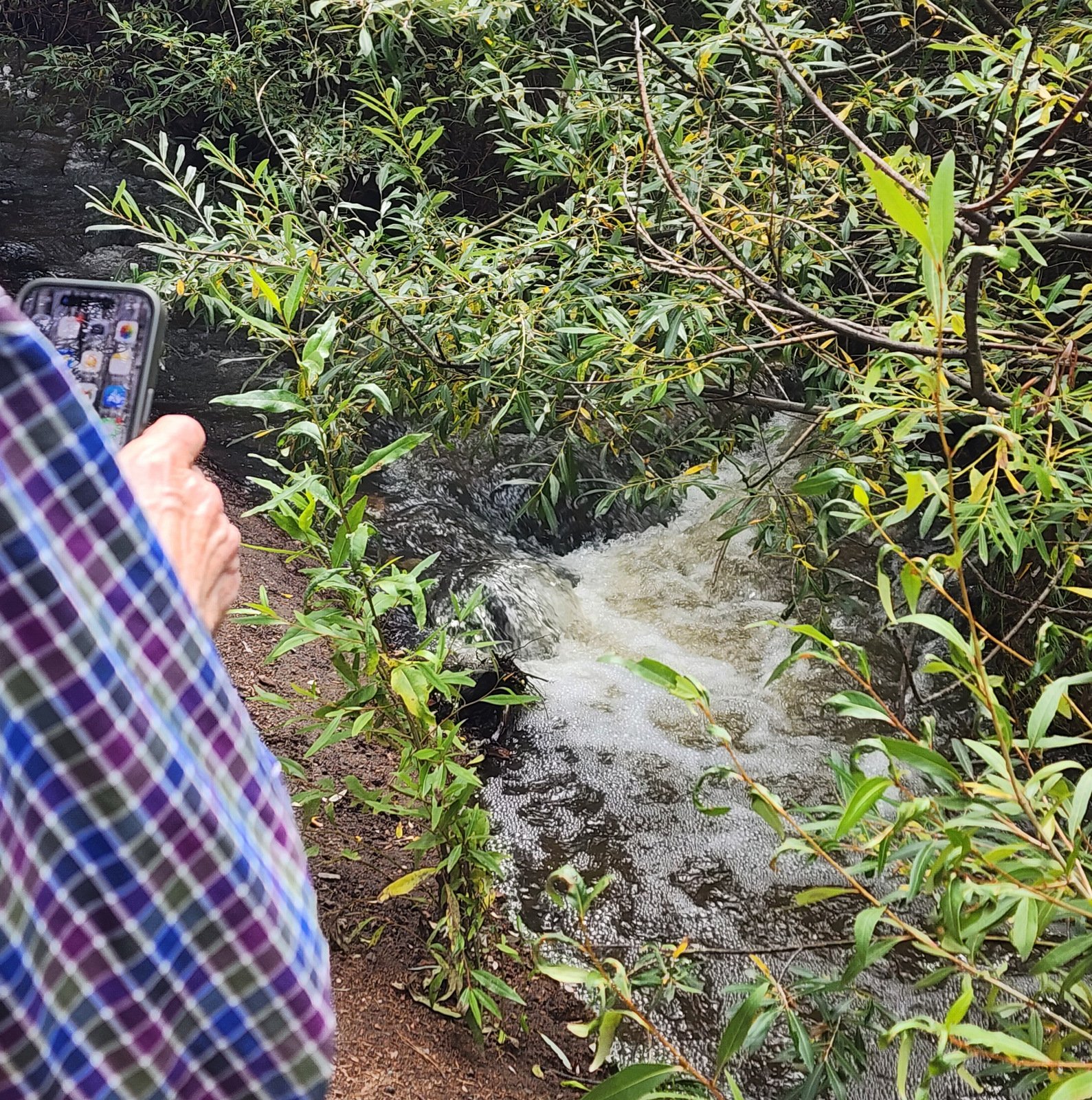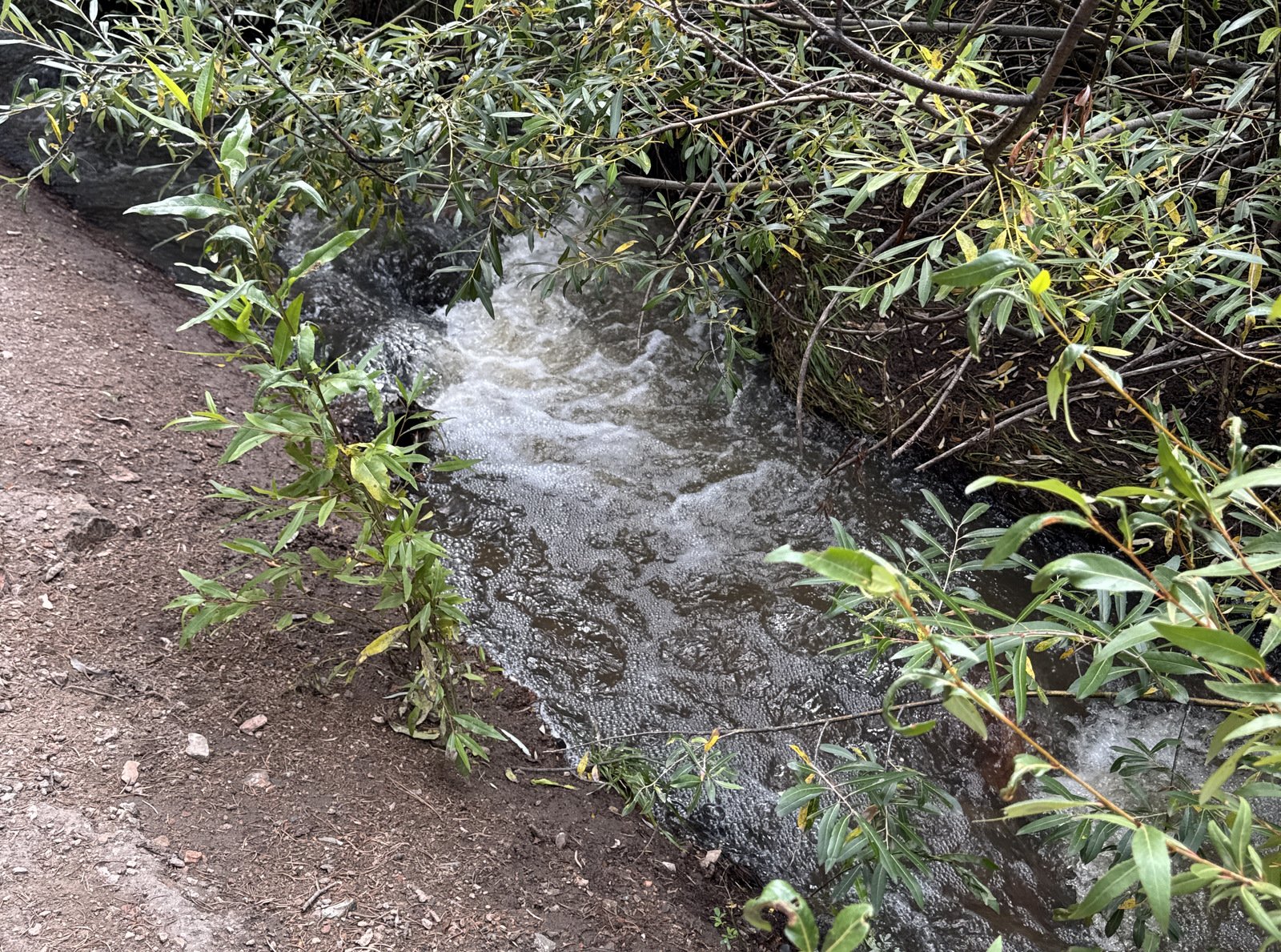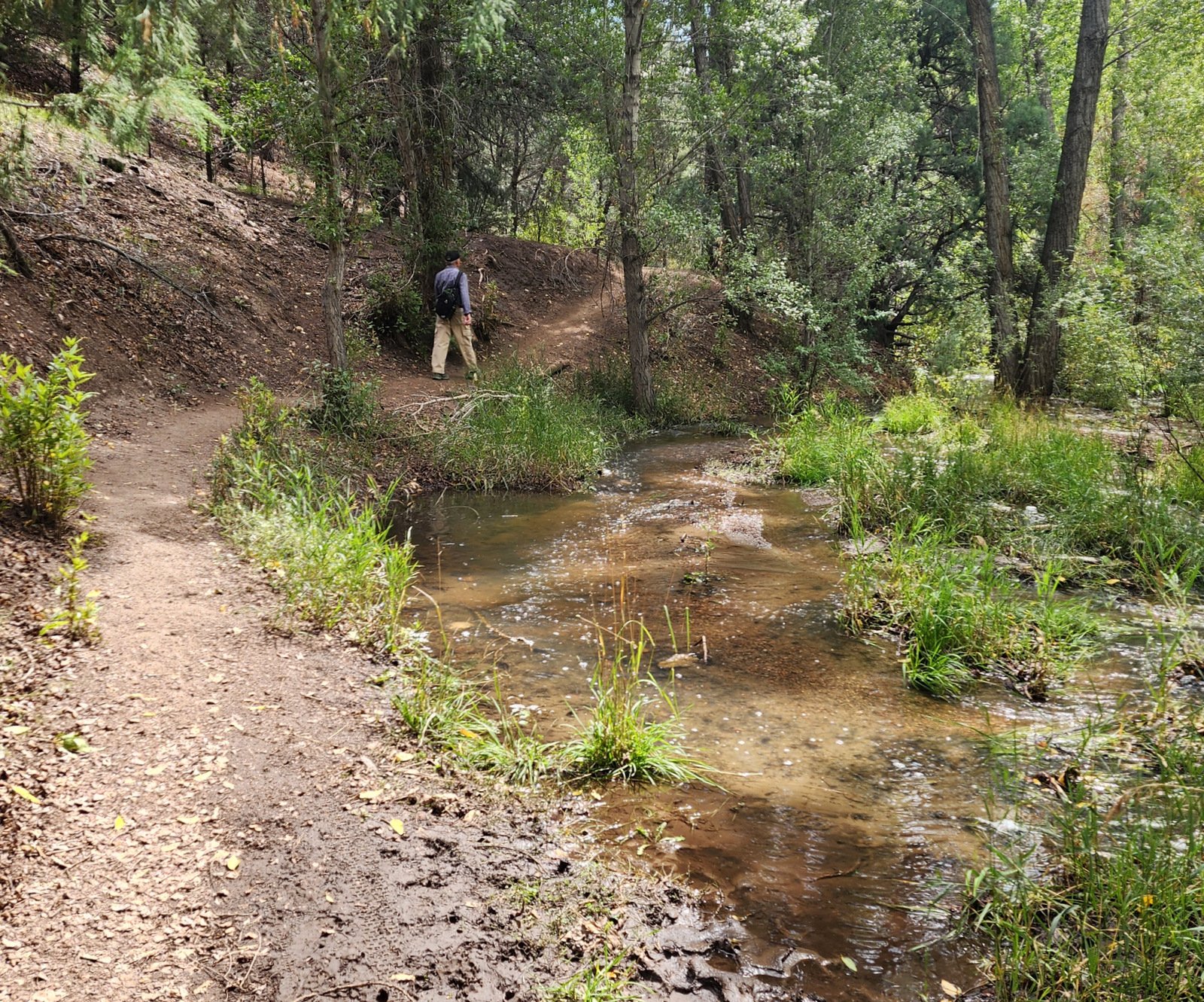From here it was a somewhat steep descent into a canyon, then down-canyon on a pleasant trail, then up onto a ridge (continuing shallow descent), then down into the Little Tesuque Creek canyon. From here it was a gentle ascent ‘up the creek’, back to the wye with Juan and on to the trailhead. We encountered more sections where the high-running creek overflowed the trail, but we followed the lead of others, taking a bypass above the running water.