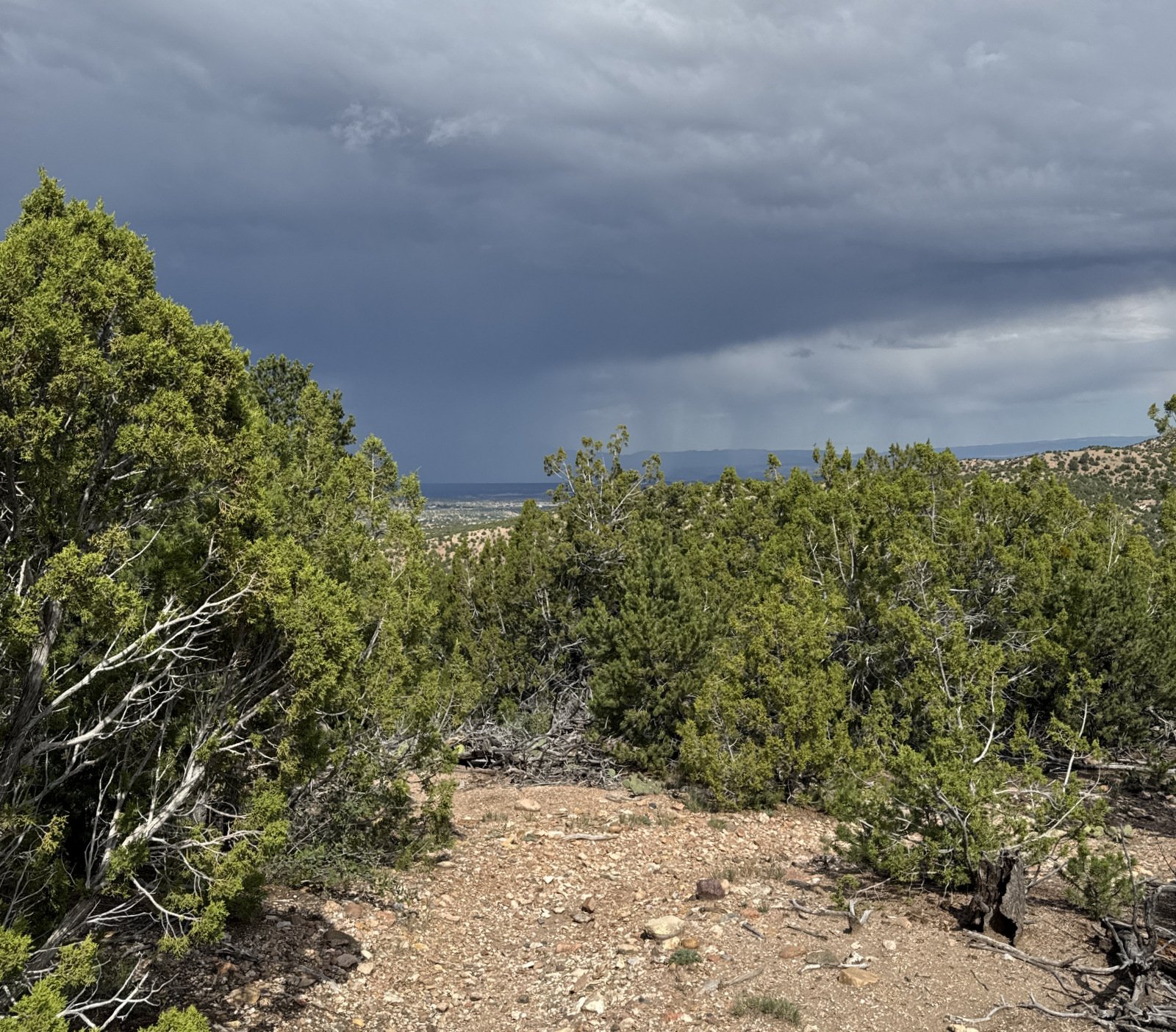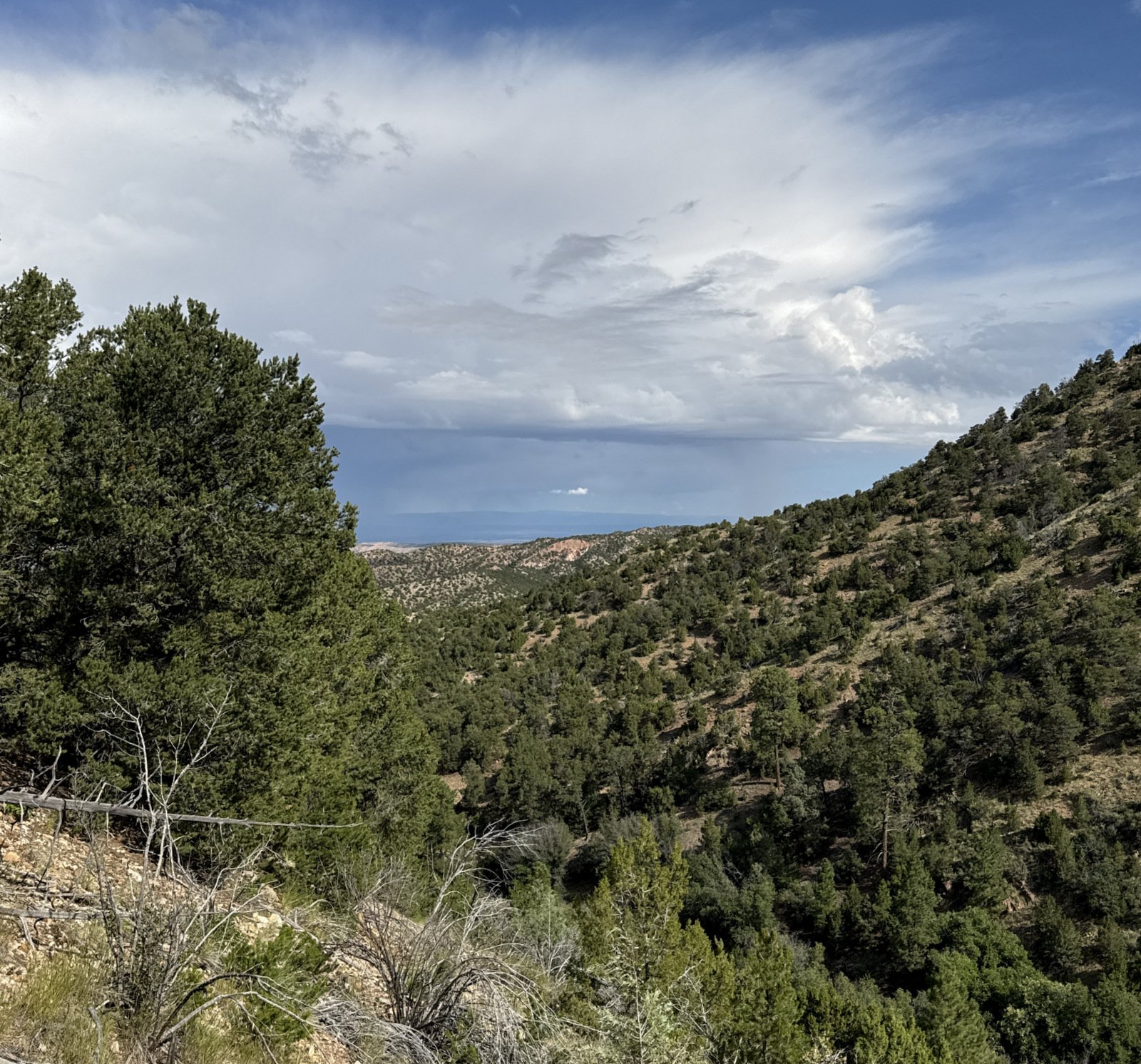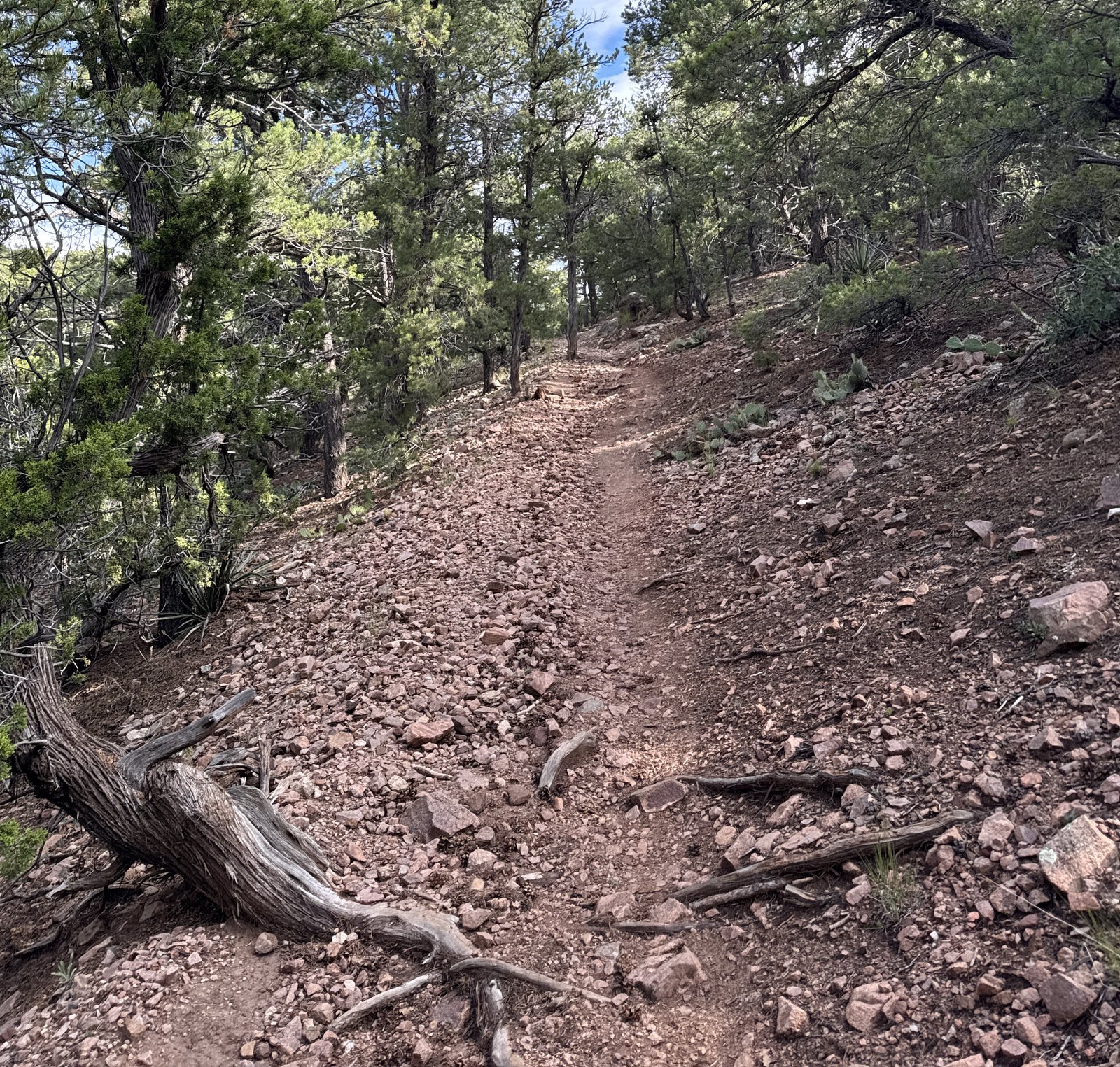 Well, that wasn’t quite “topping out”; we continued for another quarter mile with easy ascent to the highest point on the hike (which happens to be the intersection with the Saddleback Trail and where we cross a fence line into the Santa Fe National Forest).