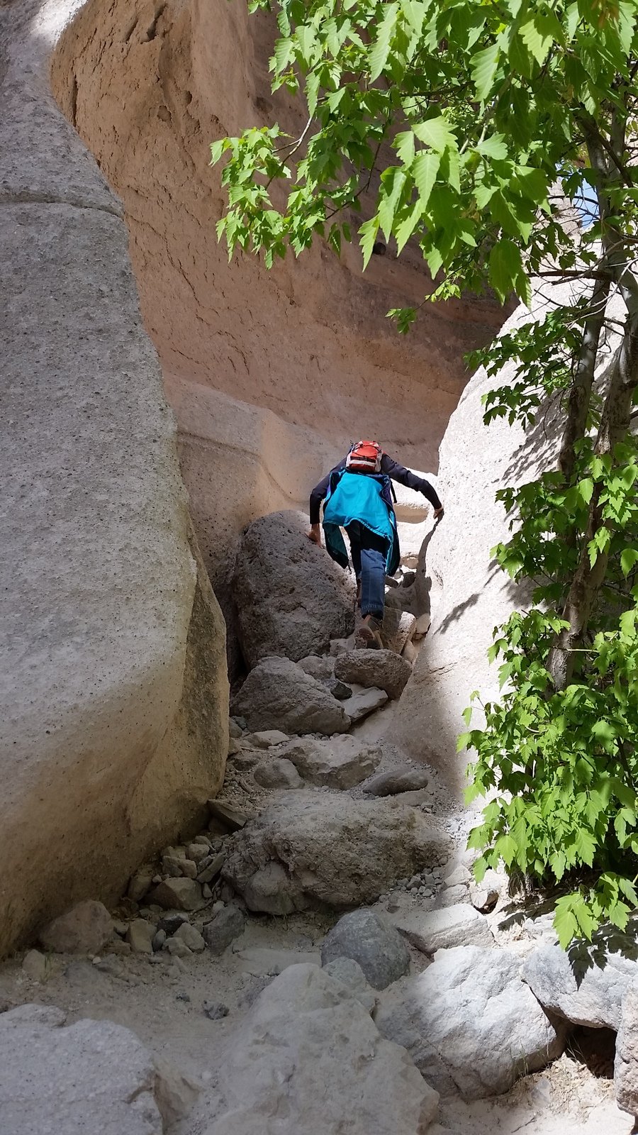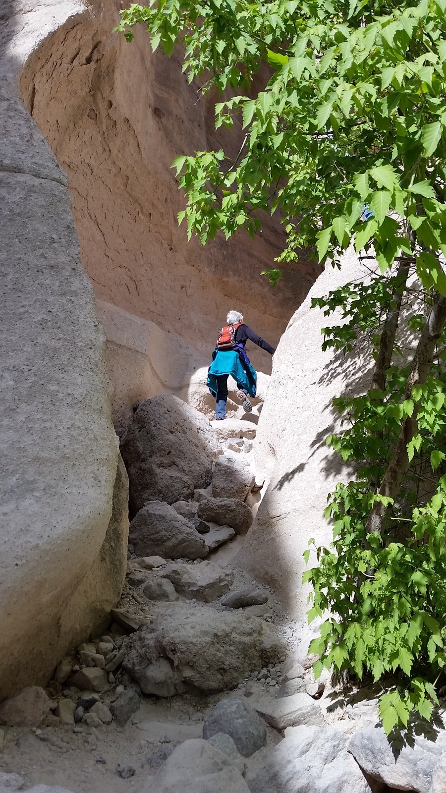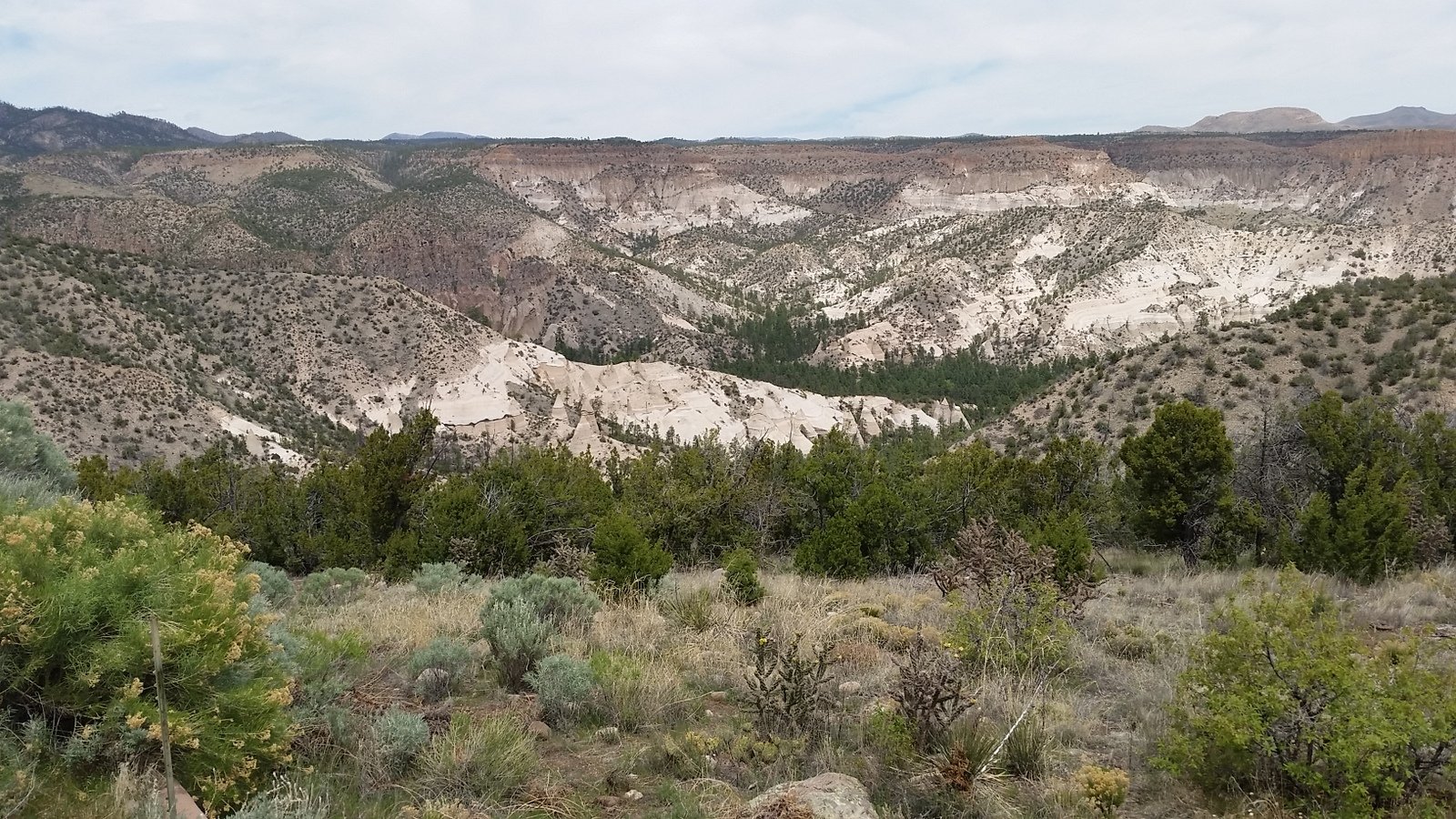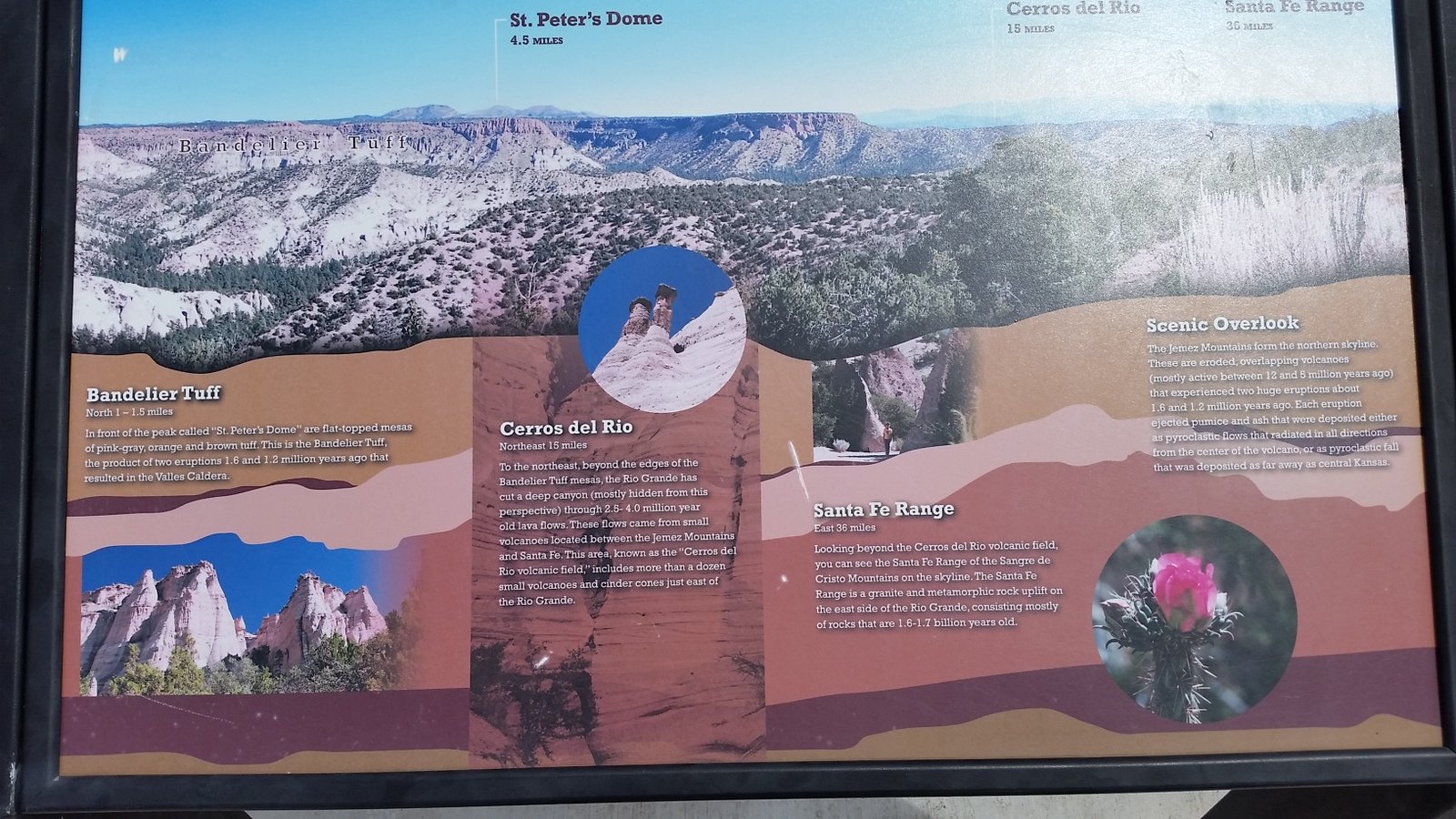 On this visit we set out to hike the complete trail, through the slot canyon and up to the crest of the mesa overlooking the hoodoos (the Slot Canyon Trail), then returning by way of the Cave Loop Trail. After the hike we continued on BLM 1101 to the Veteran’s Memorial Scenic Overlook, our first visit here and we recommend it for others who visit Kasha-Katuwe. The view down into Cochiti Canyon and its many more hoodoos, and across the southeast corner of the Jemez Mountains, including the Dome Wilderness, is spectacular.