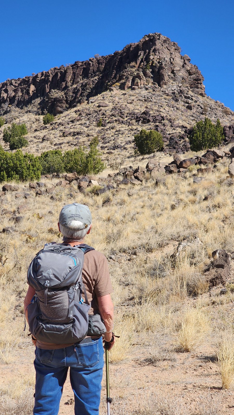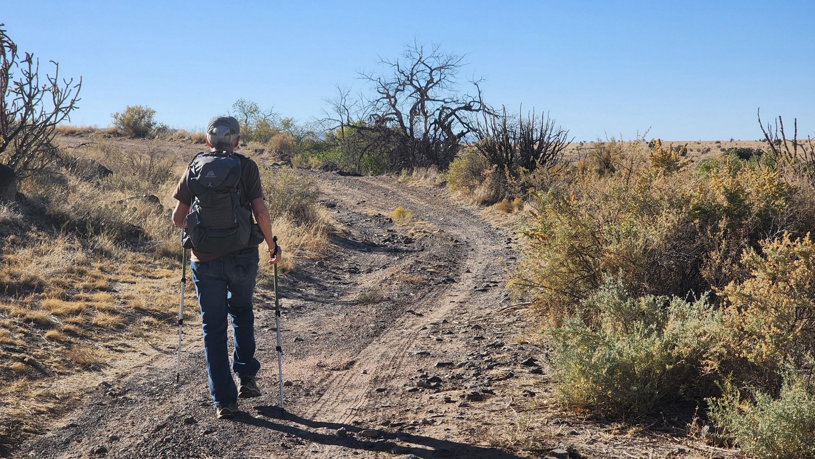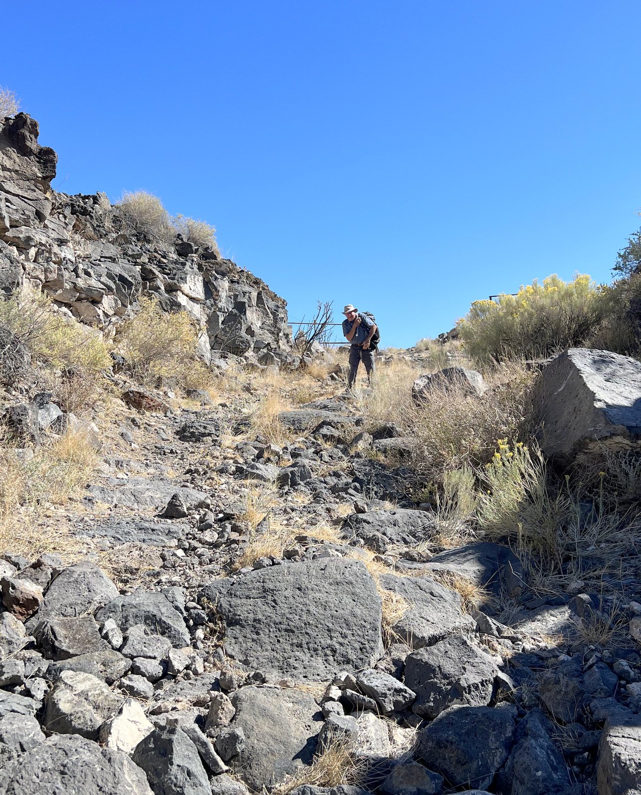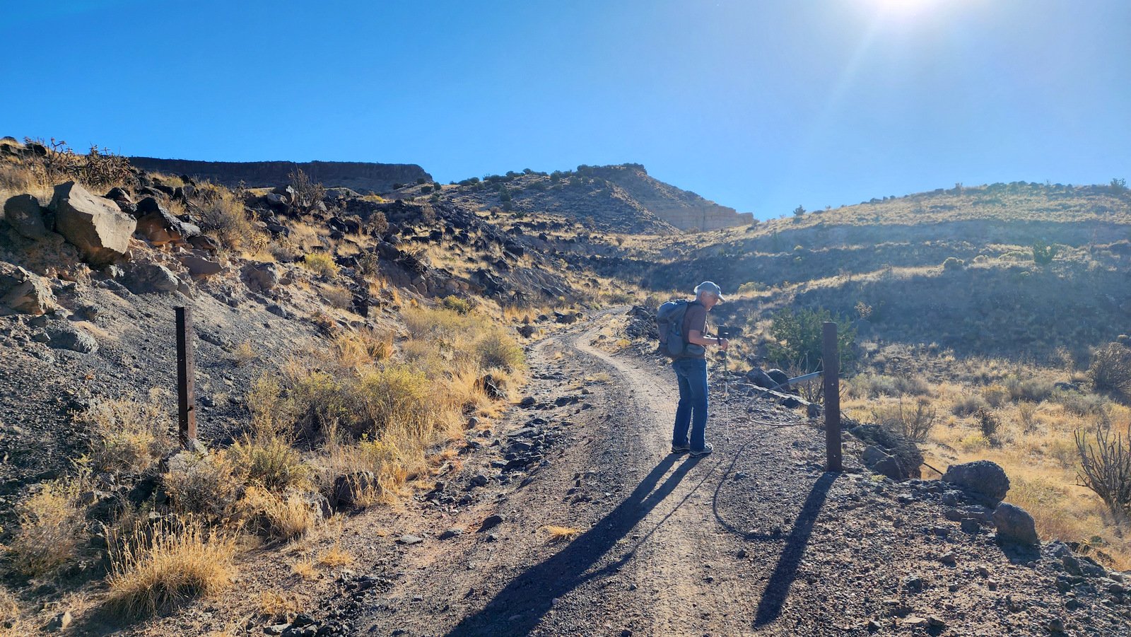 To make a loop, we would cut across the top of the mesa. However, we thought we might enjoy a great view if we went to the point. So we set our course to 190 degrees (with help of the GPS and GAIA) and along the west edge of the mesa. With no trail to follow, the ground was peppered with 6″, 10″, and larger lava rocks – these made the going tough. We bailed (still enjoying great views) and turned across the mesa towards the other road/two-track. We intercepted a two-track that led us to the ‘trailhead’ for the descent.