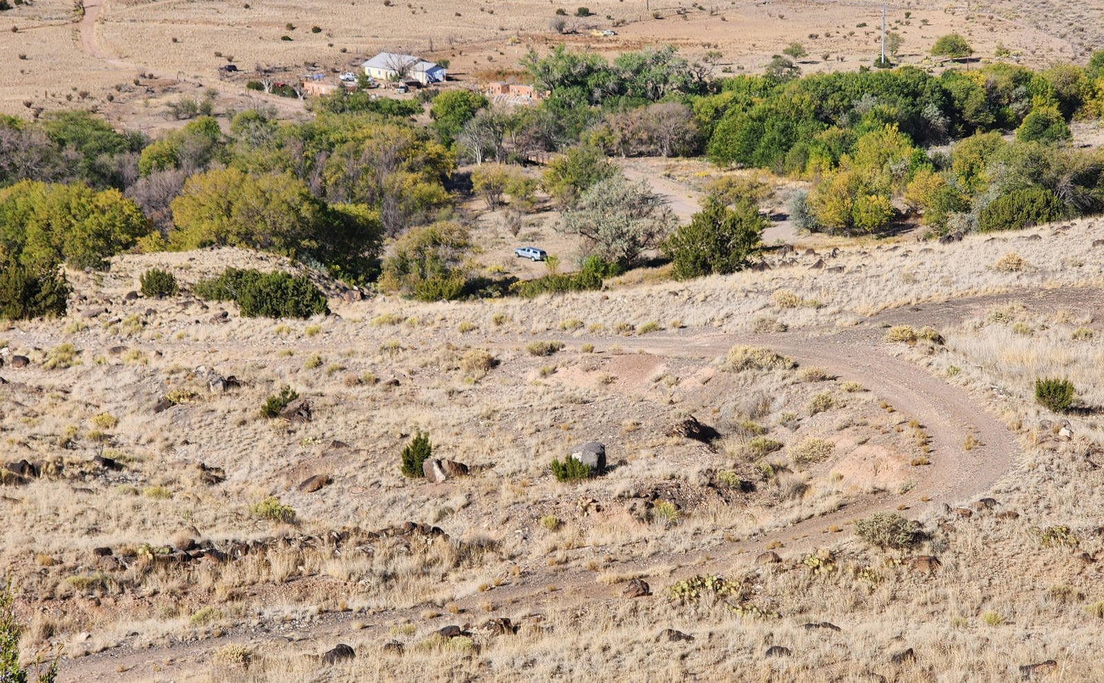 The ‘trailhead’ is just beyond the village of La Bajada. From I-25 on the way from Albuquerque to Santa Fe, just before the highway starts uphill, exit onto NM 16 towards Peña Blanca. In 3.7 miles, turn right towards La Bajada (and the signs point to Tetilla Peak Recreation Area); it soon turns from paved to gravel. After crossing the bridge over the Santa Fe River, turn right onto La Bajada Village Road (2.4 miles). Passing the village on your right, continue for 1 mile to an intersection with a road going back across the Santa Fe river (a part of the original Route 66); park here – the trail continues on the gravel road/two track ahead .