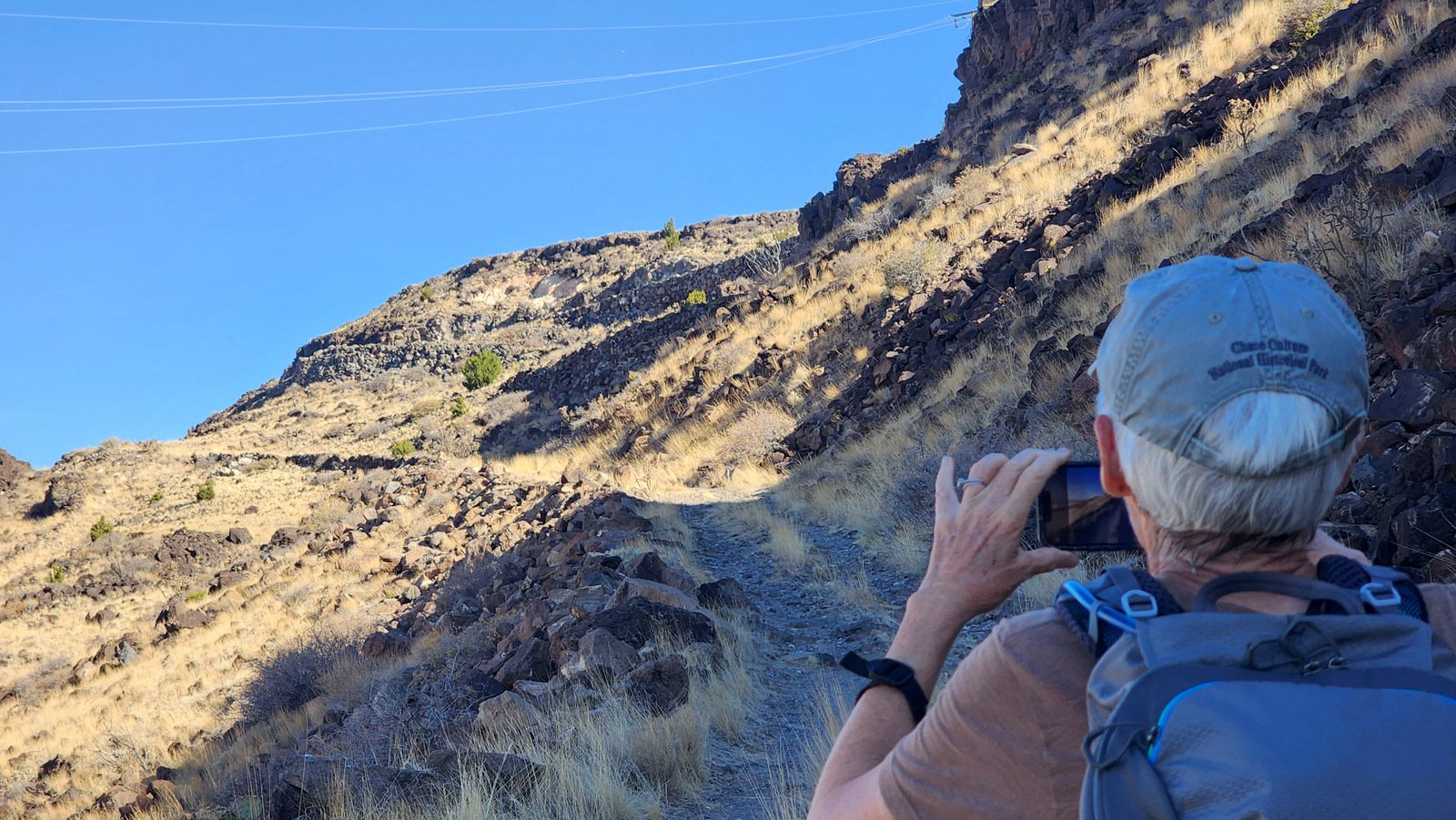 he trail -is- the old Route 66. We planned to make our hike a loop, up one of the roads, then down another; the two legs join at that 3/4 mile point. And that first 3/4 mile is the section shown on so many photos – 6 or 7 switchbacks as it ascends the first 200 feet or so. It is a fairly steady climb with gravel being the predominant road/trail surface, with some sections rocky rock covered in some sections, and
