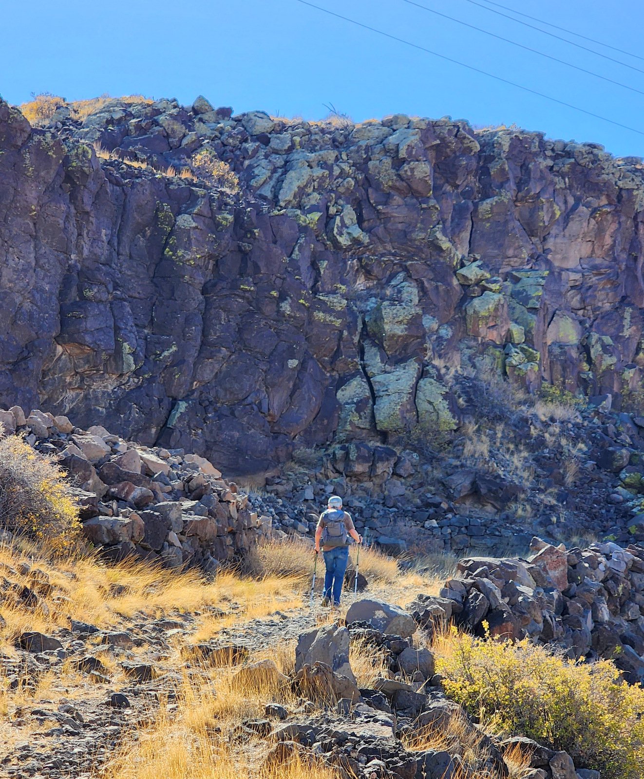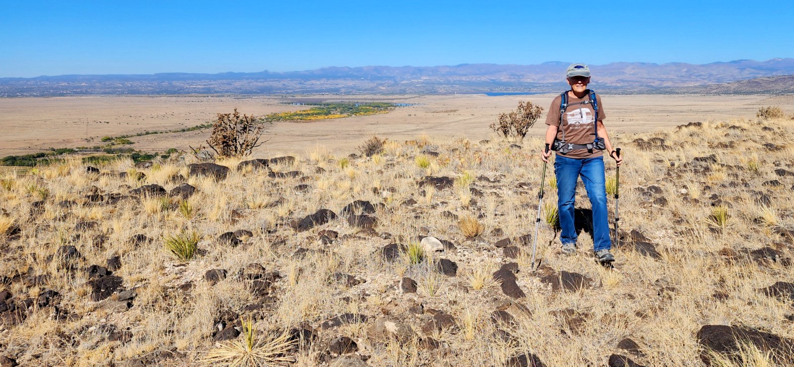 In so many ways this hike reflects what we enjoy so much about New Mexico. All around us there is history, from the Native Americans to the modern times. Hiking puts us into wildly open spaces with views of mountains, plains, rivers, and (almost) always the vibrant blue of New Mexico skies. And this time of year there are more colors – in the distance the cottonwood trees turning their golden yellow with some trees still green, complemented by some water (Cochiti Lake over Pat’s shoulder) and the skyline of the Jemez Mountains. “Why?”