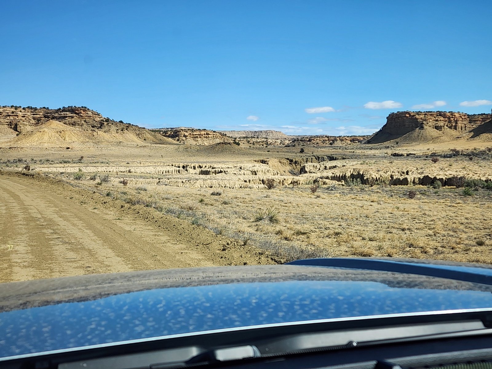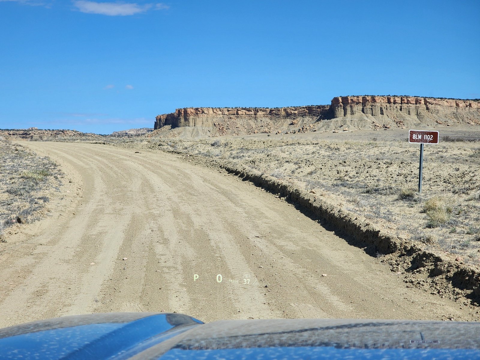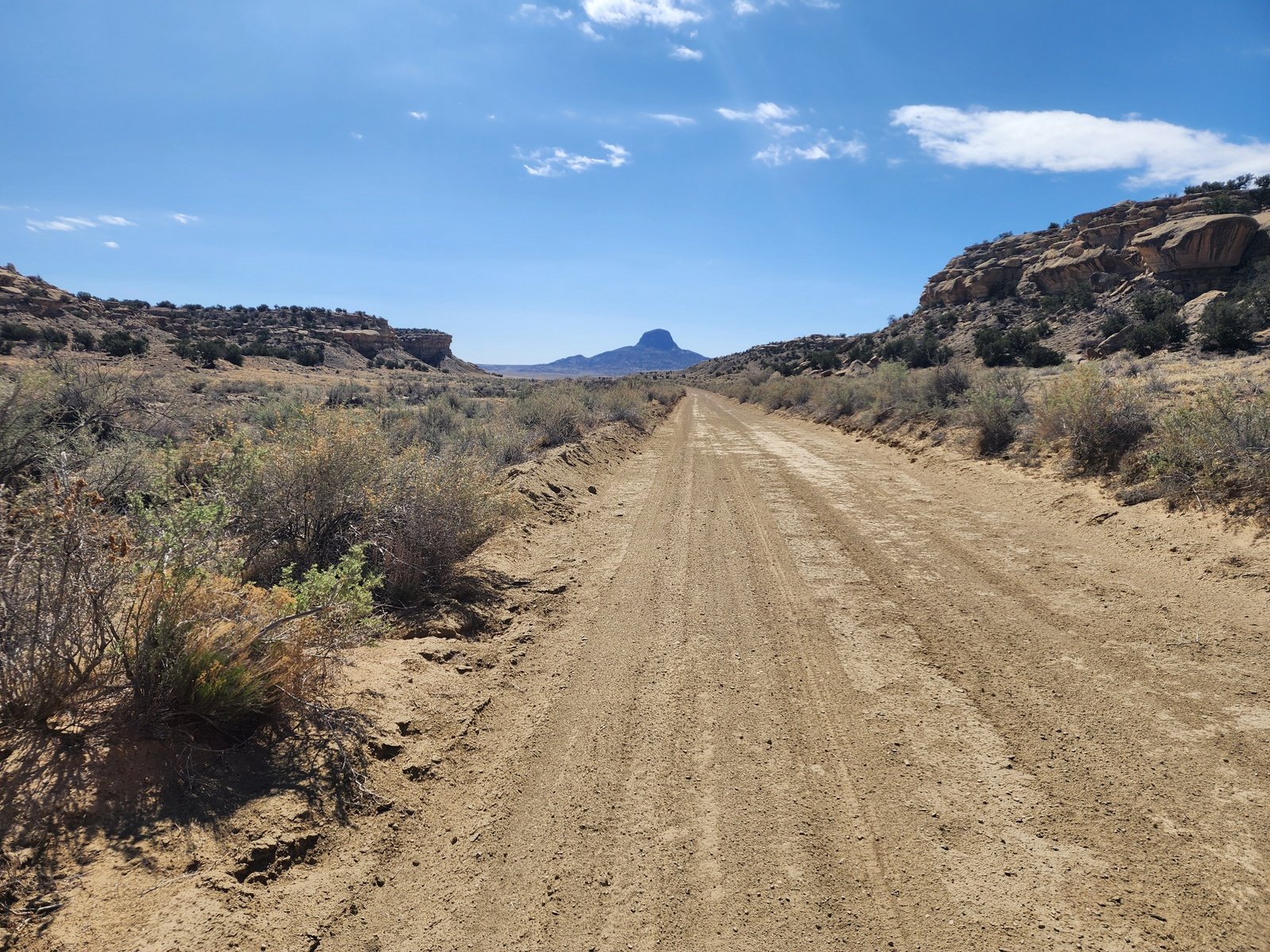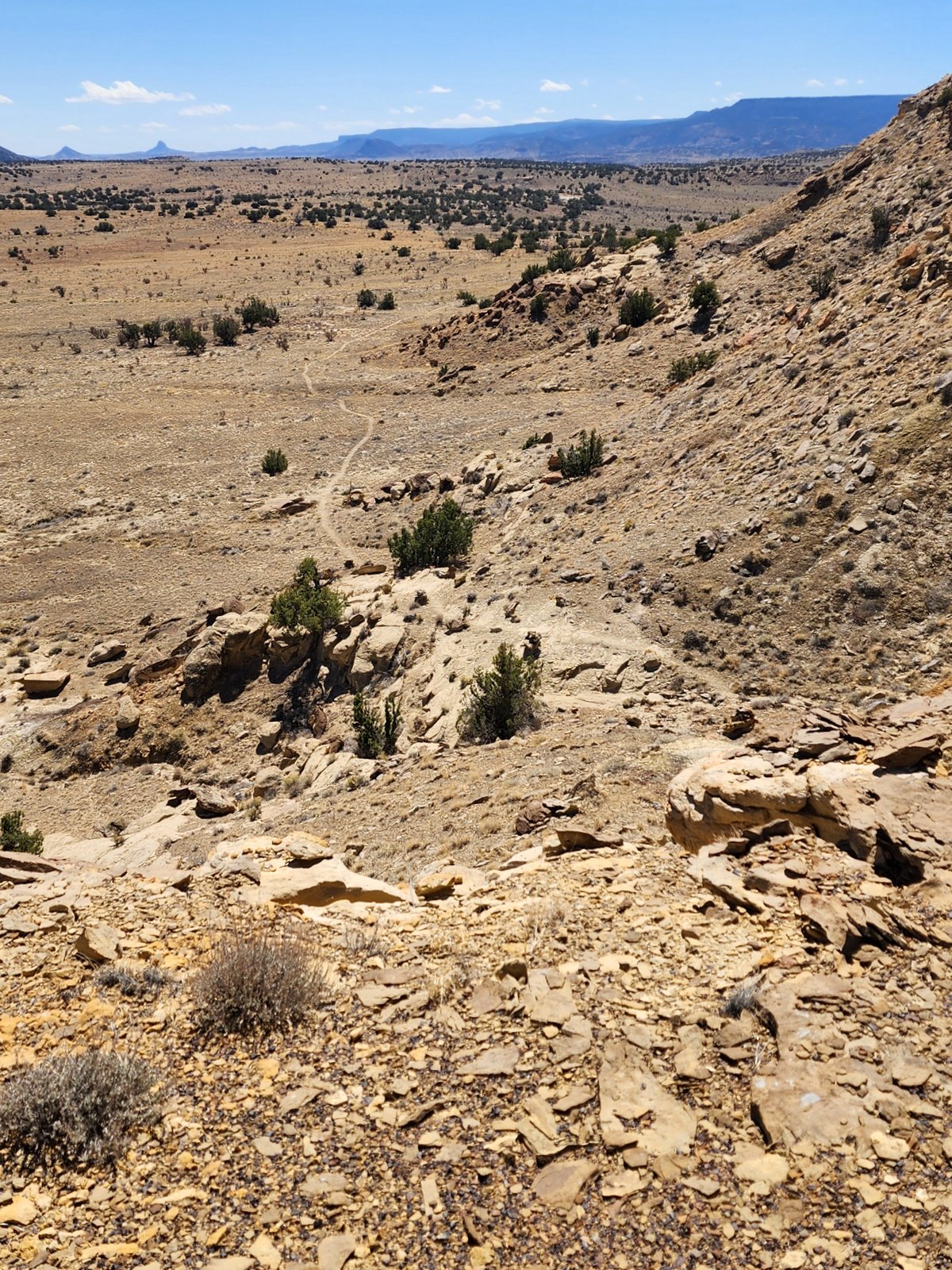 I’ll diverge here – the scenery is amazing, with mesas in every direction, the deep vertical-wall arroyo on our left, and Cabezon behind us (in front of us on the way out).