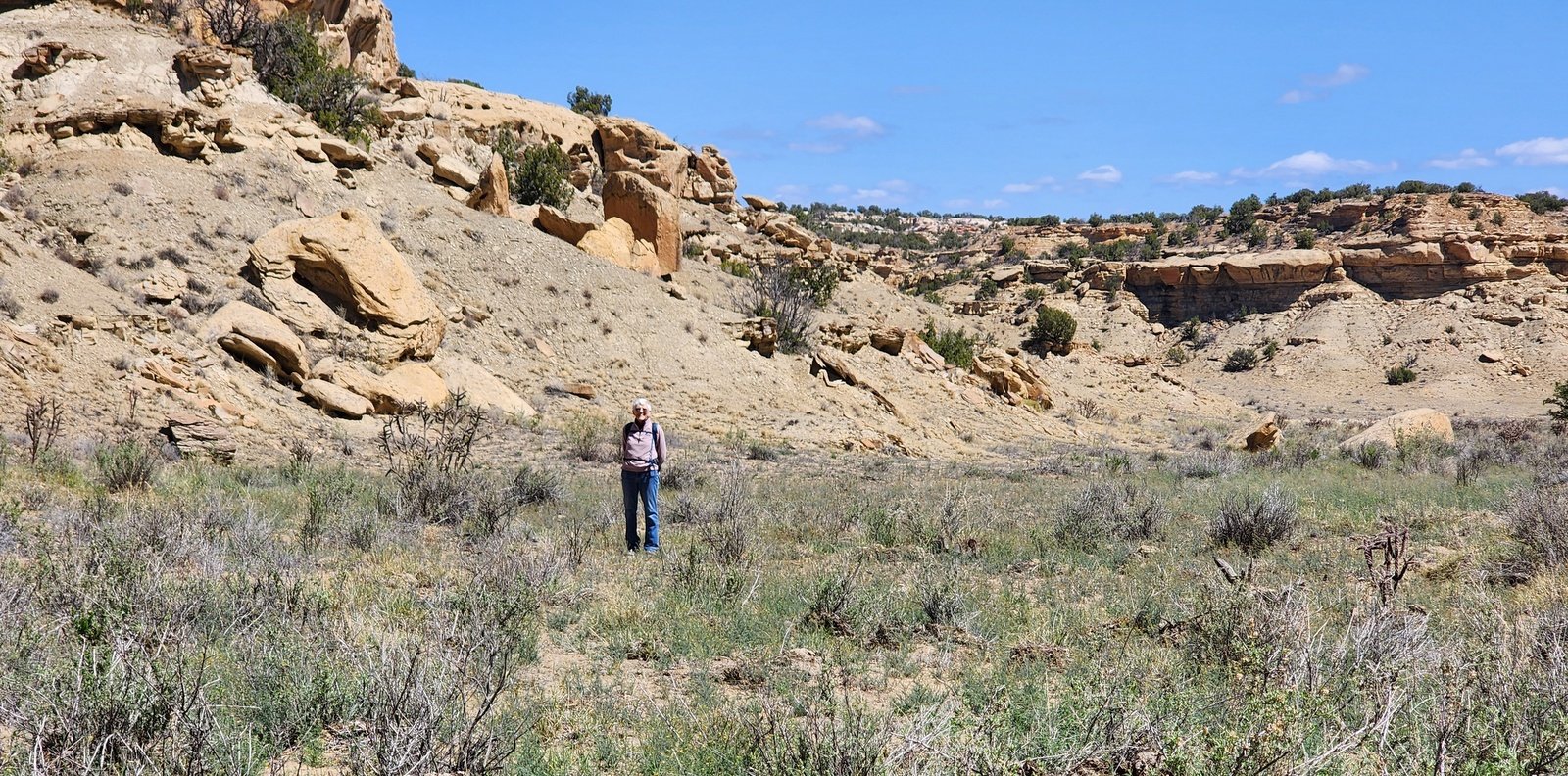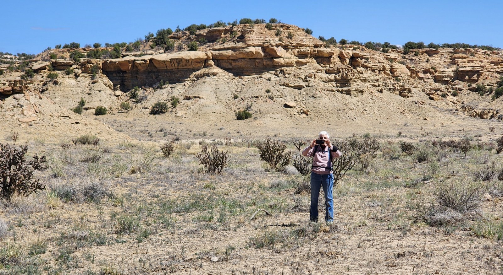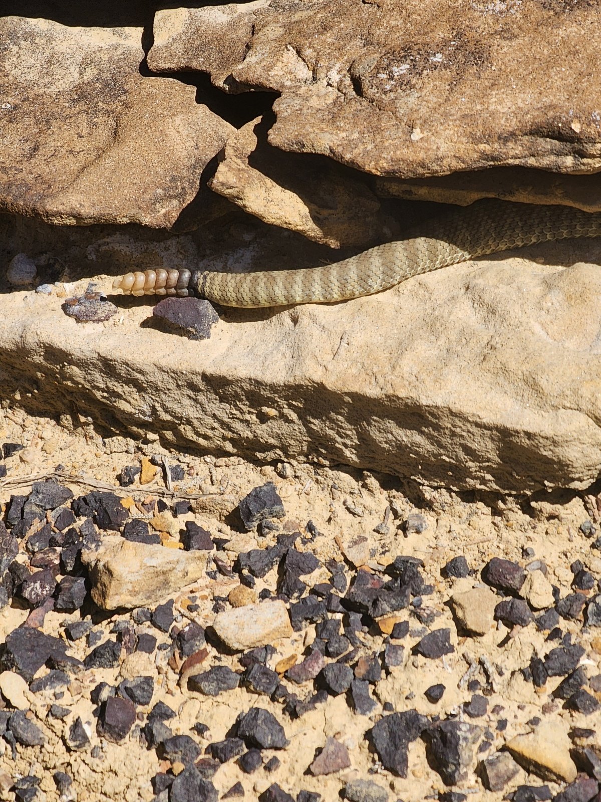As noted above, the views of the arroyo, mesas, out the horizon are … spectacular. And closer at hand: Mother Nature can be quite a sculptor, and … the sound of a rattle got Pat’s attention – we were able to get a picture before he wiggled entirely into the cairn.