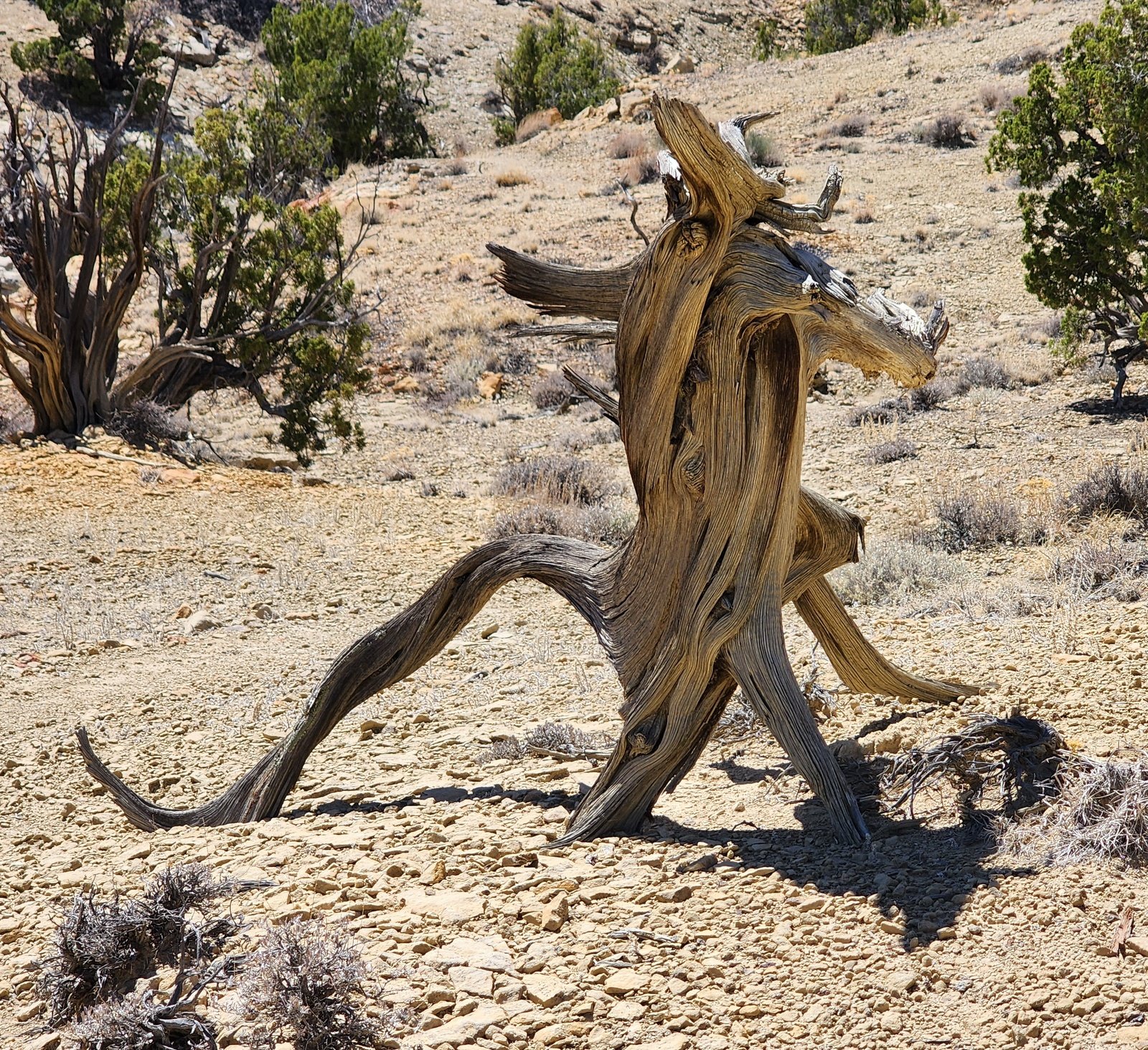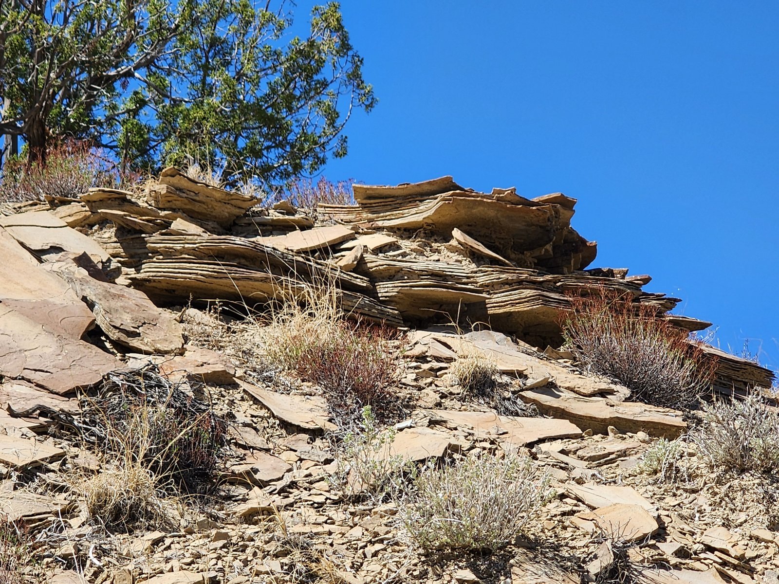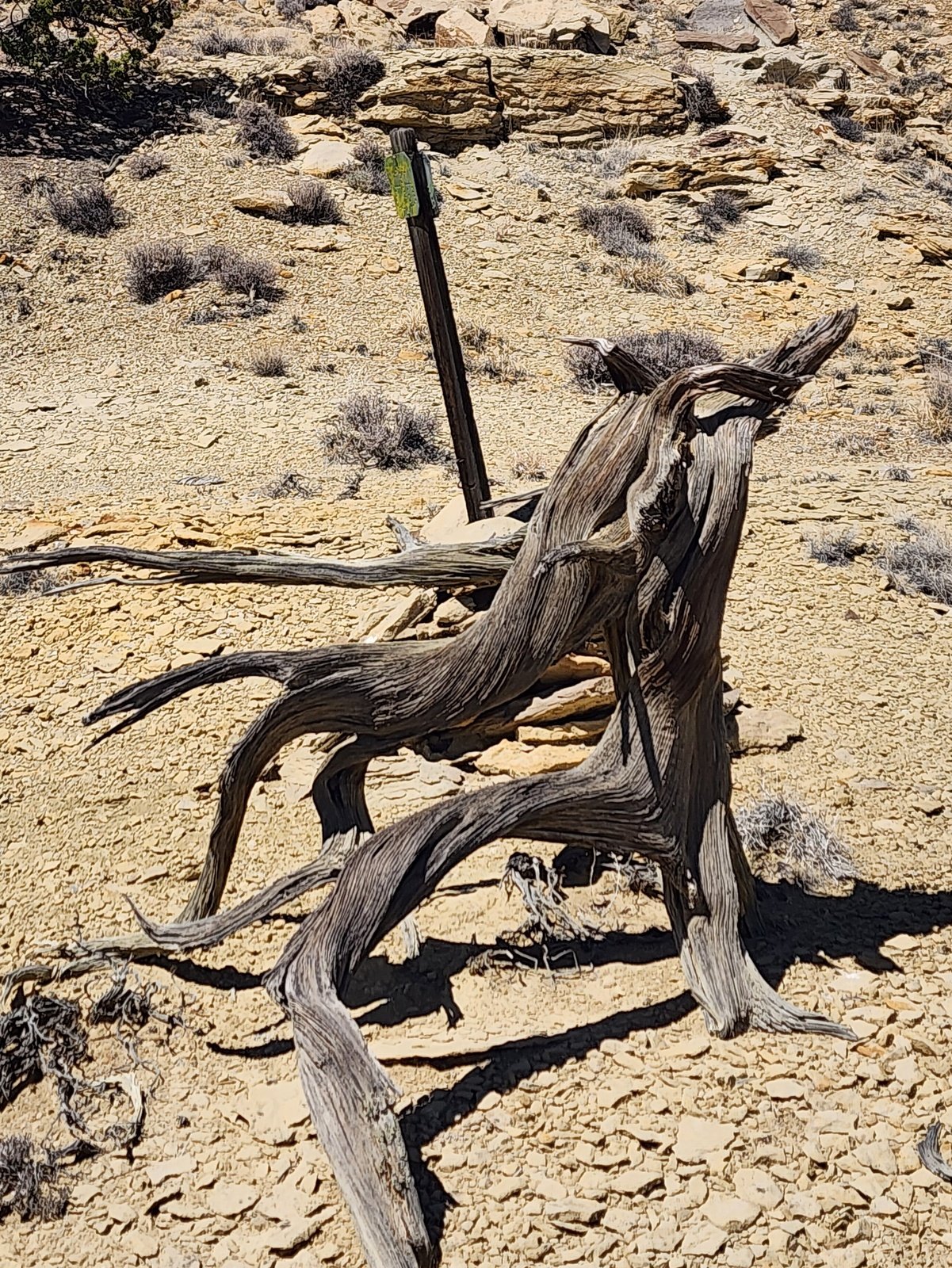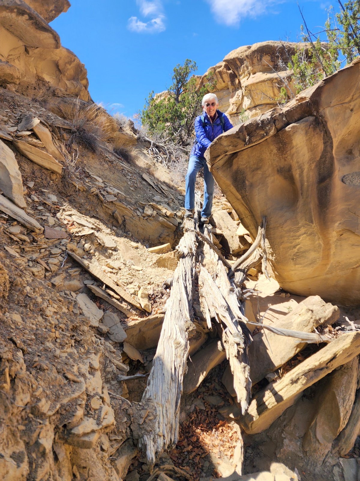 As noted above, the views of the arroyo, mesas, out the horizon are … spectacular. And closer at hand: Mother Nature can be quite a sculptor, and … the sound of a rattle got Pat’s attention – we were able to get a picture before he wiggled entirely into the cairn.