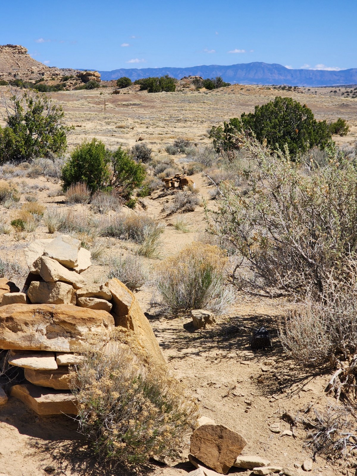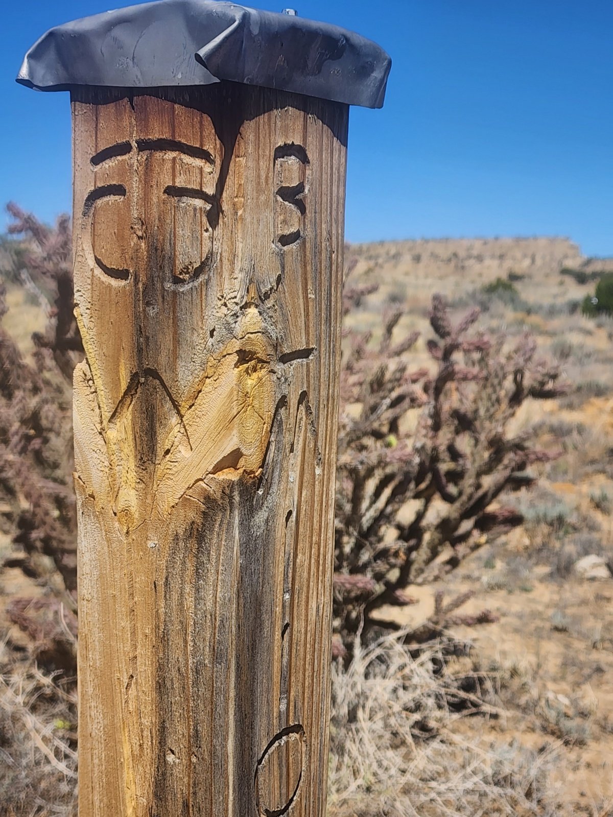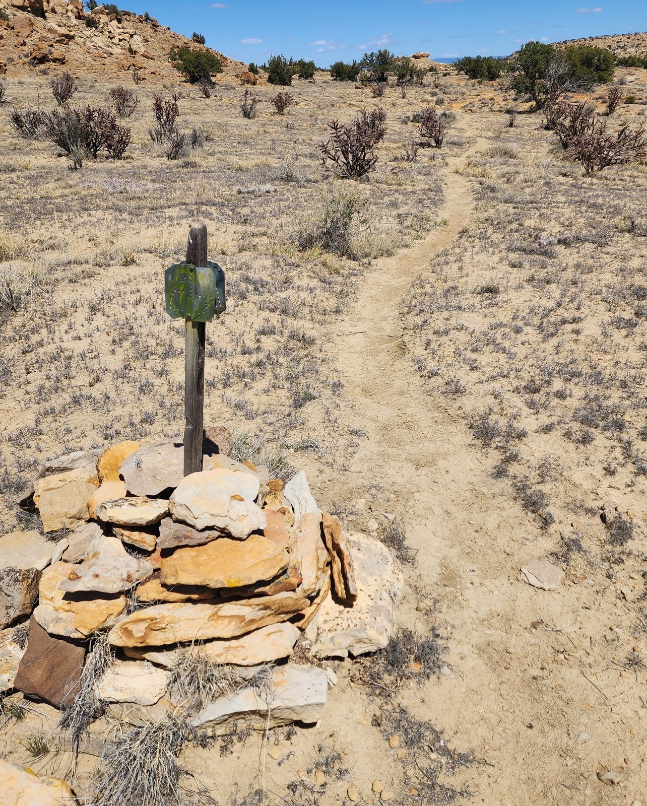 On a hike up Mount Taylor a few years ago we encountered a couple of through-hikers on the Continental Divide Trail. We had lunch with Jennifer atop Mt Taylor and subsequently followed here on her Video BLOG. I’m definitely not up to such an adventure, but since then I take any opportunity to hike a mile or two on the CDT. With it crossing this road in La Leña, we put on our -day- packs and followed the cairns SOBO (through hiker talk for southbound) for about a mile.