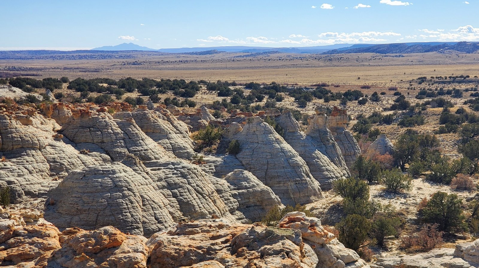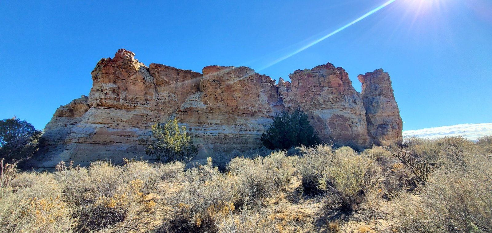 - Pass through the 1st fence line (with cattle guard), the boundary between the Reservation and the Herrera Ranch (private land). Another mile along park just beyond the 2nd fence line; you are now on BLM land.