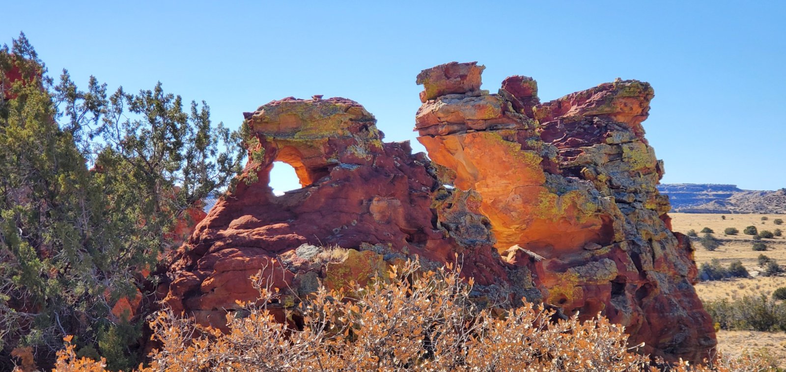 Not being familiar with the territory, we struck out east from the parking area on a 2-track that crossed over the southern end of a ridge. Soon the 2-track headed north, and recalling Pat Berrett’s advice, we left the 2-track and set out towards the fence line. As we crossed Cañada del Oso, we headed southeast, towards a prominent and interesting geologic feature. Along the way the red rocks that Pat B. had spoken about came into view. We continued on toward the “Red Butte” to take a closer look. The formation, maybe 30′ tall with columns and windows and amazing range of red colors and hues. Our photos don’t give it its due.