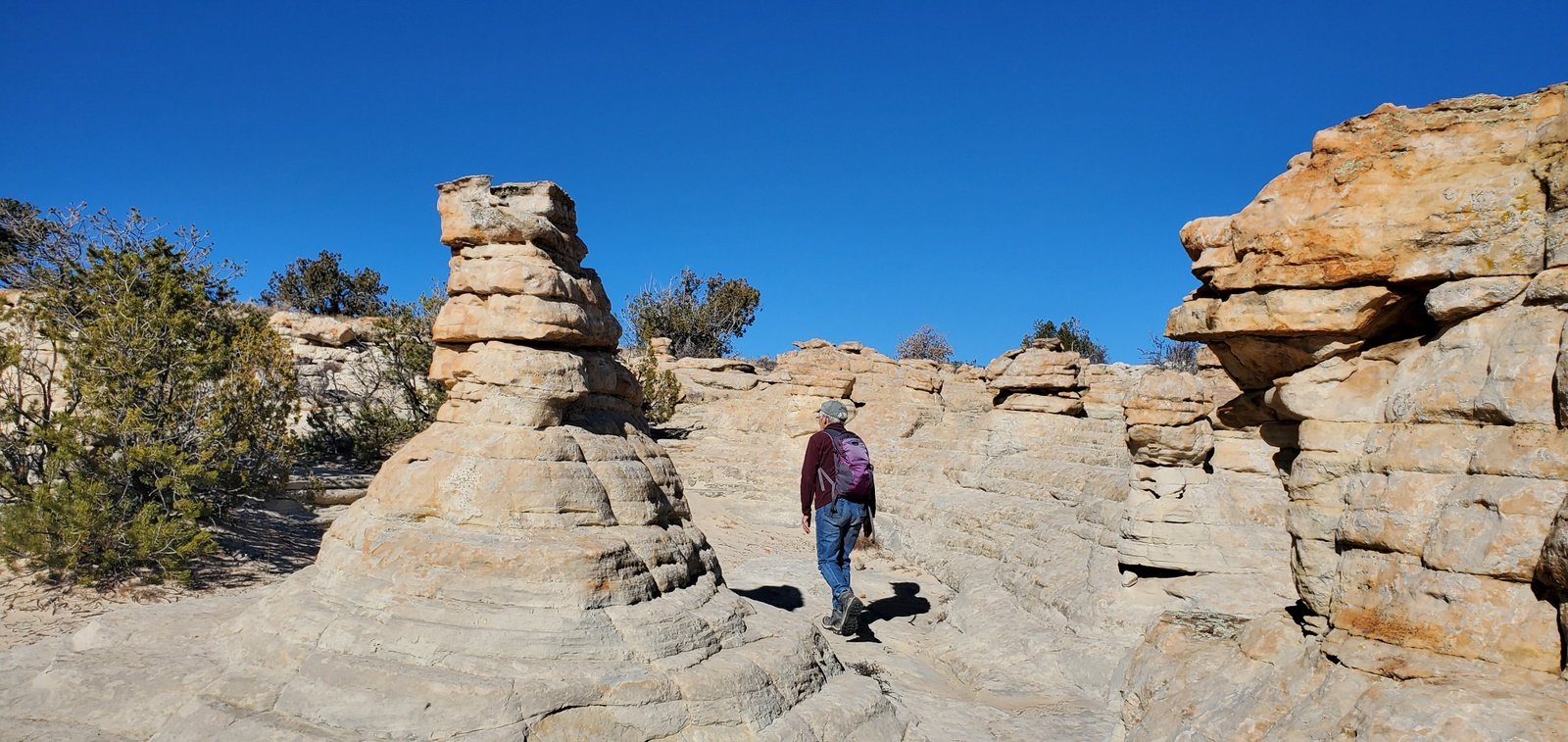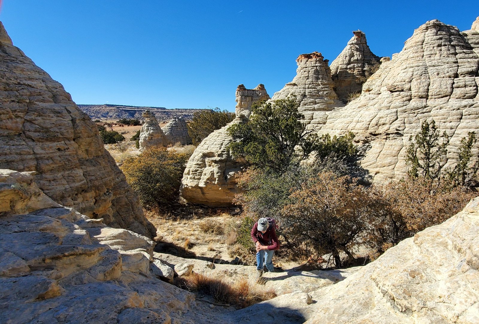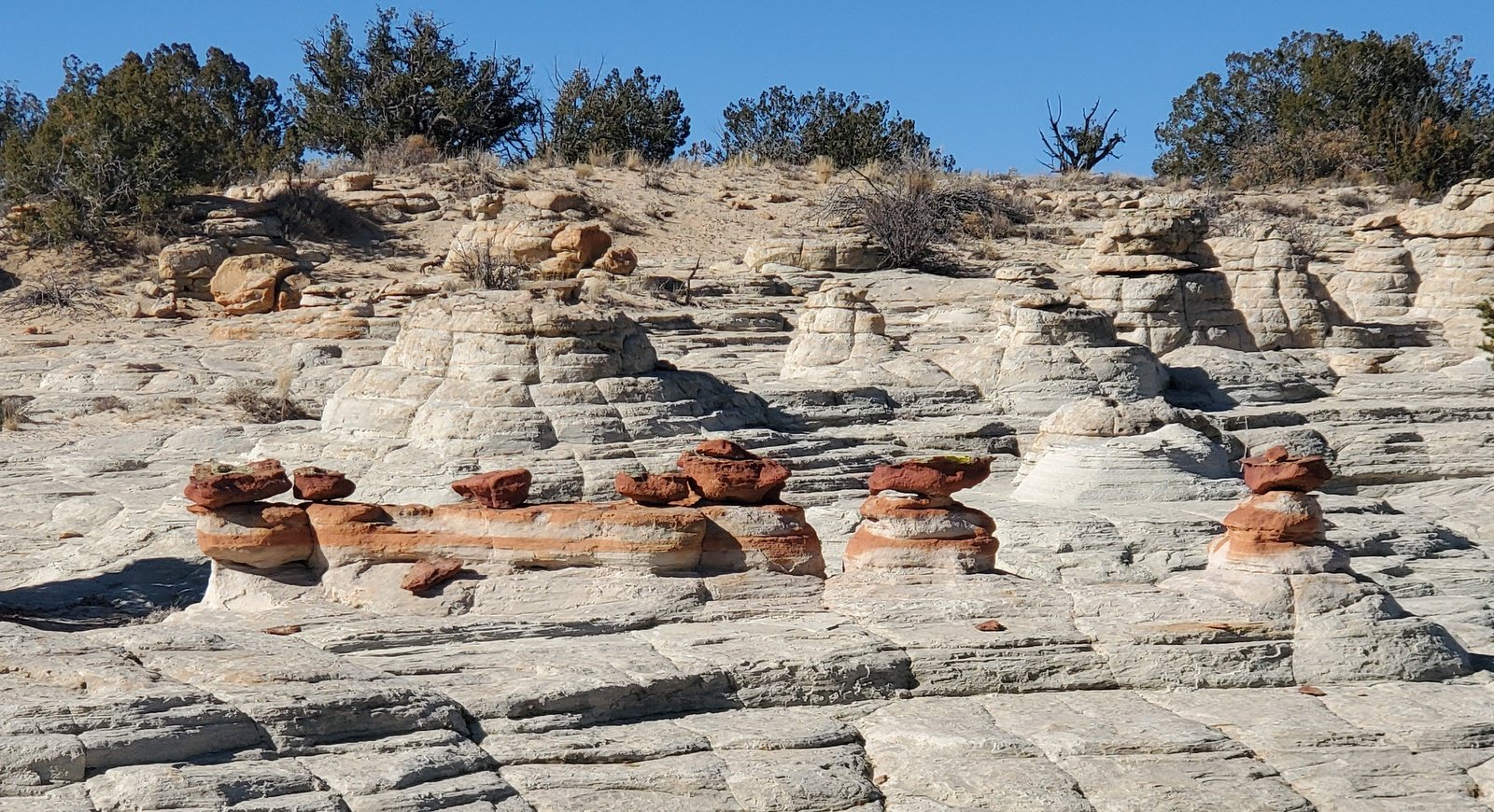 ‘Tis a beautiful place, with such a variety of interesting features – shapes, colors, and more. We’ve enjoyed Goblin Colony, Tent Rocks, Dinosaur Ridge, and mesas around Mesa de Cuba. But this is our favorite. And it is secluded – ‘tho a car was parked near ours when we returned, evidence (and location) suggest that it is rarely visited.