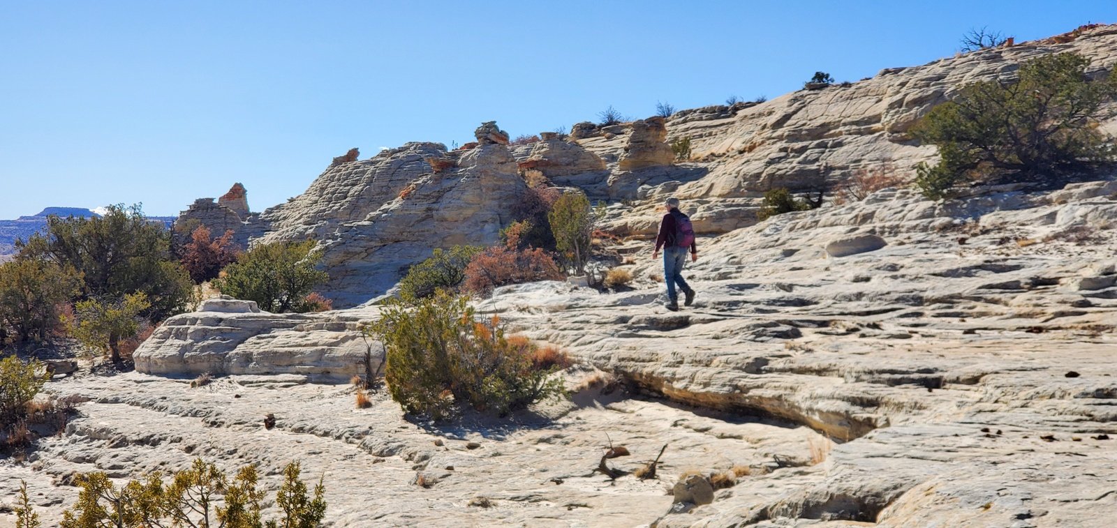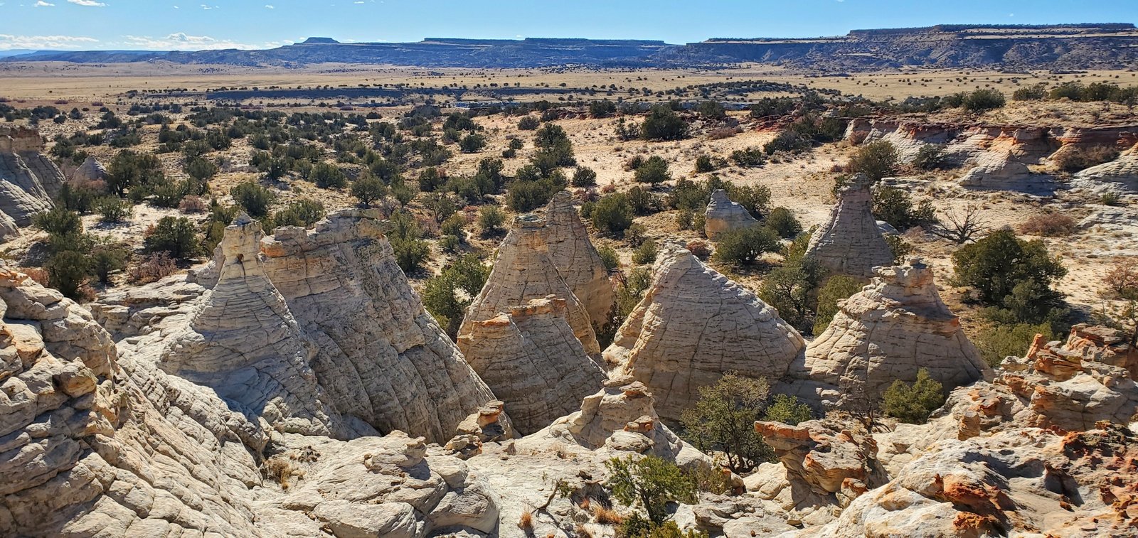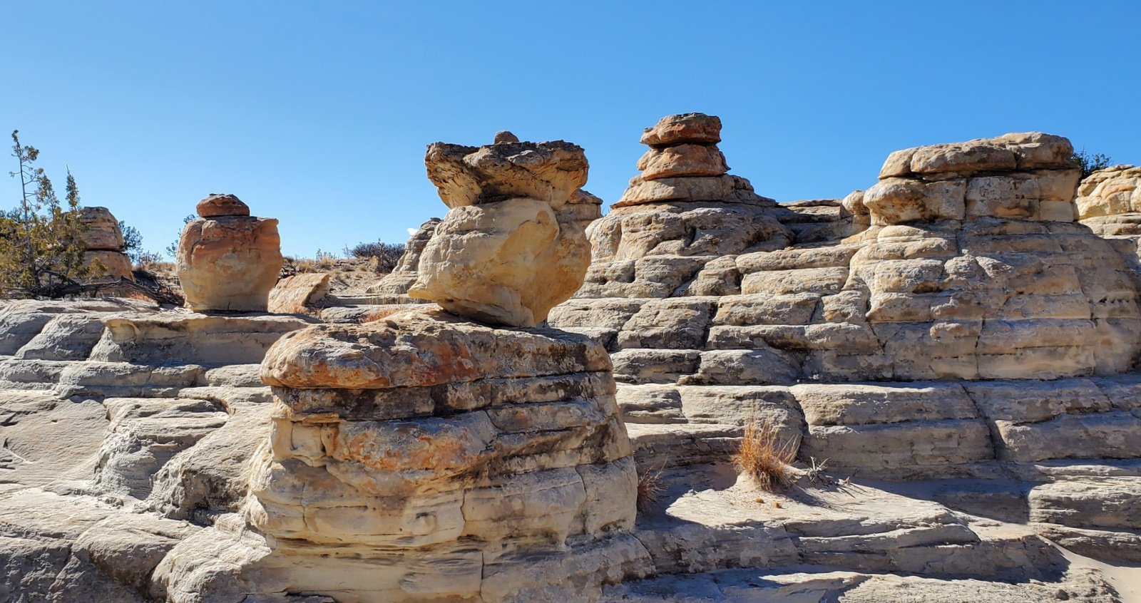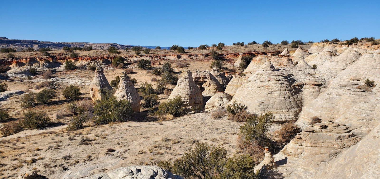 ‘Tis a beautiful place, with such a variety of interesting features – shapes, colors, and more. We’ve enjoyed Goblin Colony, Tent Rocks, Dinosaur Ridge, and mesas around Mesa de Cuba. But this is our favorite. And it is secluded – ‘tho a car was parked near ours when we returned, evidence (and location) suggest that it is rarely visited.