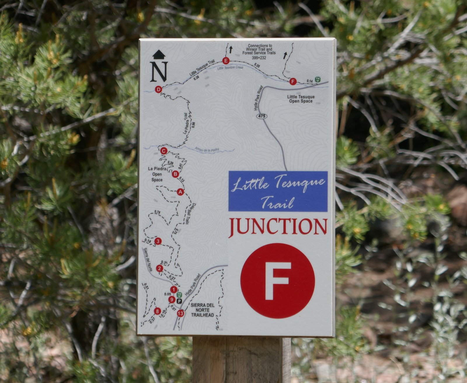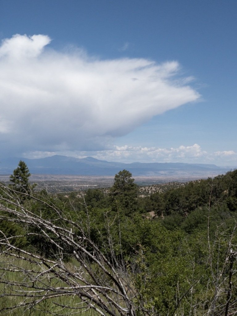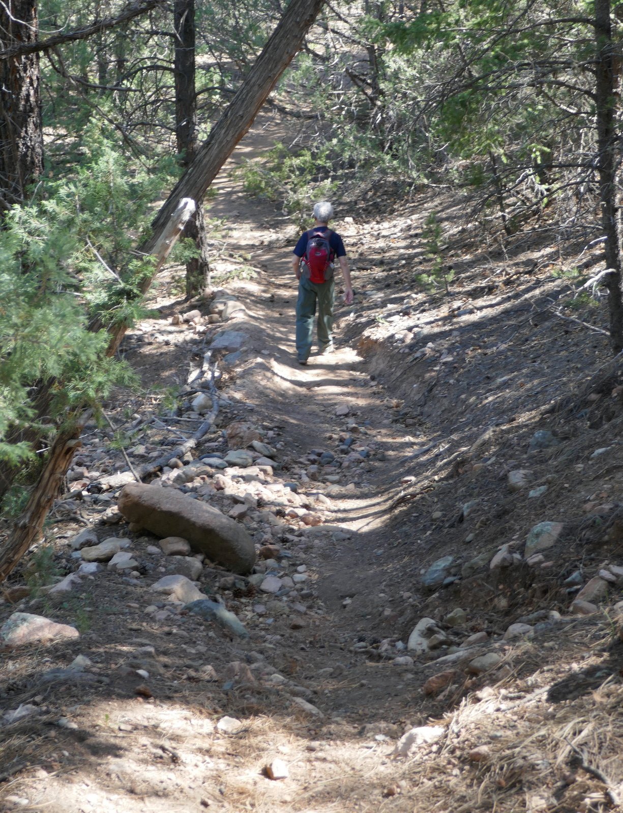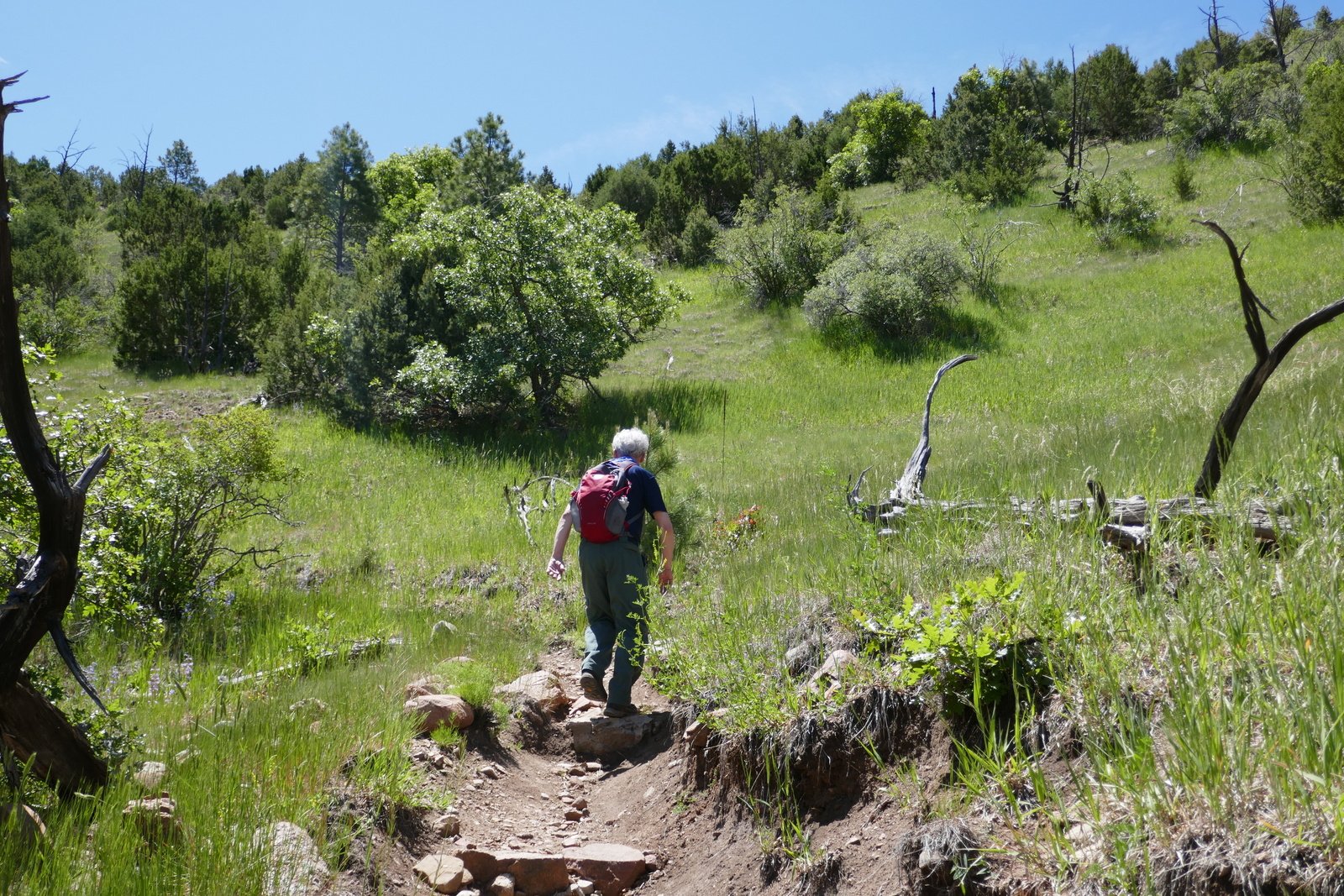 We chose a spot along the fast-flowing Tesuque Creek for our mid-hike break, close to the stream (flowing over rocks: noisy). A few yards up the Creek we turned onto Juan Trail to head back to the trailhead. Juan Trail proceed up (Juan?) Canyon for a mile, then climbs quickly onto a ridge. From there it descends gently back to it’s junction with the Little Tesuque Trail/Creek; from there proceed upstream to the trailhead on Hyde Park Road.