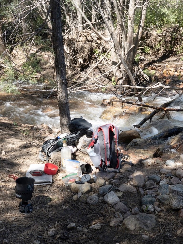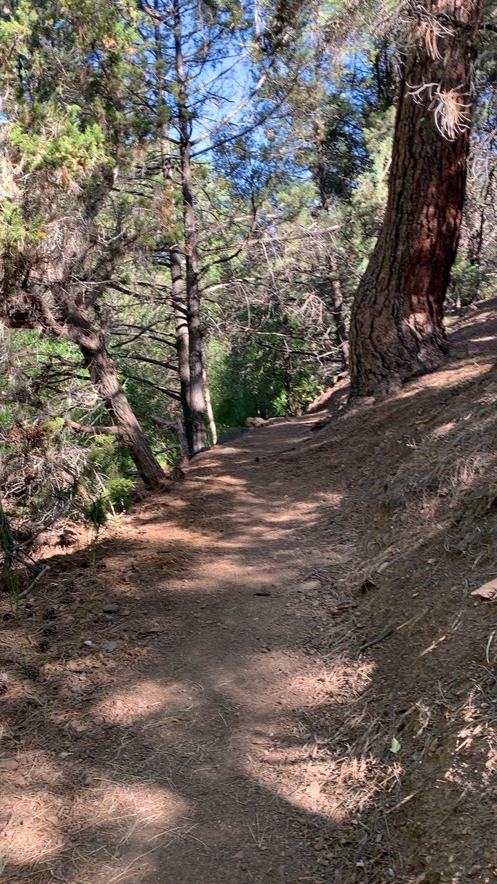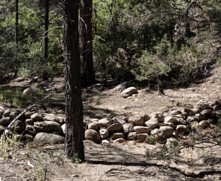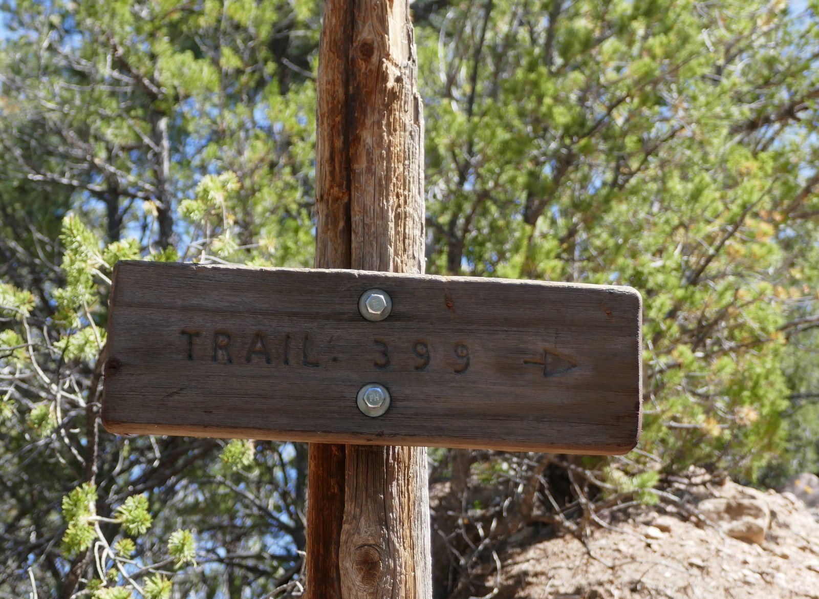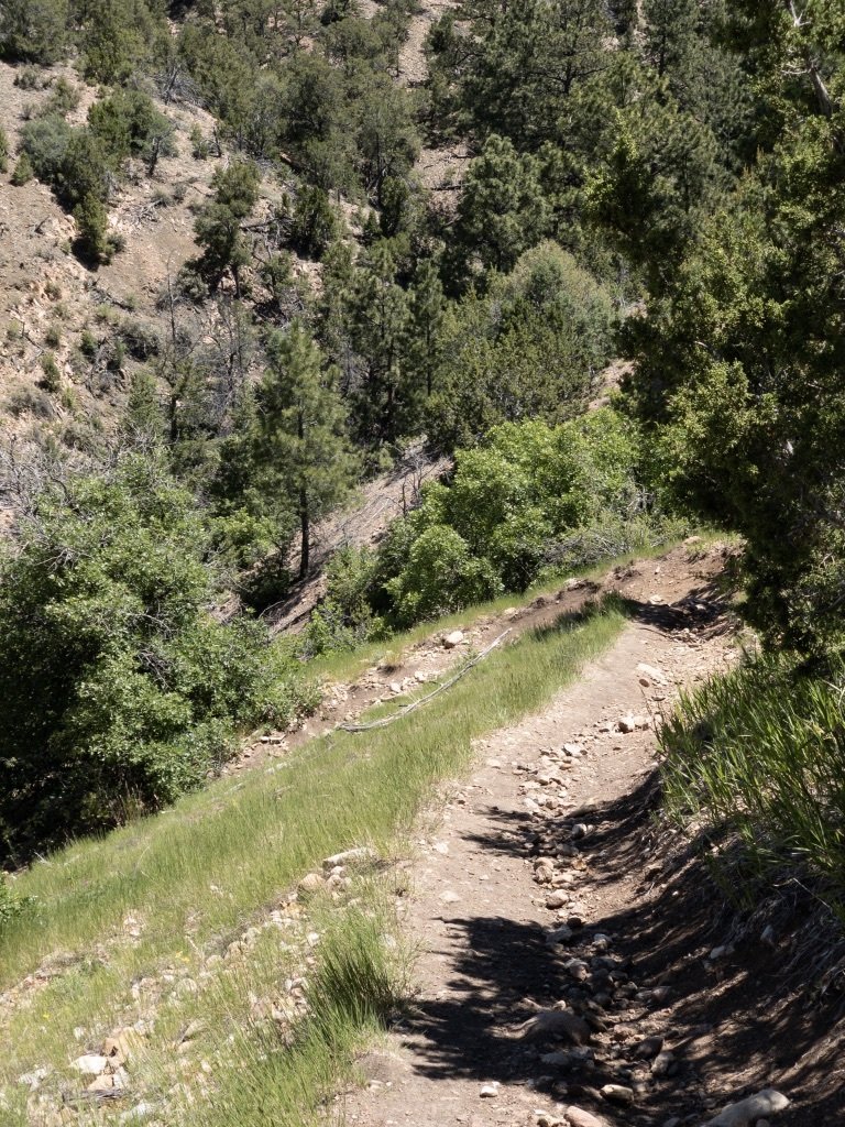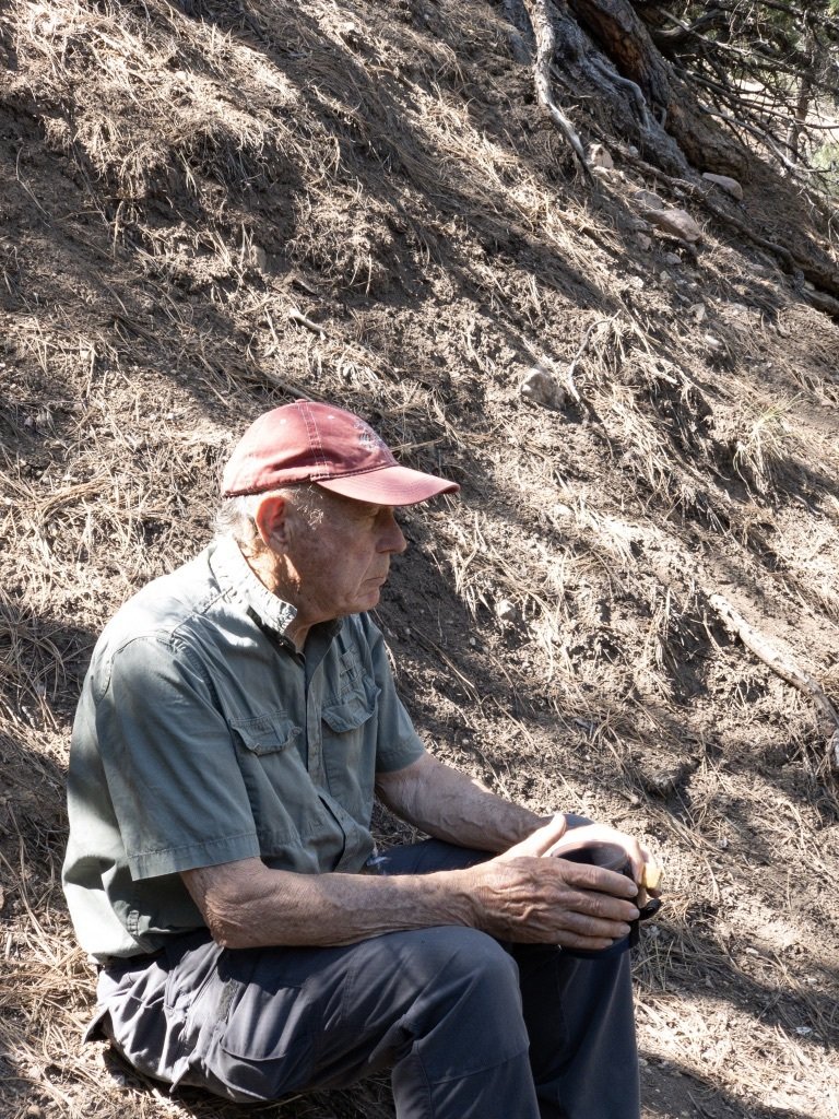 We chose a spot along the fast-flowing Tesuque Creek for our mid-hike break, close to the stream (flowing over rocks: noisy). A few yards up the Creek we turned onto Juan Trail to head back to the trailhead. Juan Trail proceed up (Juan?) Canyon for a mile, then climbs quickly onto a ridge. From there it descends gently back to it’s junction with the Little Tesuque Trail/Creek; from there proceed upstream to the trailhead on Hyde Park Road.