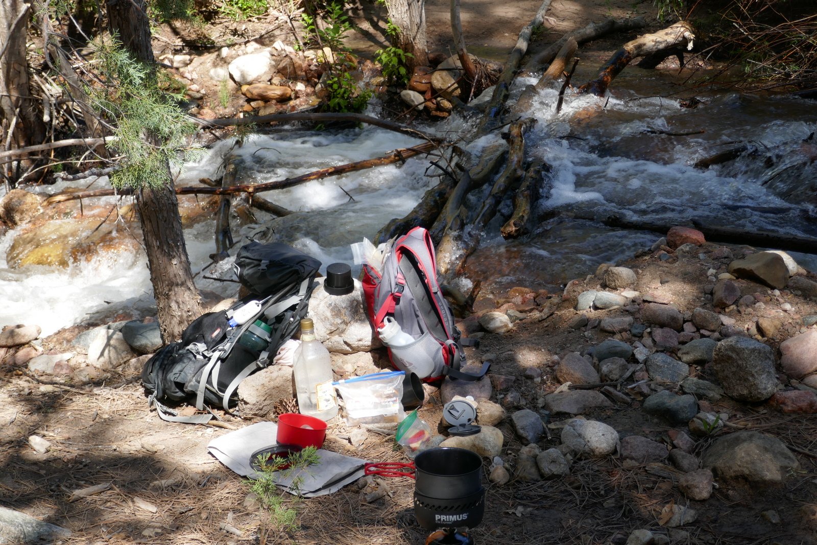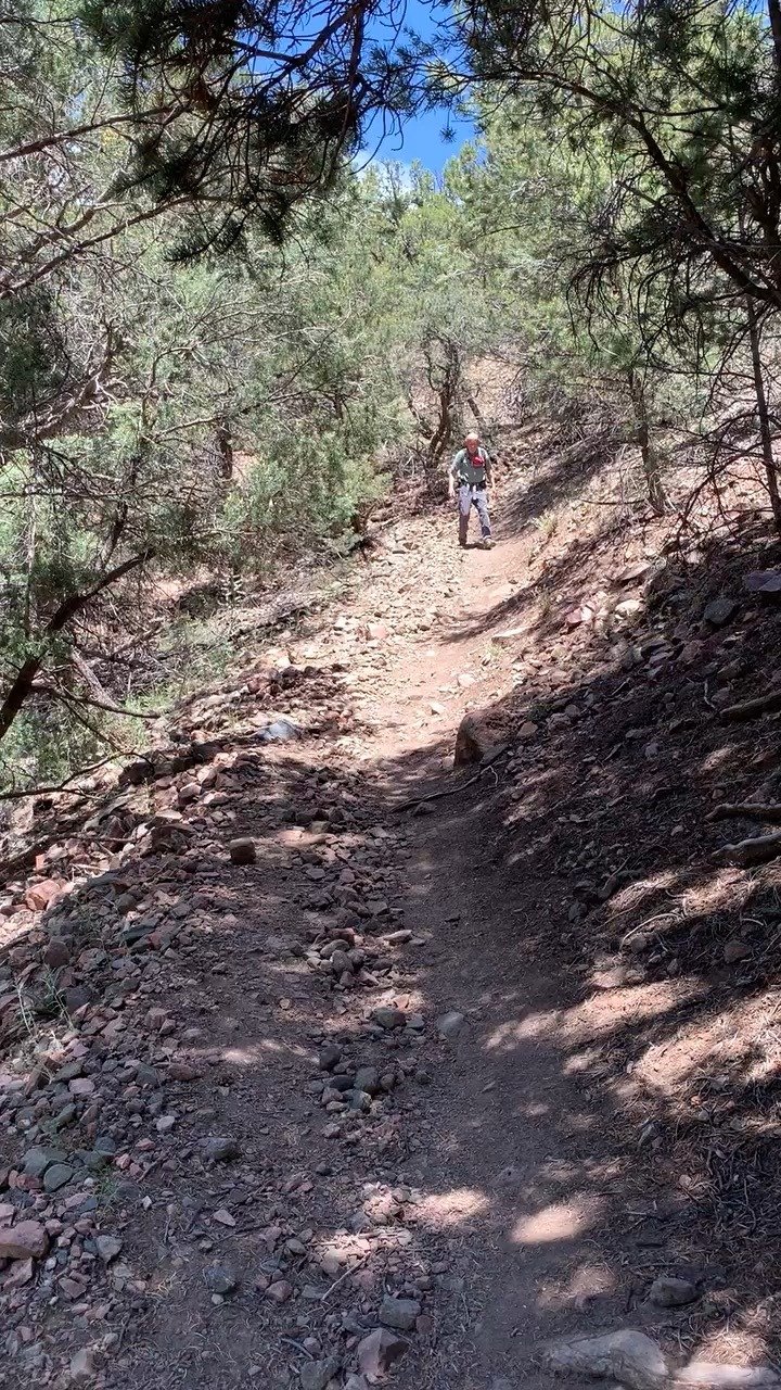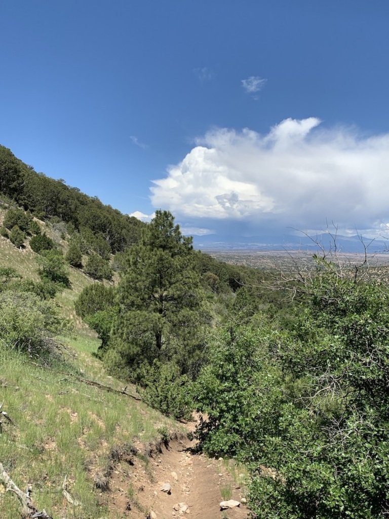 This is one of many really great hikes near Santa Fe. Four miles, 600 ft elevation (‘tho more than 1000 feet ups/downs), two creeks offering shade. Better to go early in the day because some of the trail is on ridgetops where the sun will make it feel hot. Enjoy.