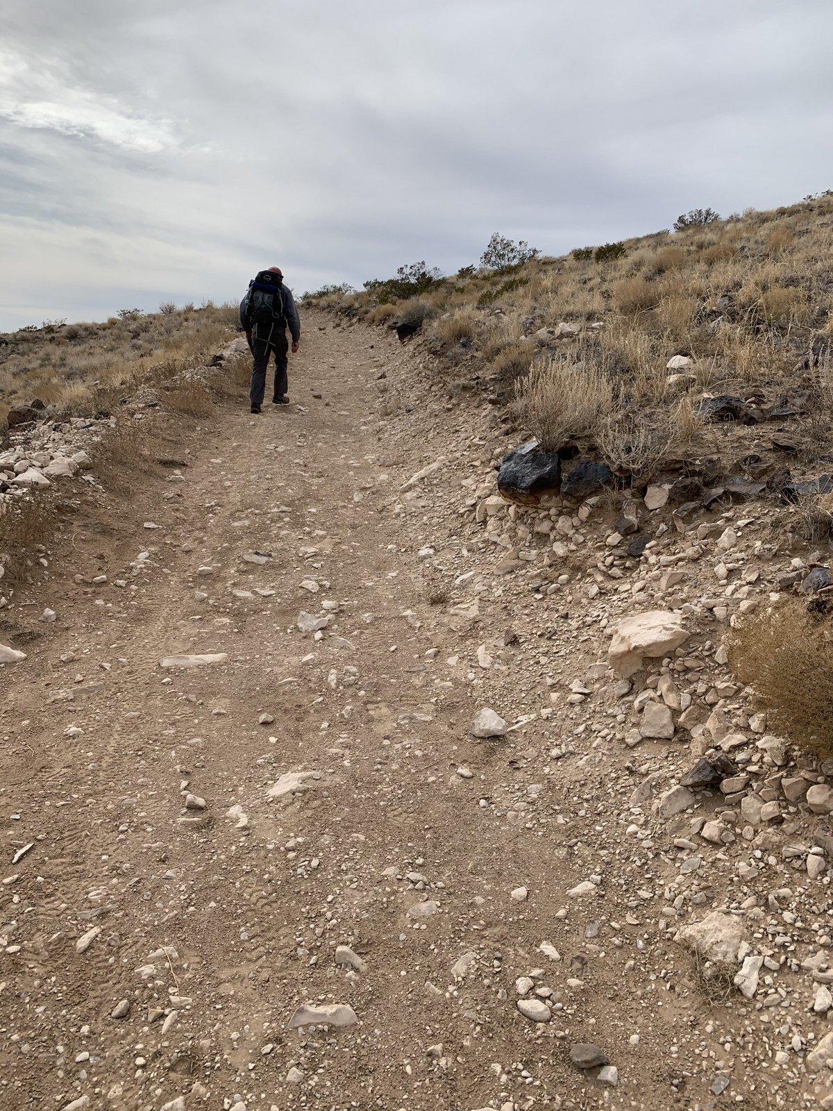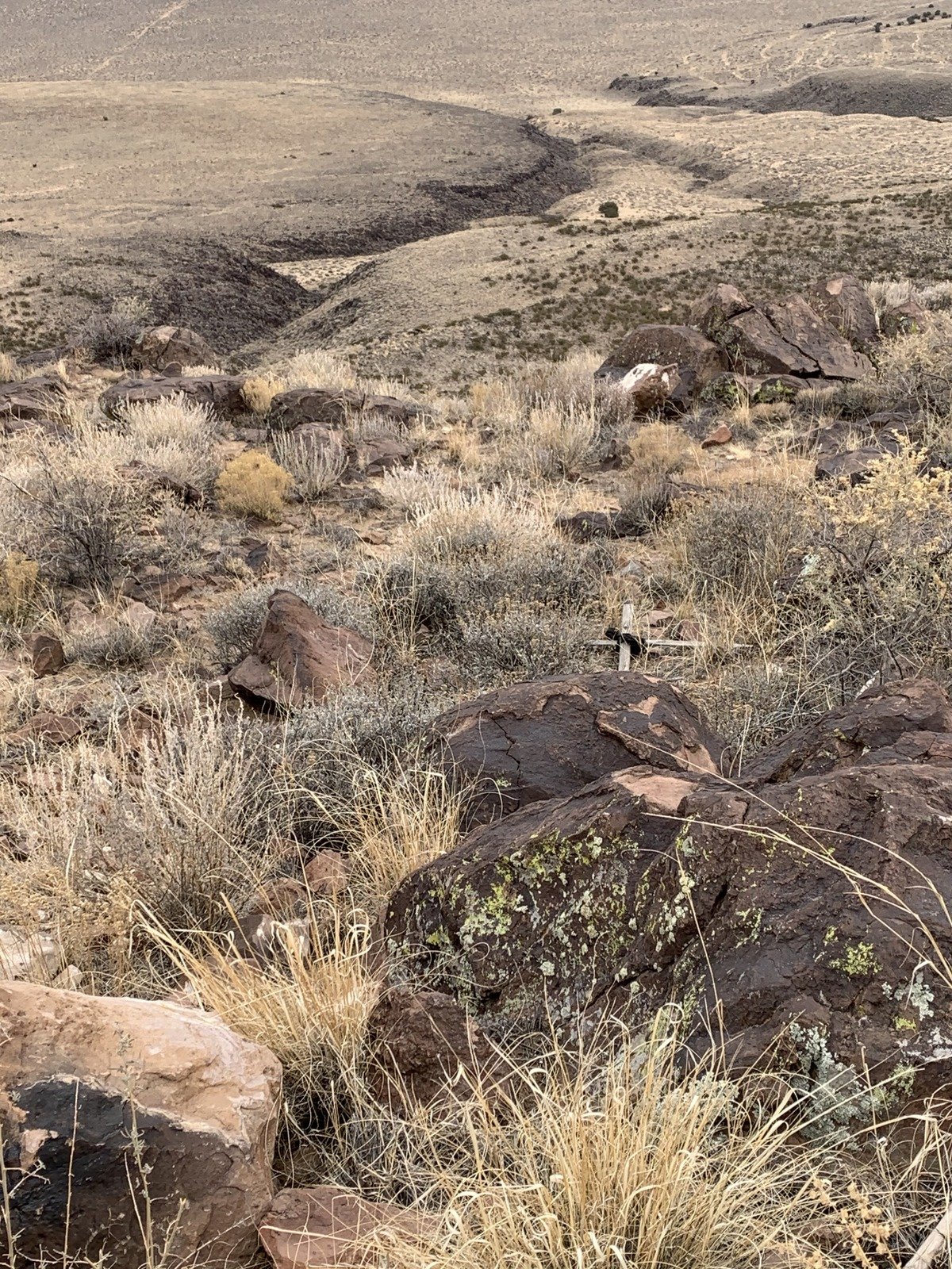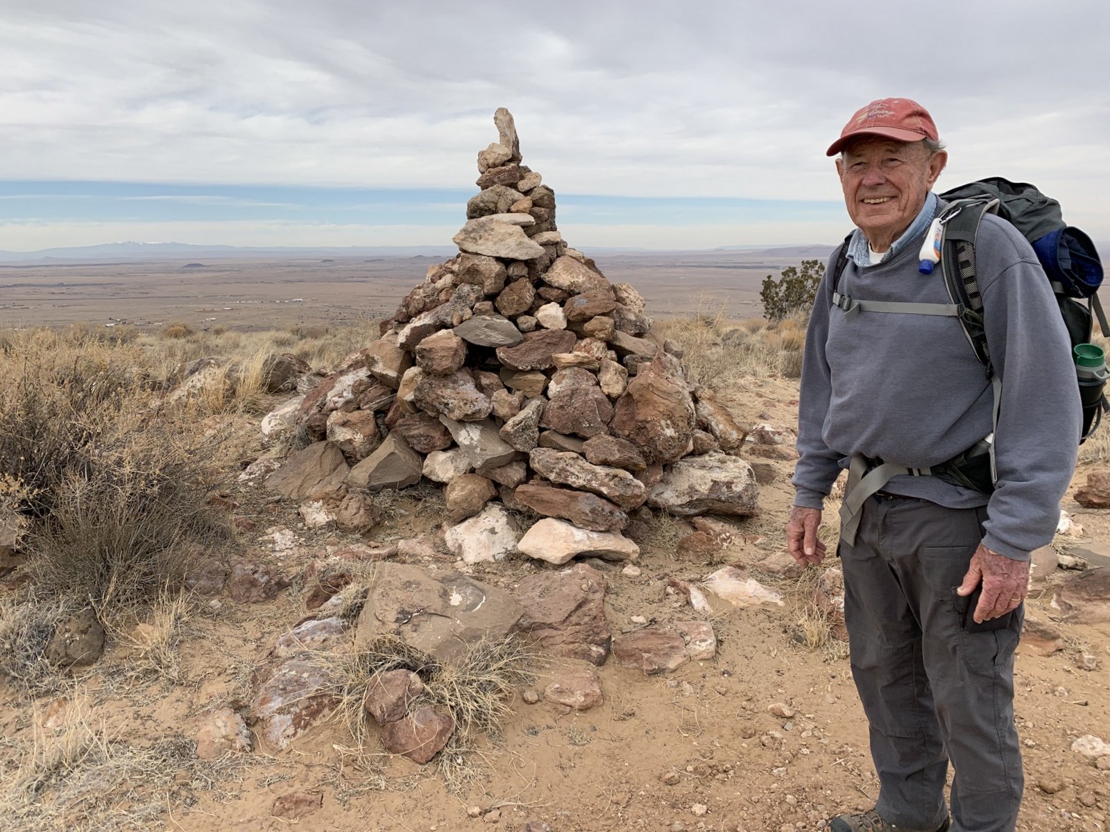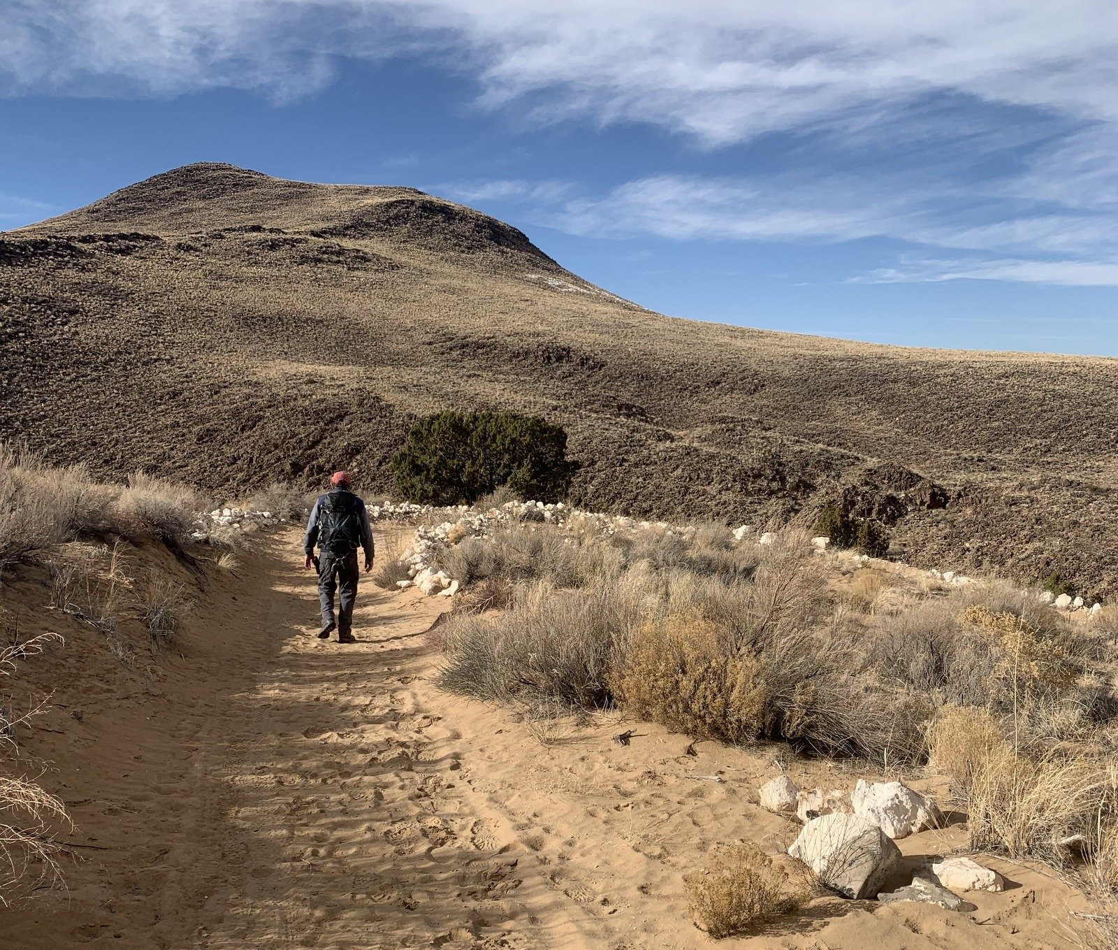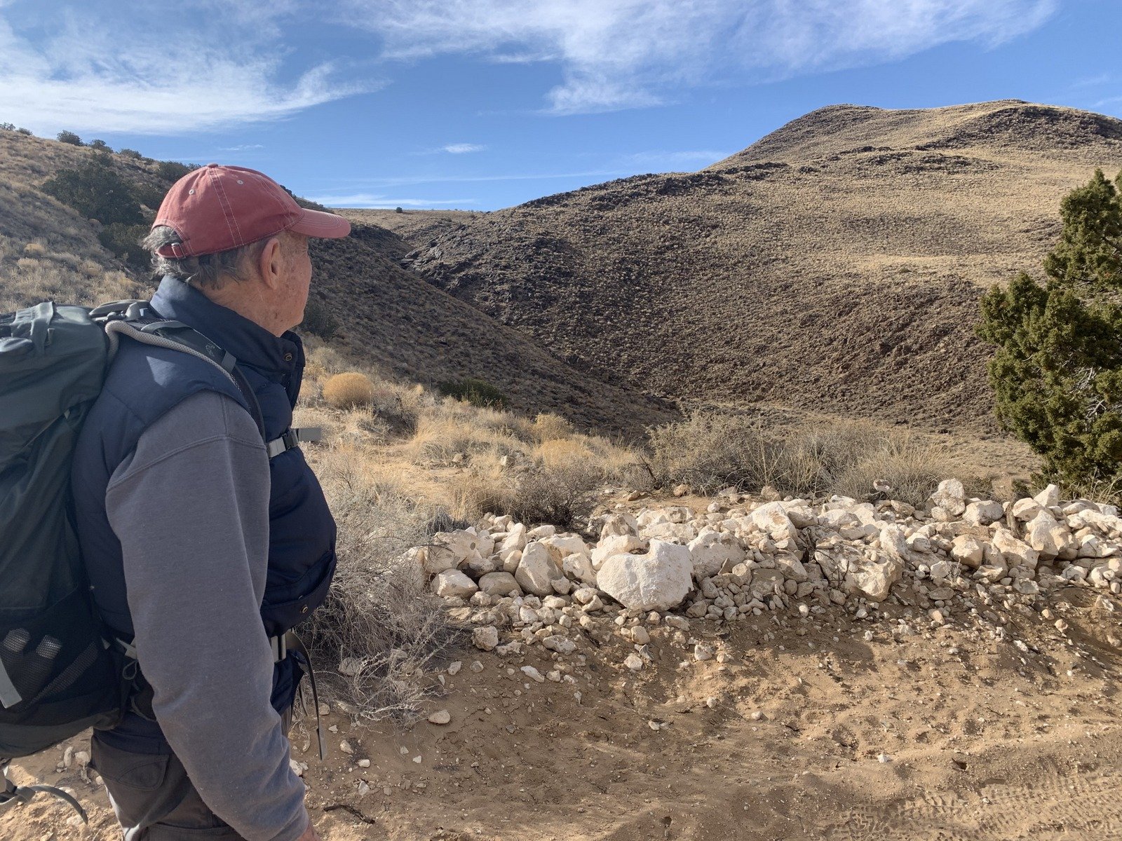 We topped out on El Cerro de Los Lunas, discovering a tall rock cairn marking the spot. The weather this day was a bit chilly and windy, not the most common conditions for New Mexico, so we didn’t dally long. On the return, at a ‘Y’ in the trail we bore to the left which turned out to be a bit shorter route than on the way up. We found along the way enough of a juniper to shelter us from the wind, where we had our mid-hike break.