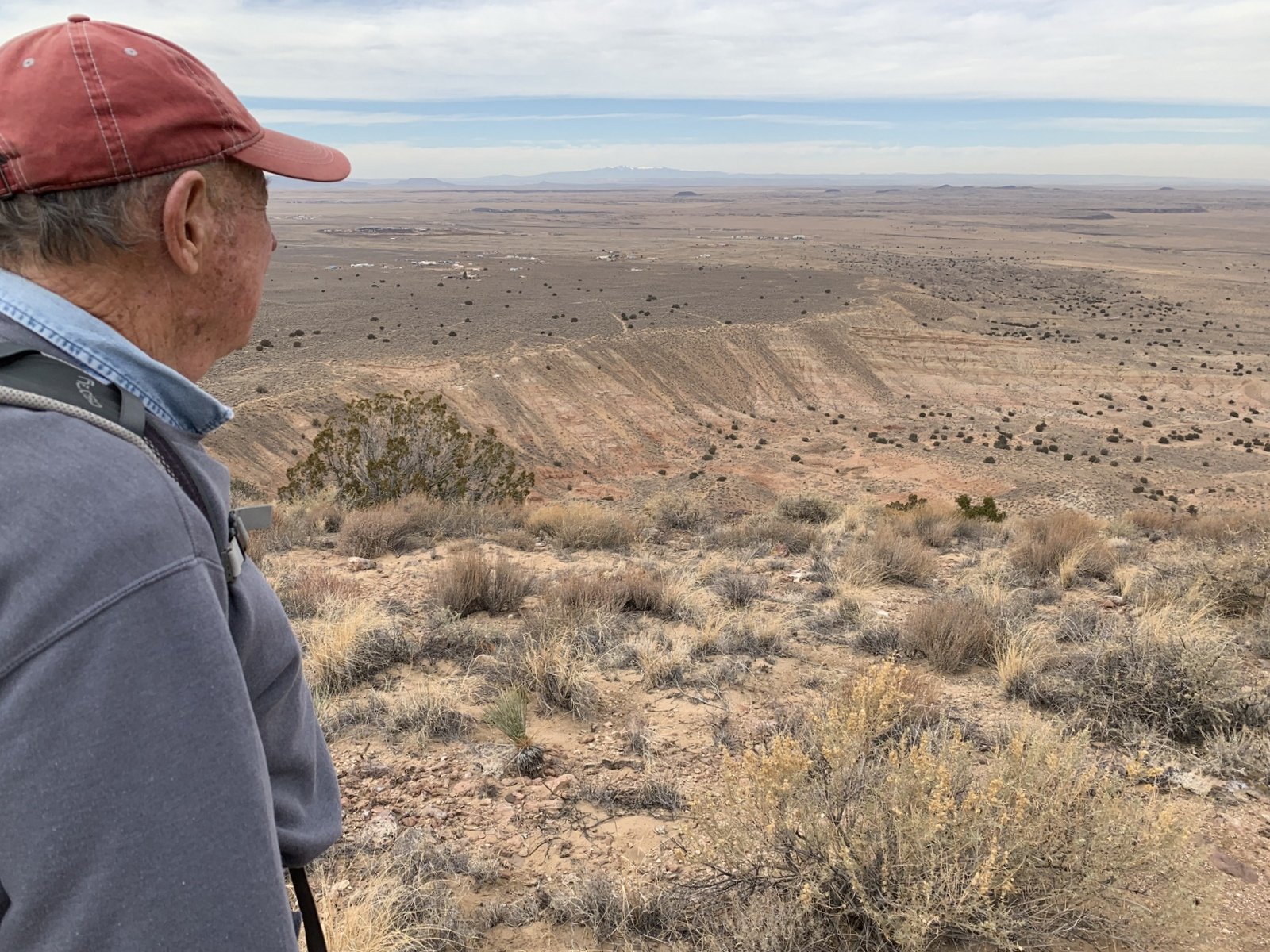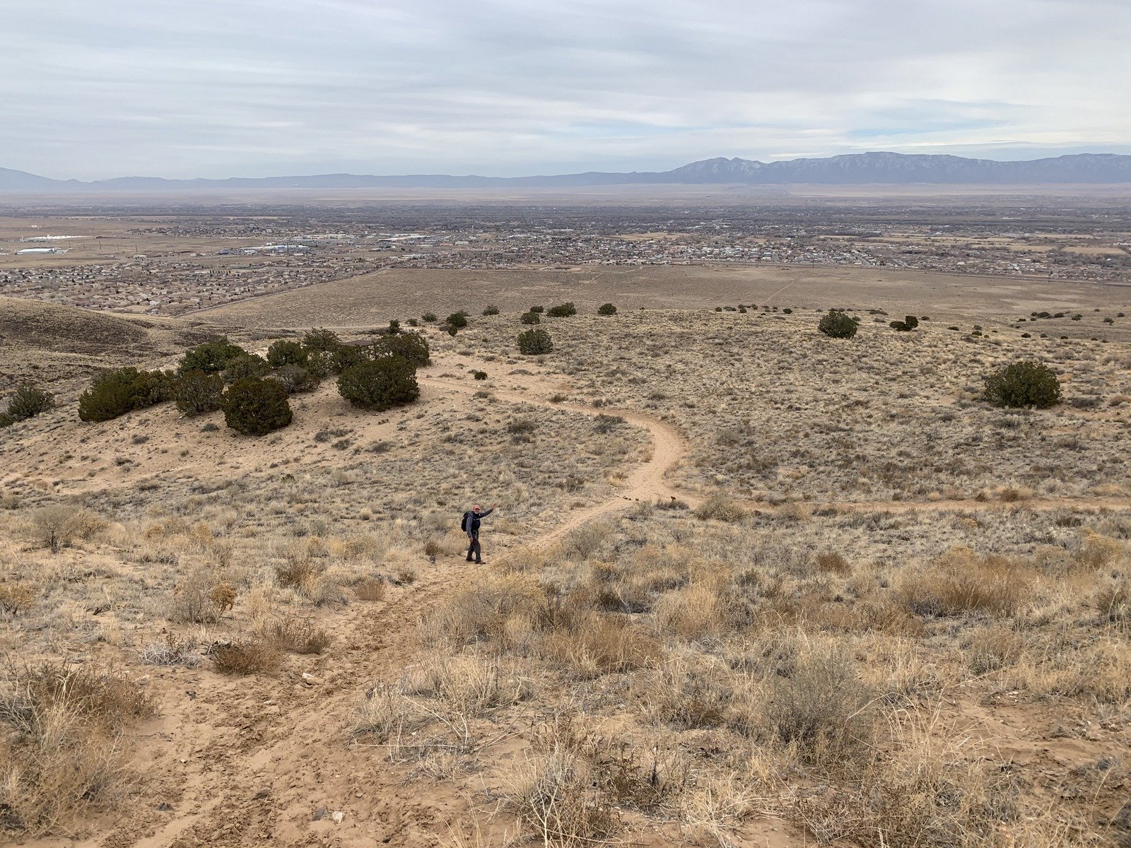 Our hike began with a steep descent into an arroyo, then a steep climb up a very sandy trail. From there it was a steady climb on a sometimes rocky trail. And this trail is exposed with no cover, no juniper, a few cholla. The views are great, northeast to the Sandias, north to the Jemez, east across the Rio Grande valley to the Manzanos, and west across the Isleta Indian Reservation and beyond the Rio Puerco valley and Mount Taylor in the distance.