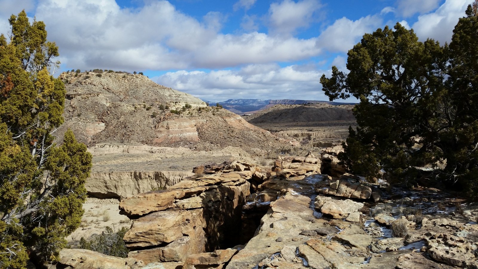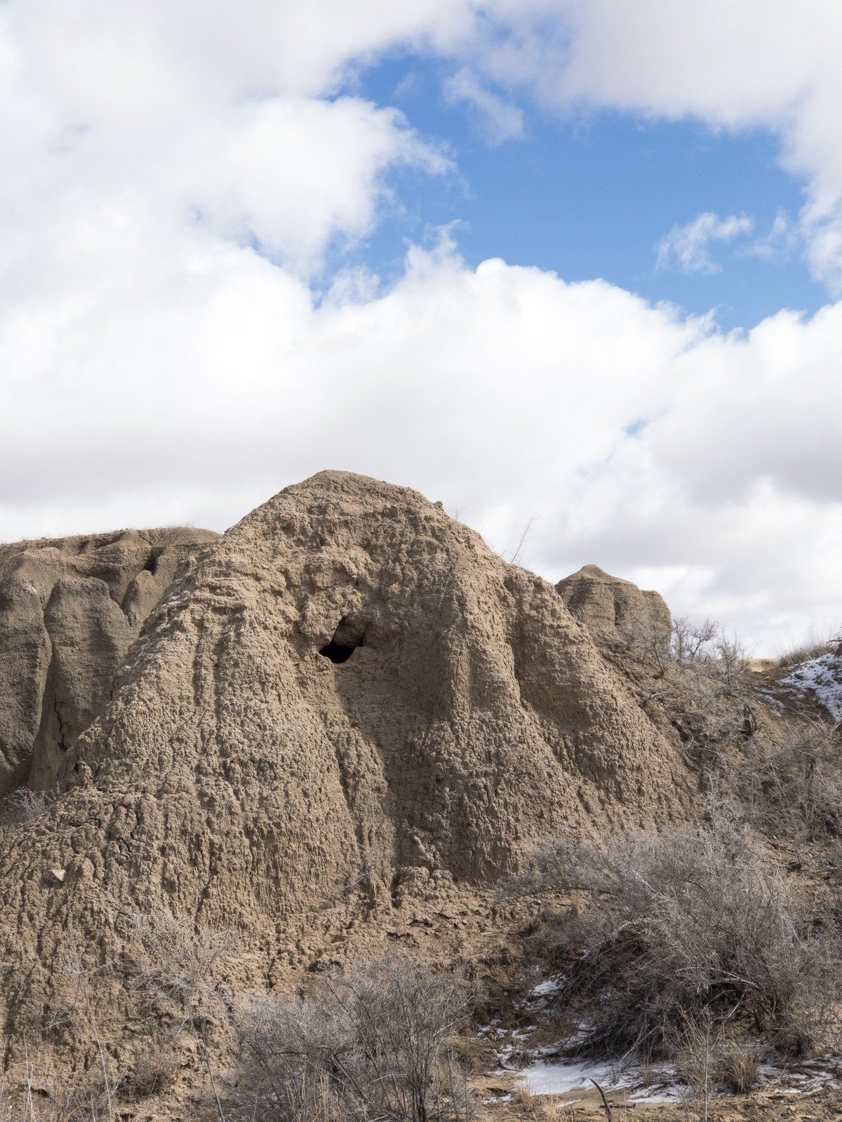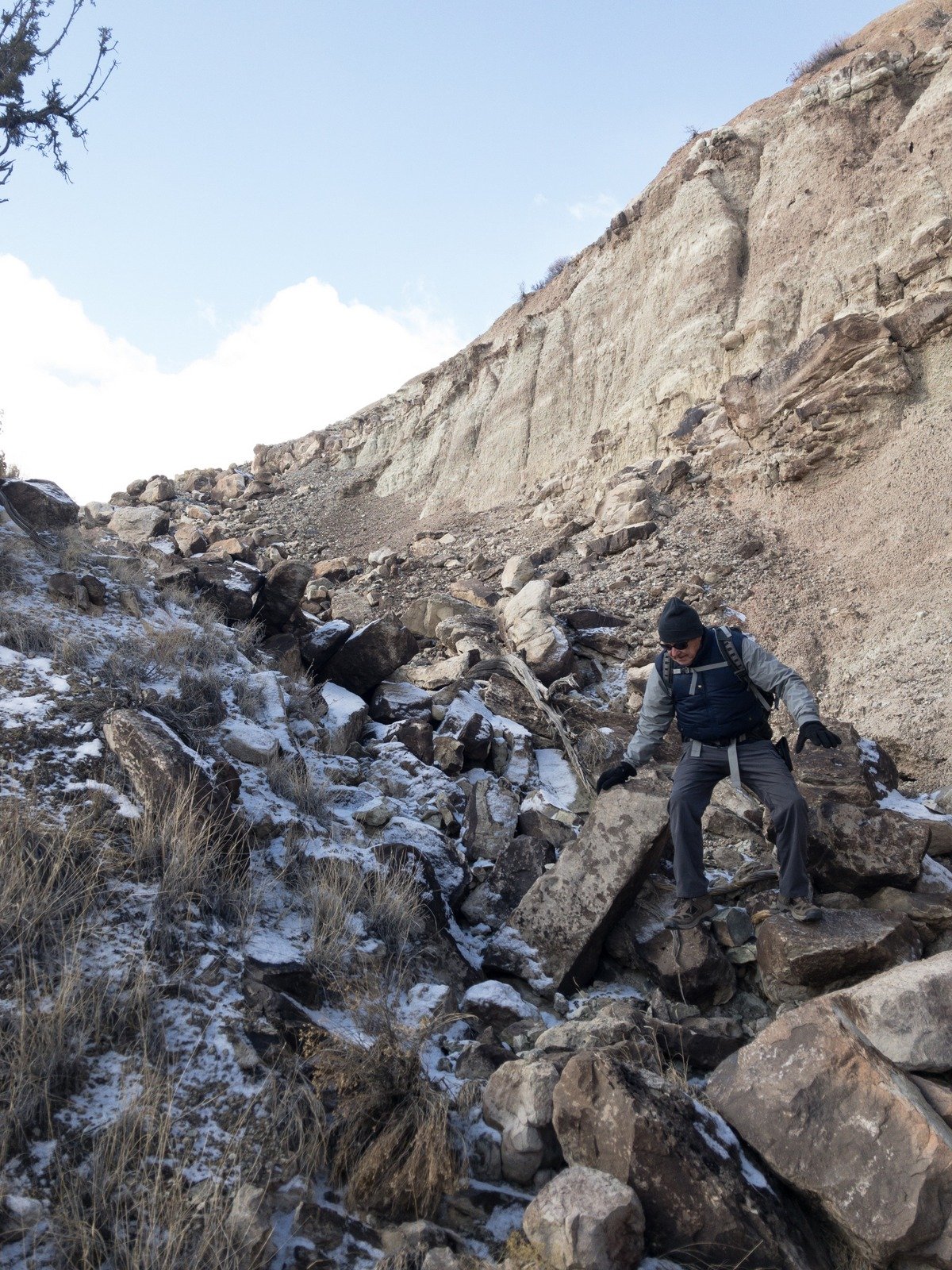 As expected, we began the hike with wind and 38 degrees. We soon were in the lee of the mesa which protected us somewhat from the wind. We then faced the first of two rocky descents in narrow clefts in the terrain – not great distances but required extra care on the rocks, some of which were covered with a dusting of snow.