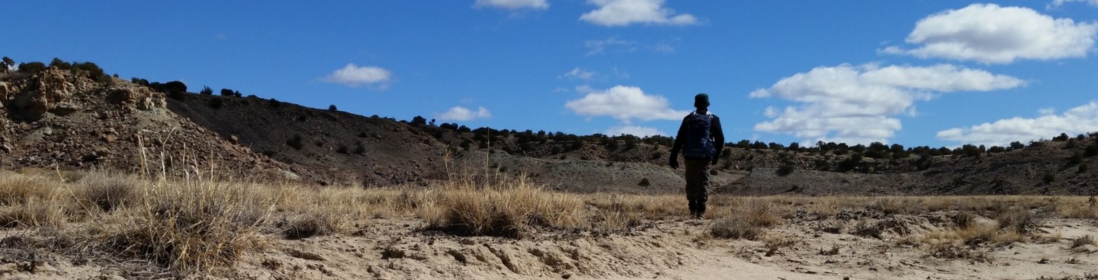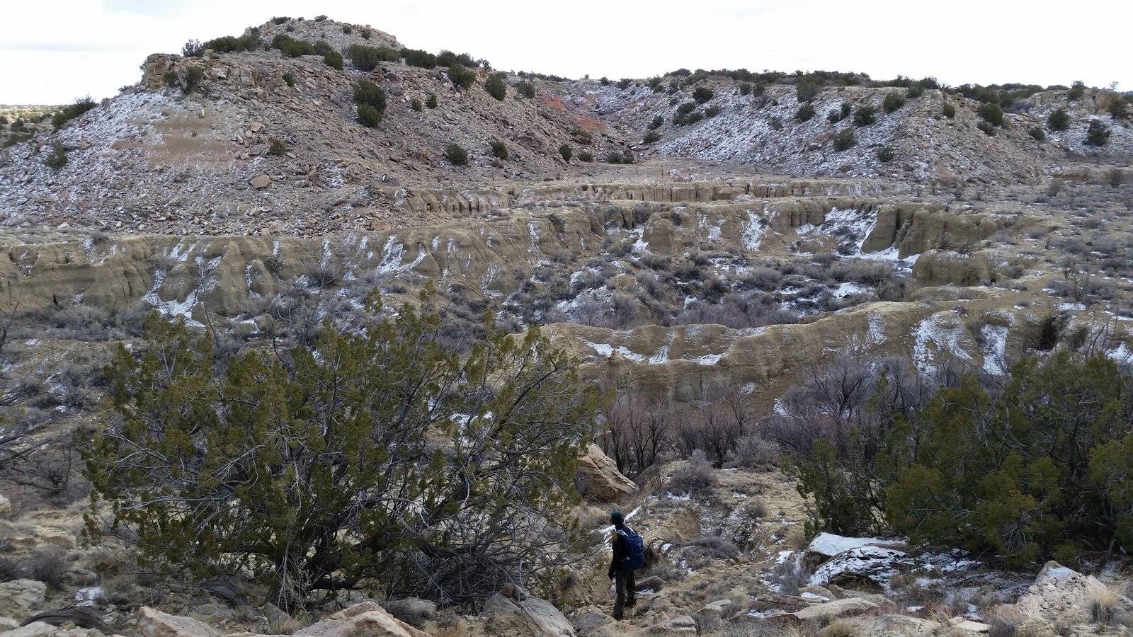 On this hike we set out to simply explore sections of the Ojito Wilderness that we had not yet visited. Since the weather was to be cold and windy, I set out to plan a hike that stayed in canyons and arroyos, steering clear of open territory like mesa tops. Using GoogleEarth and the Earth Point Topo Map overlay, I sketched a track that circumscribed a mesa (one that we had hiked before, Dinosaur Dig).