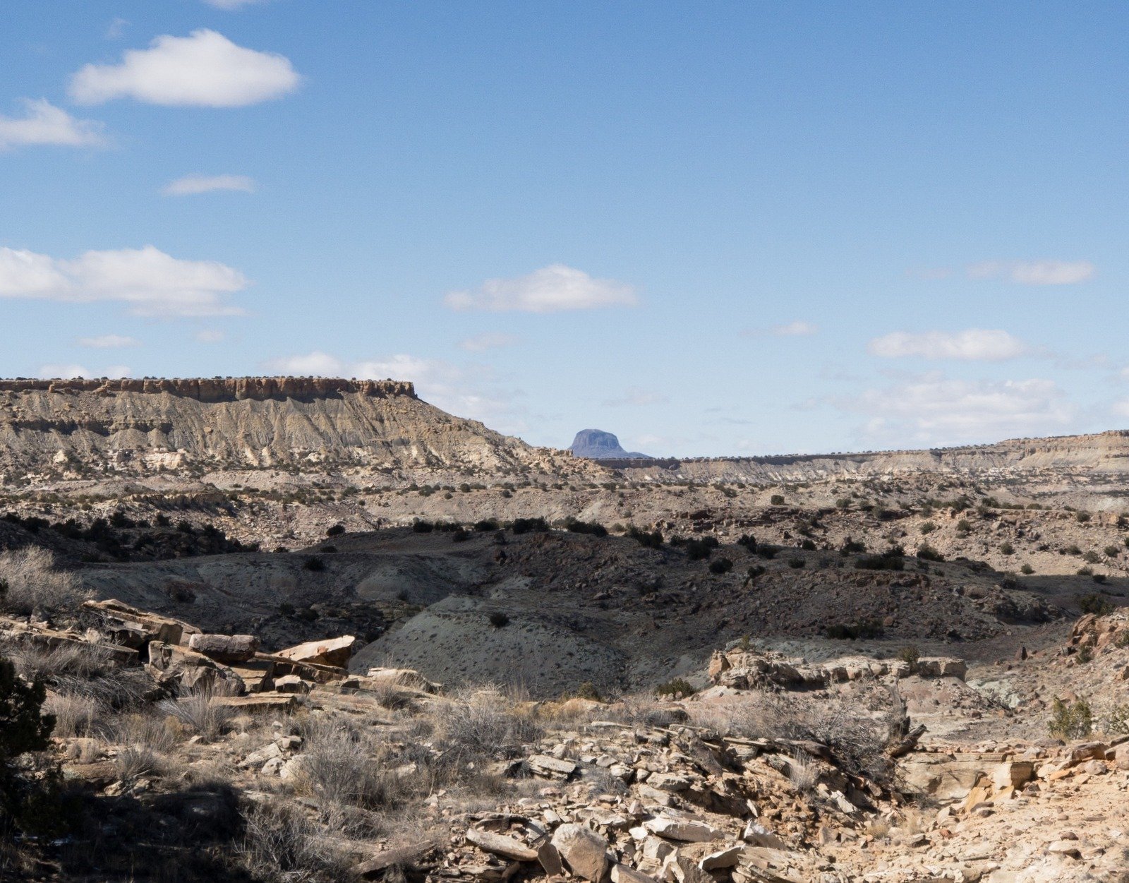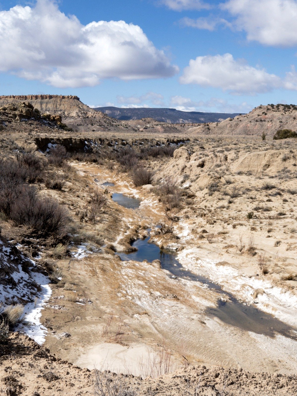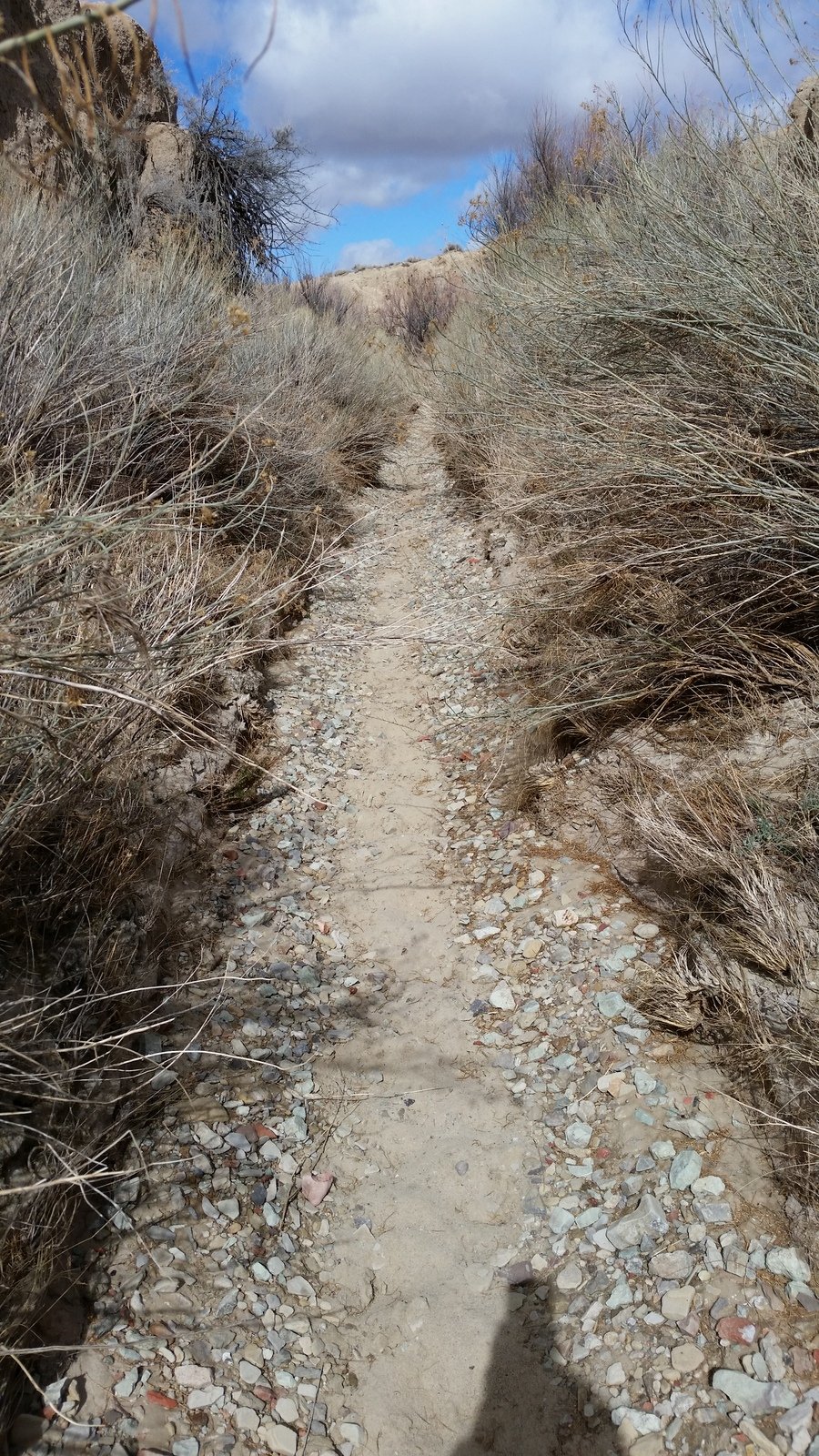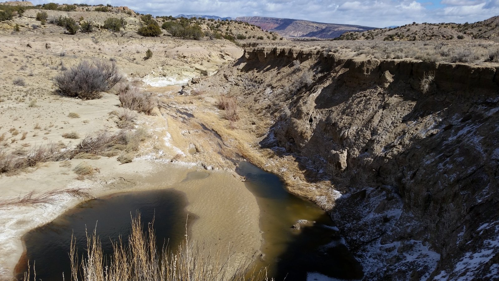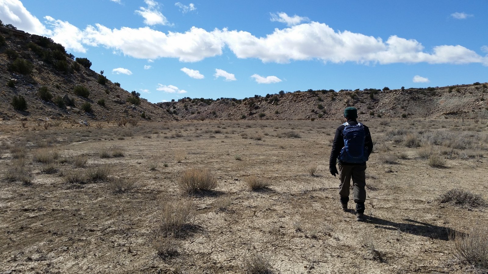 About .8 mile into the hike we found ourselves looking down into deep washed-out arroyos with vertical walls 10′, maybe 15′ in height. Skirting the first one, we found ourselves in the between such arroyos. It seemed our only way to the north side of the mesa was to get down into the arroyo (and hope we could get back out of it downstream). Looking into the depths, I noticed .. cow paths. Figuring they know their way around, we took up tracking these paths. Sure enough, we found a way down into and back out of the arroyo.