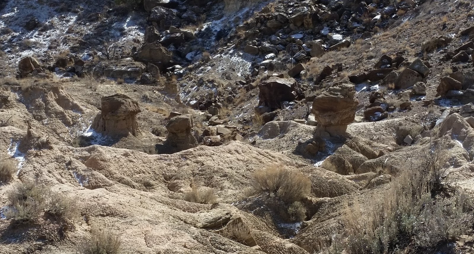 (A note: One can become disoriented in this land that could be described as trackless. We have a plan for these outings, we bring a GPS cellphone/tablet with our intended track, and we use the GPS to follow our progress and at times for directions along the track and, of course, guidance back to the truck.)
