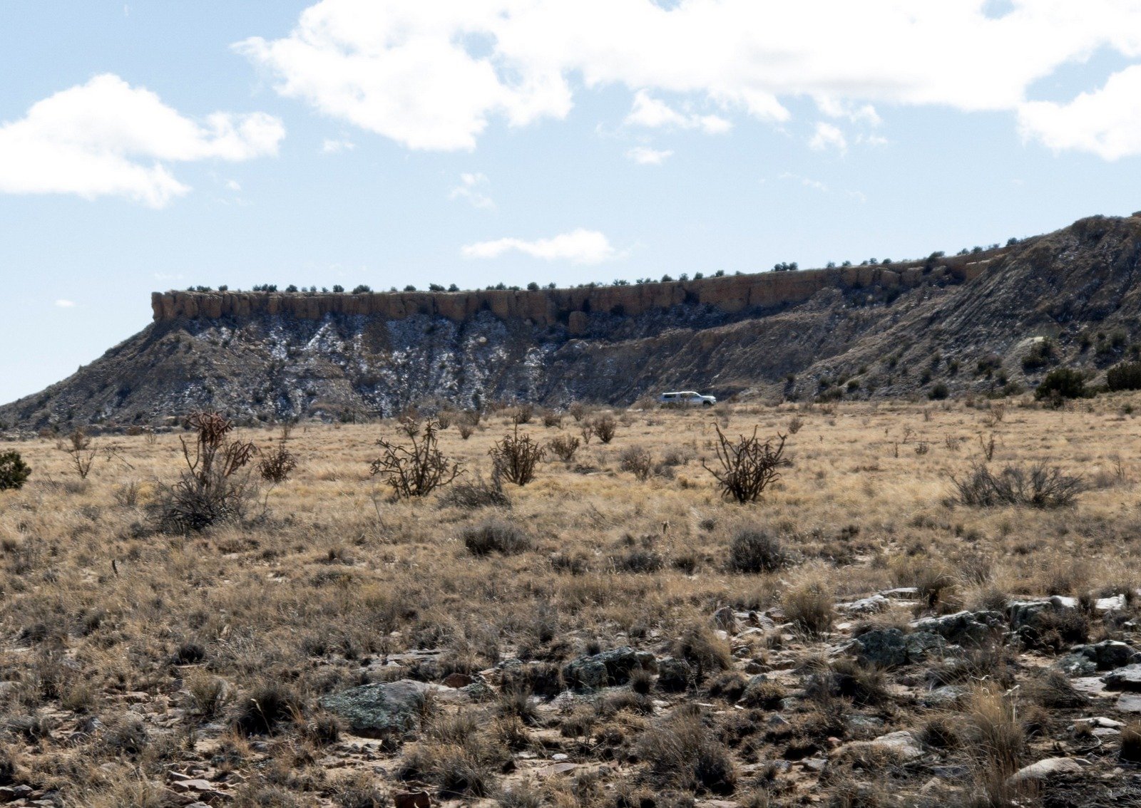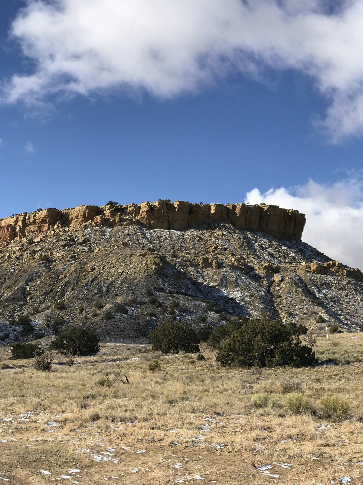 Having come abreast the north side of the mesa, we headed west across open space. This also happened to follow Arroyo La Jara which has a fairly large watershed, and in which there was a stretch of standing water and ponds. Before turning south to complete the circumnavigation, we stopped for the mid-hike break in the lee of a rock outcropping with a few juniper trees. Try as we might, we did not find a spot that was totally out of the wind – oh well, time for coffee, snacks, and a bit of whiskey to really warm us.
