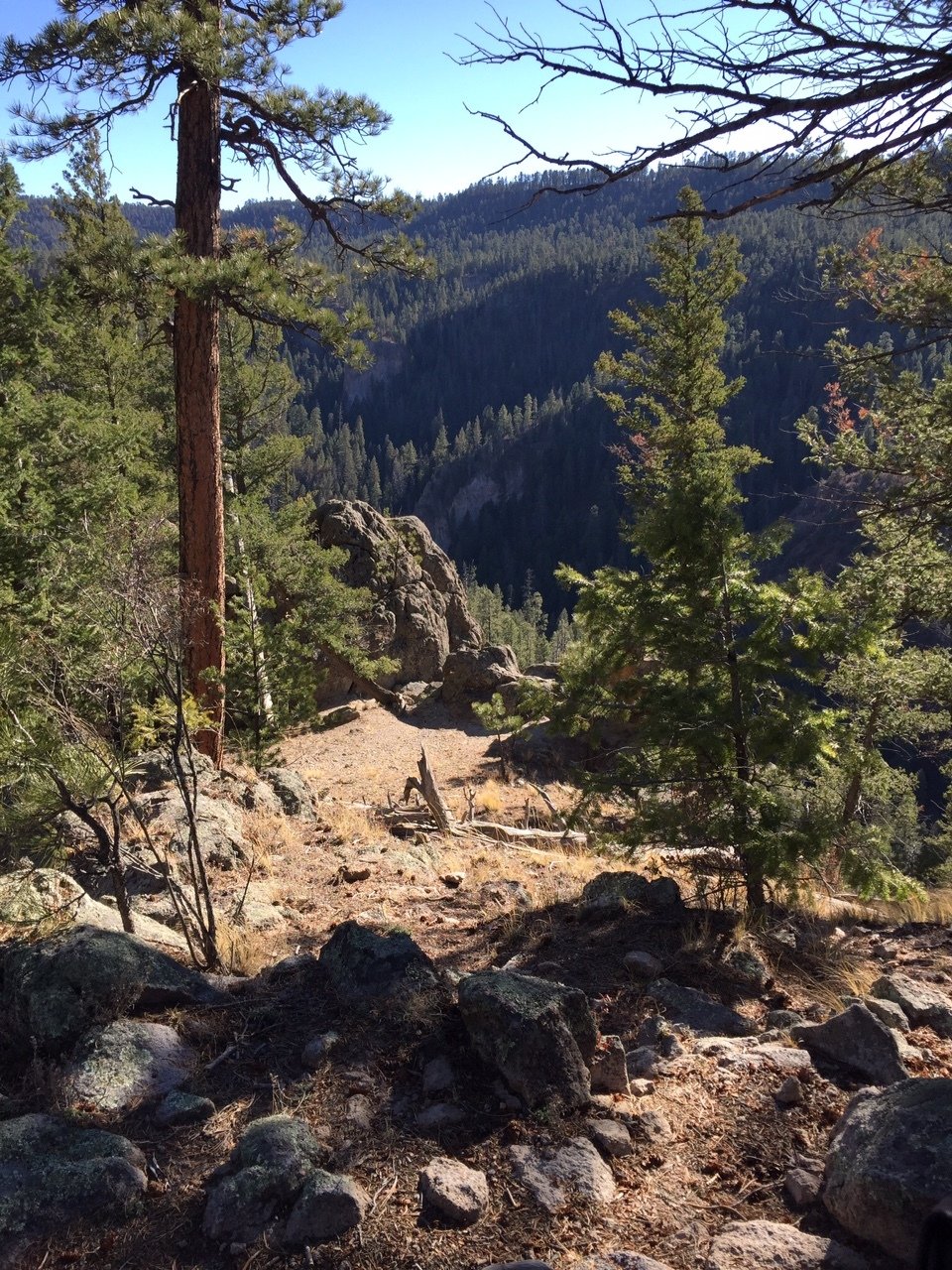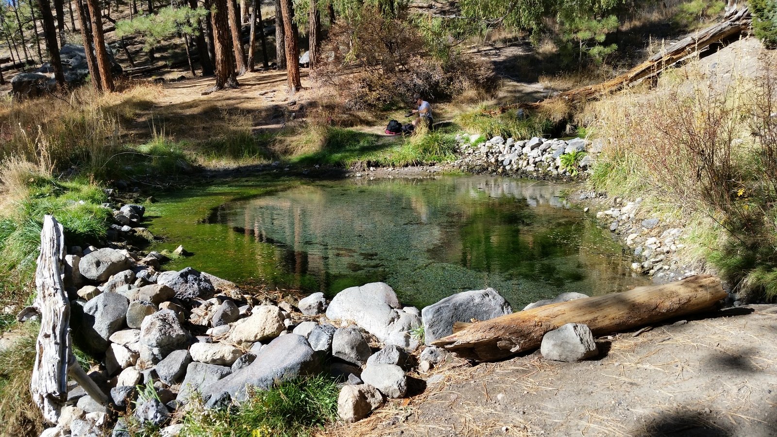 The trail is easy to follow, seems to be well used. The first half mile is easy, a clean trail with little elevation change. It then starts a descent into the Jemez River canyon with stretches of the trail that are quite rocky. About 1.25 miles on, the trail generally follows a topo line, descends a bit more to enter the short side canyon in which the Spring resides. To reach the springs and 3 pools, one must bear to the right and climb up this side canyon .2 miles or so. (We were tempted by what appeared to be a well-used trail that bore a bit off to the left, but noticed a log had been placed across it, a common signal that -this- is not the/a trail.)