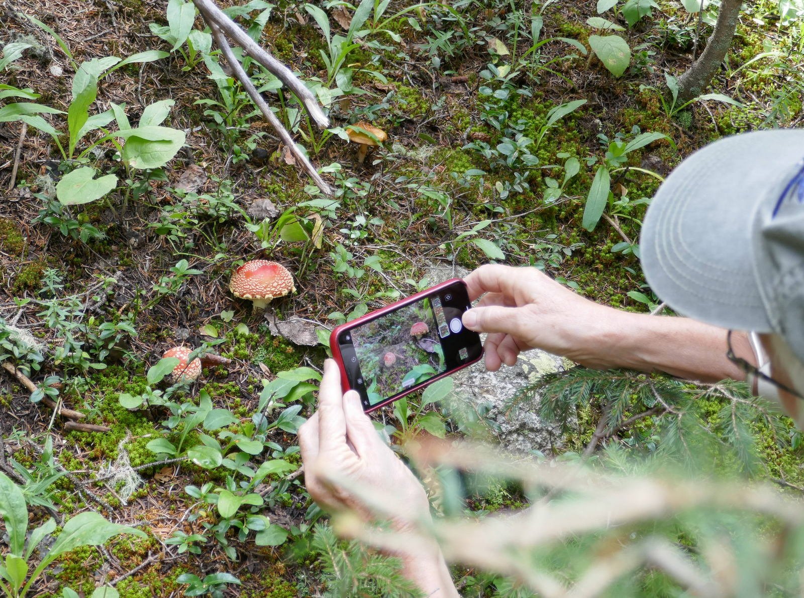 grasses, shrubs, ferns, flowers, mosses, mushrooms, and healthy ponderosa and douglas fir, many with spanish moss hanging from their branches. And the goal, the Lake, adds a very nice reward for the 1,229 ft climb and makes a most pleasant setting for our mid-hike break (which with Pat’s preparations has become more of a light lunch – a large cup of raman, PB&J sandwiches, and coffee).