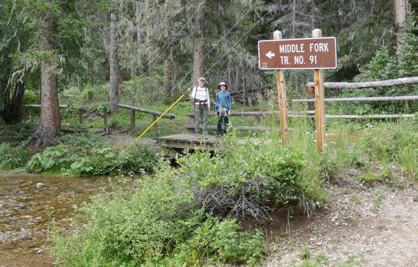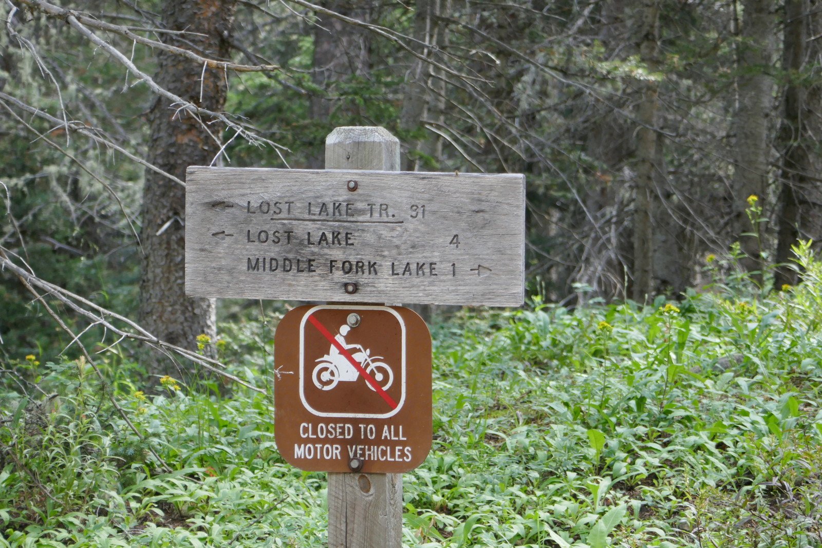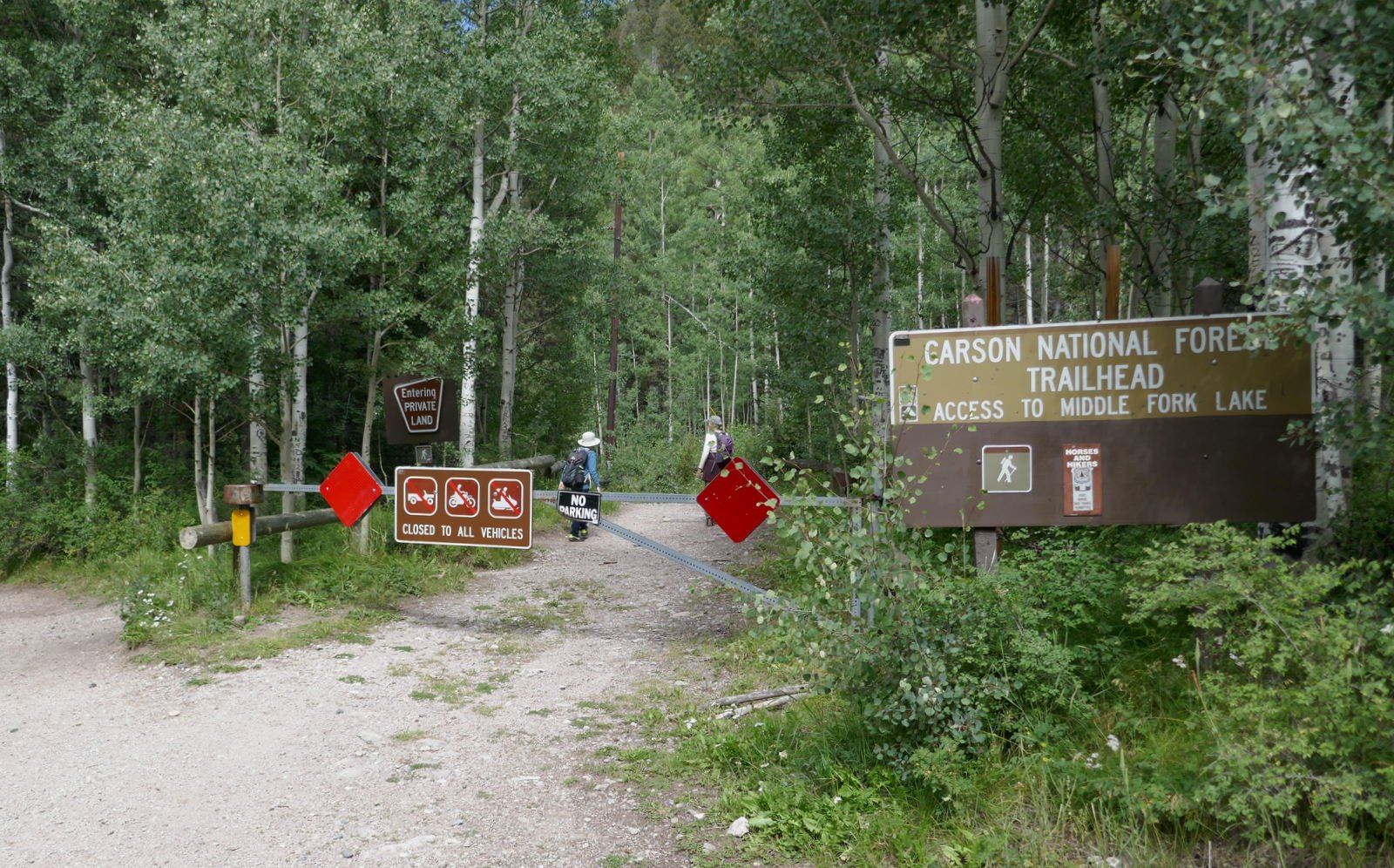 There are signs and a gate announcing the trail, “Access to Middle Fork Lake”. The trail is a two track (now closed to vehicle traffic) that makes for easy walking.