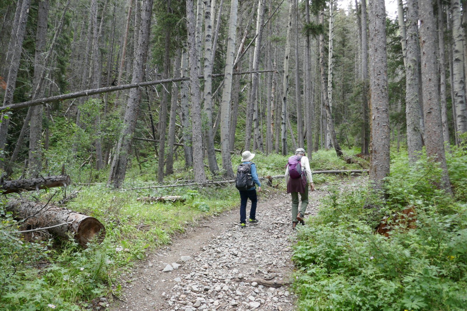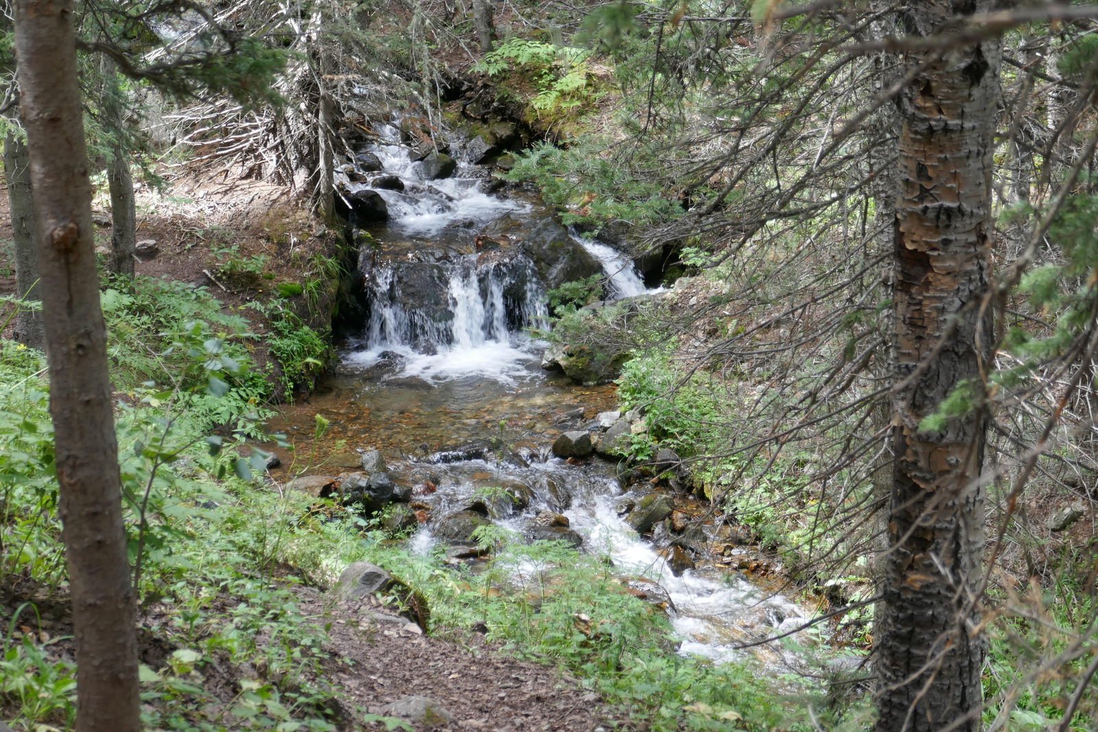 After making the bridgeless crossing, the trail departs the river canyon and heads uphill, not too steep but the trail has to make another 700 ft gain in that last 1 mile (10,186 ft elevation to 10,849 ft). Along the trail is very nice forest: