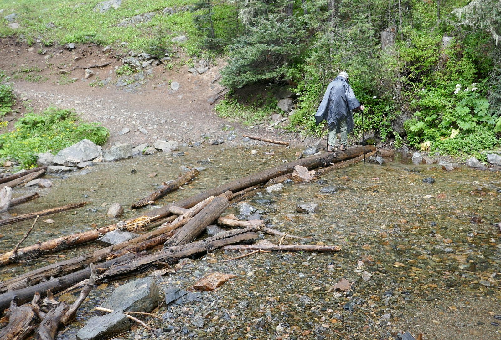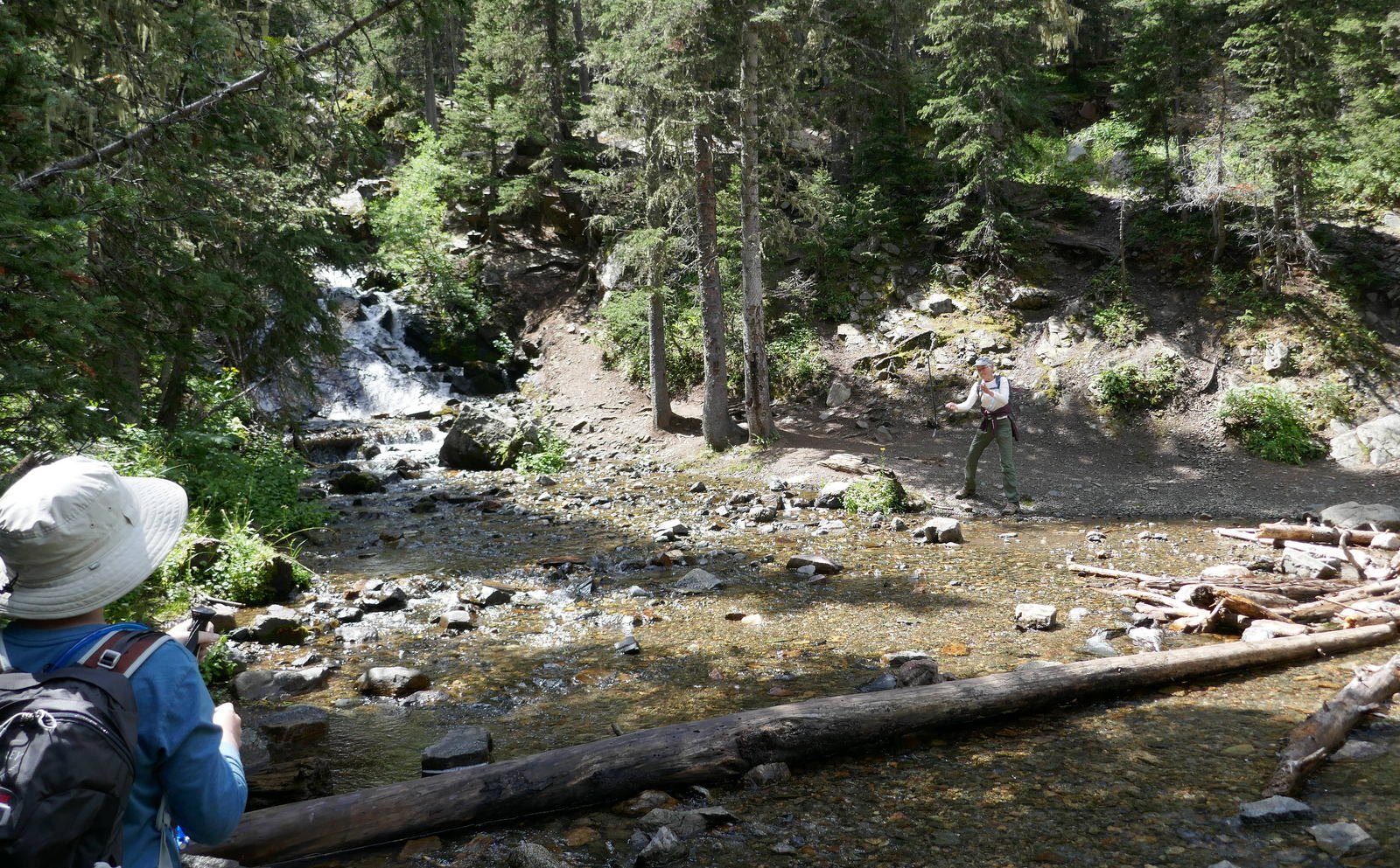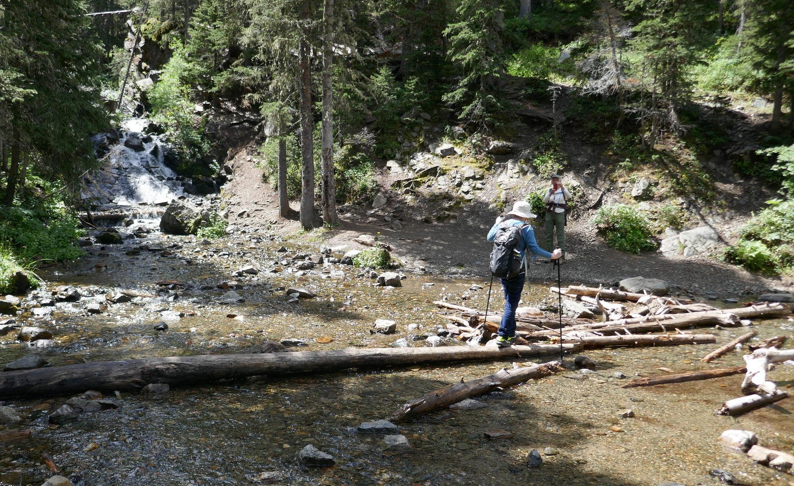 The return to parking was uneventful .. well not quite – the customary mountain showers showed up, raining enough that we donned rain gear for a few minutes. Then safely across the log crossing again, we headed down the the truck and into Red River for a beer (and root beer float for Thomas).