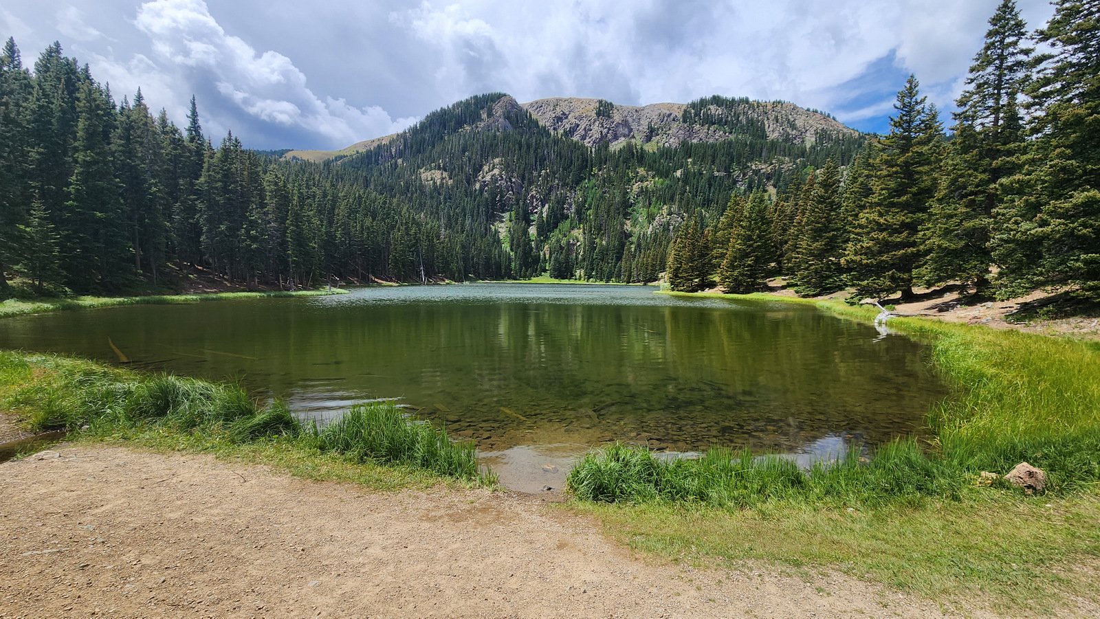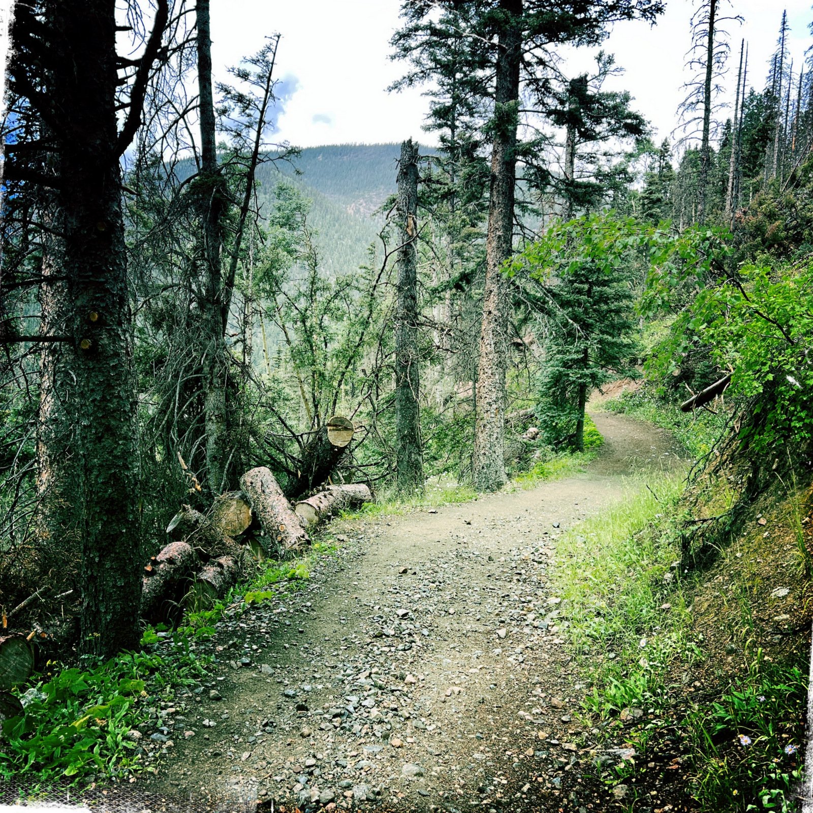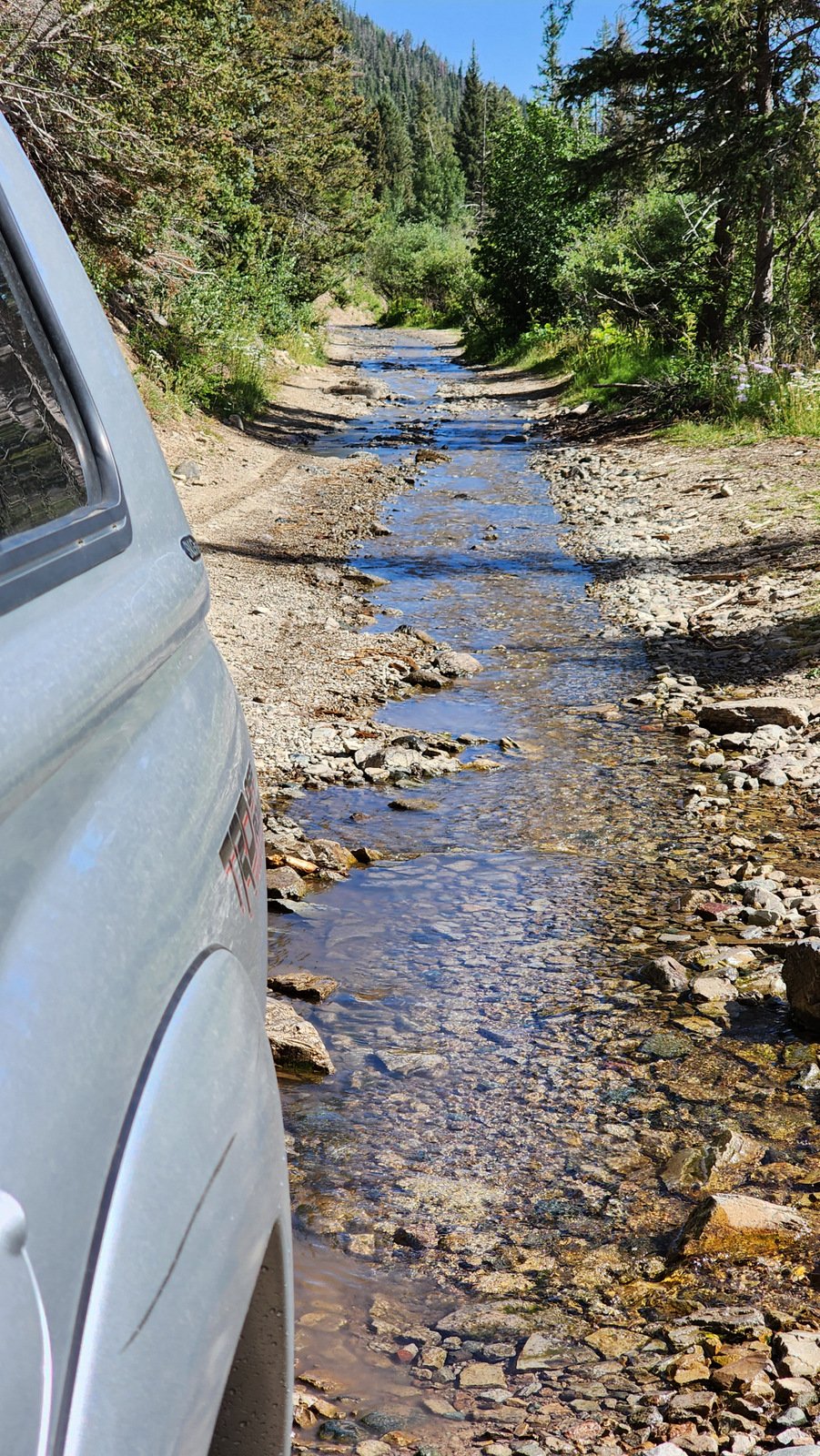 To get to the trailhead, drive through Red River on NM 578 and continue south to the end of the pavement. Continue on the first road to the right, Forest Road 58, a Class 4 tw0-track. Because of recent rains we drove through two fairly large, ‘tho not deep, pools of water. Then for the next 4oo yards or so this very rocky road had a rivulet of water running down it. We continued for a bit more than a mile to a large parking area. A high clearance vehicle is preferable, but there were “street” autos in the parking lot. The trail proceeds from there.