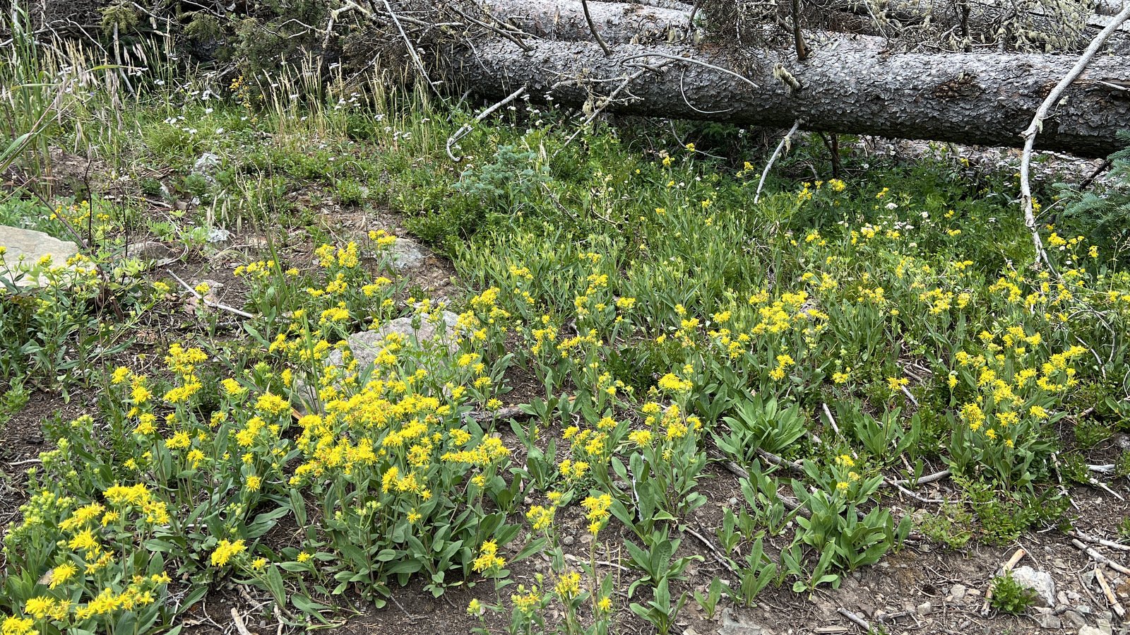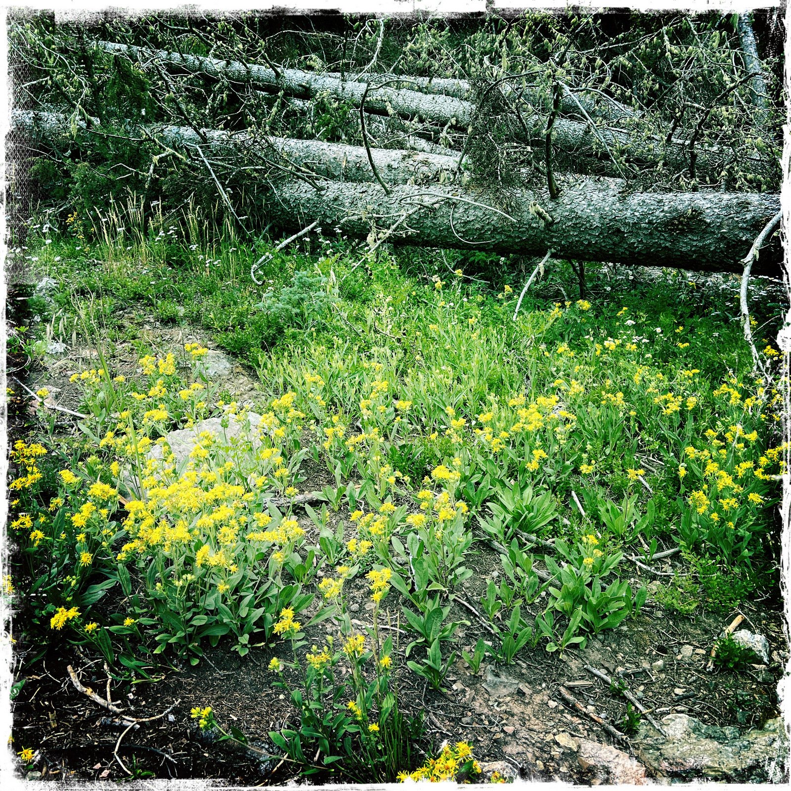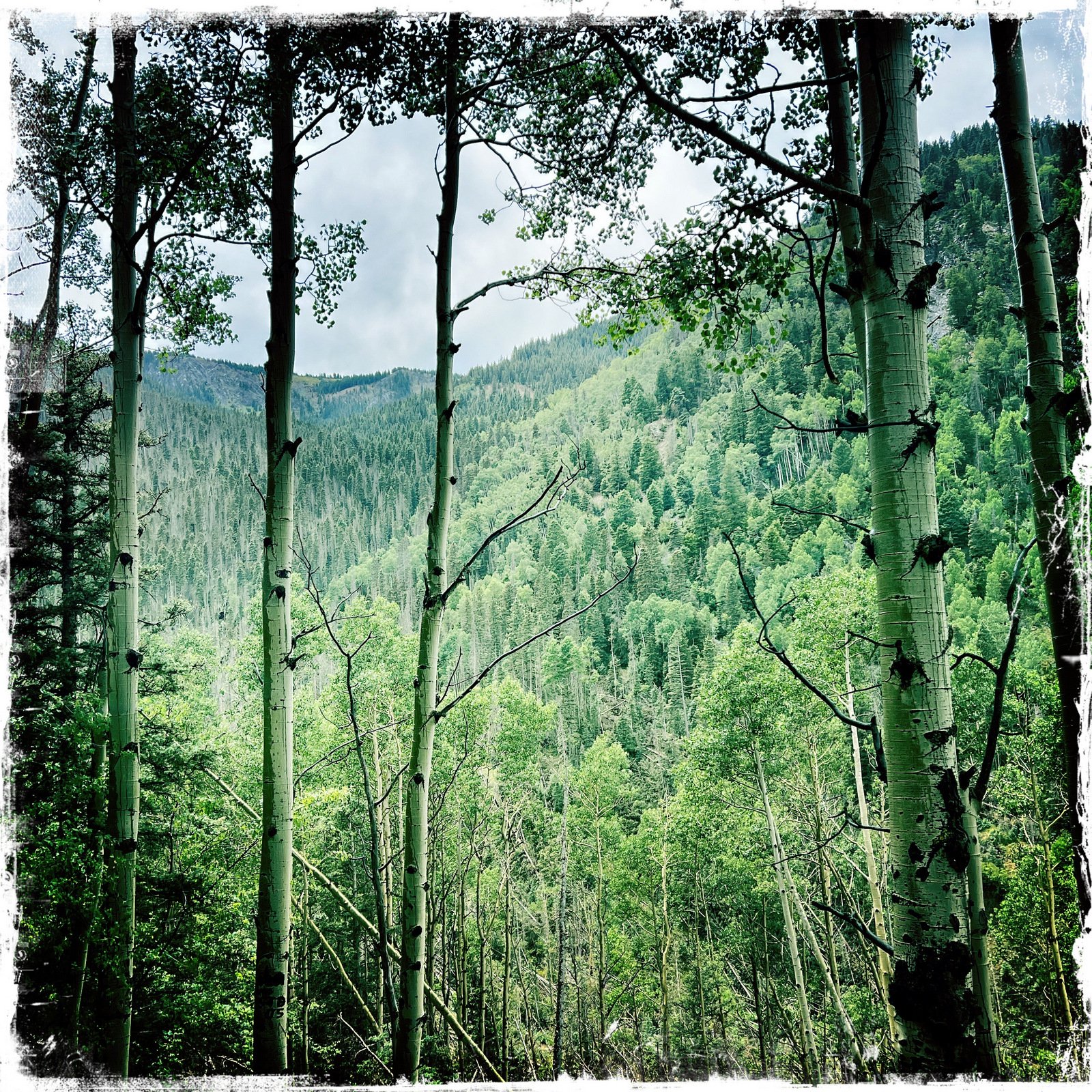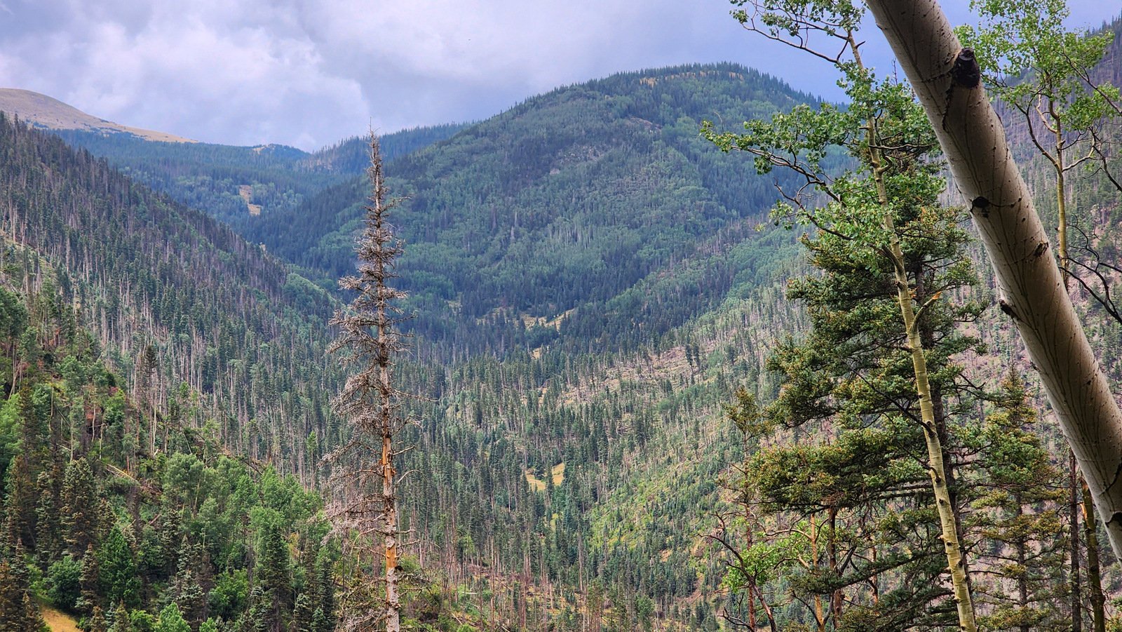 To get to the trailhead, drive through Red River on NM 578 and continue south to the end of the pavement. Continue on the first road to the right, Forest Road 58, a Class 4 tw0-track. Because of recent rains we drove through two fairly large, ‘tho not deep, pools of water. Then for the next 4oo yards or so this very rocky road had a rivulet of water running down it. We continued for a bit more than a mile to a large parking area. A high clearance vehicle is preferable, but there were “street” autos in the parking lot. The trail proceeds from there.