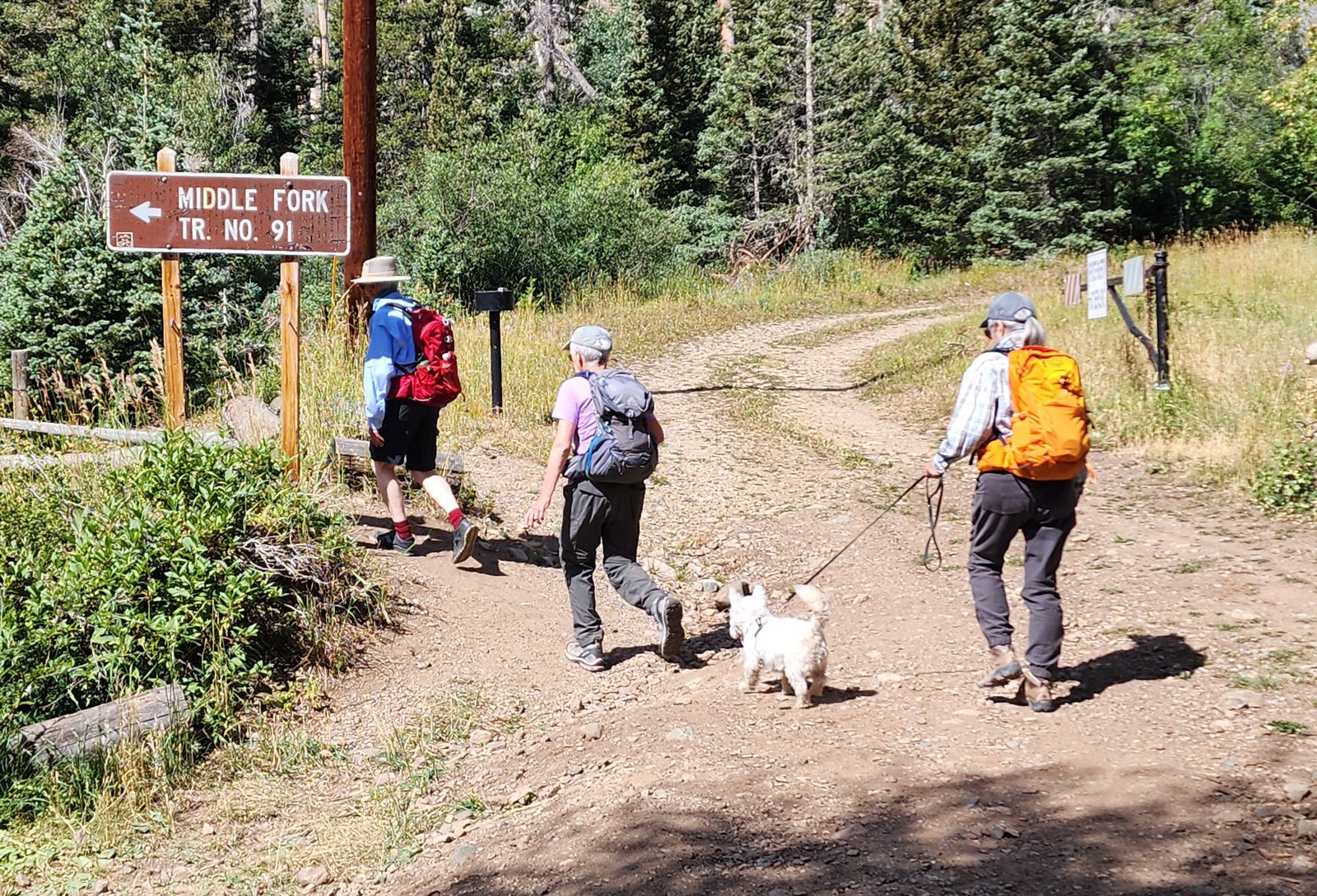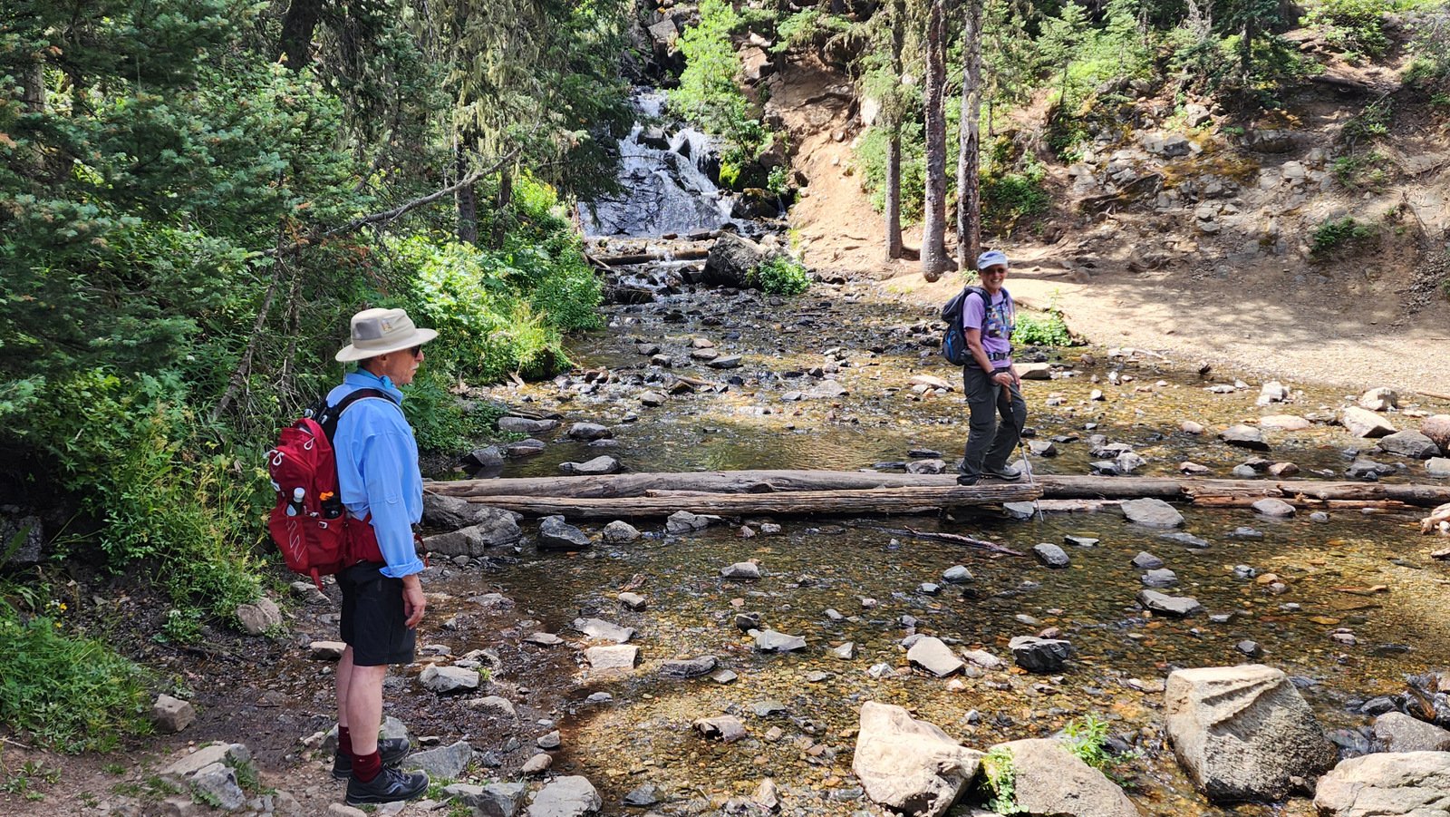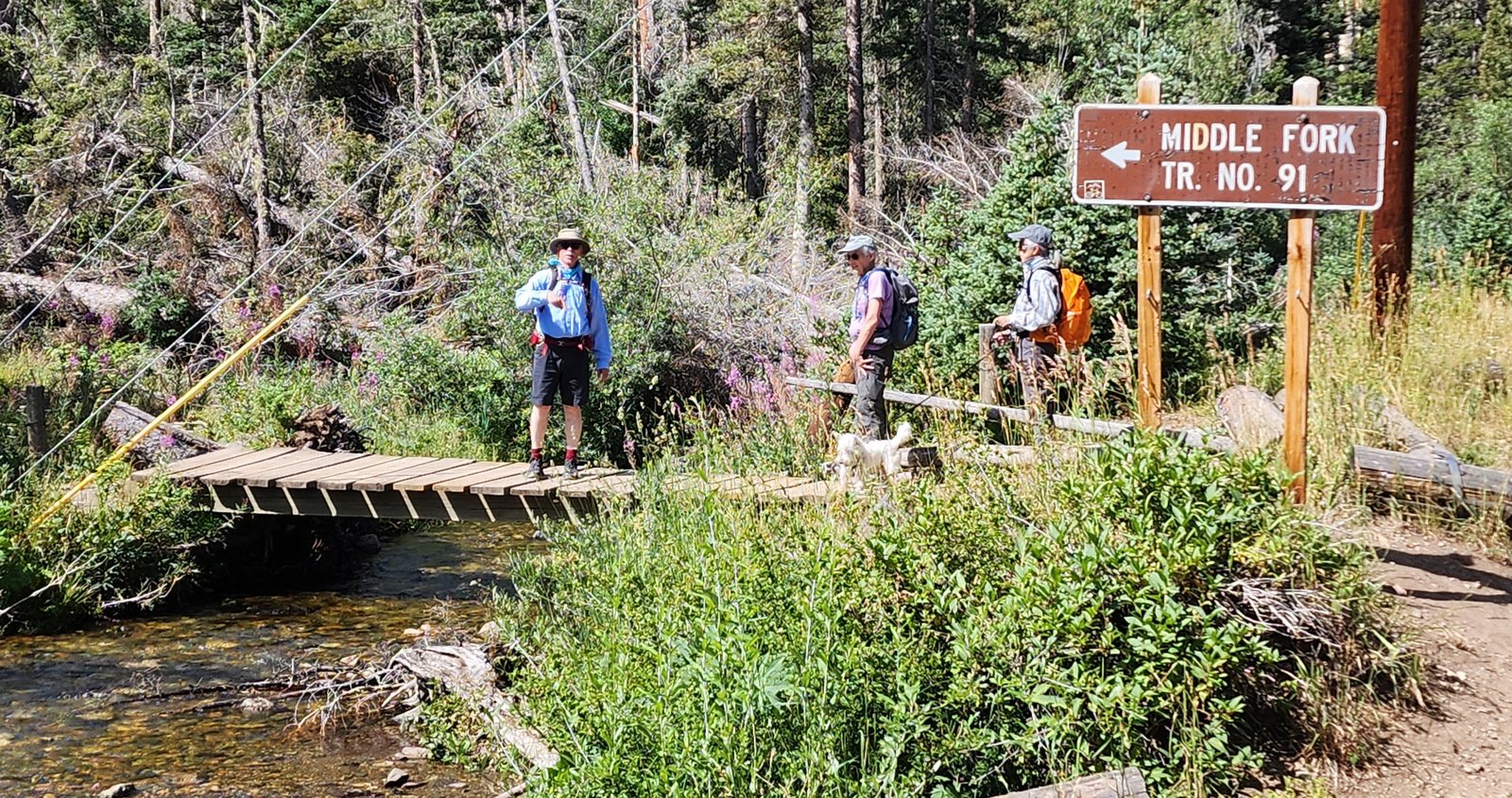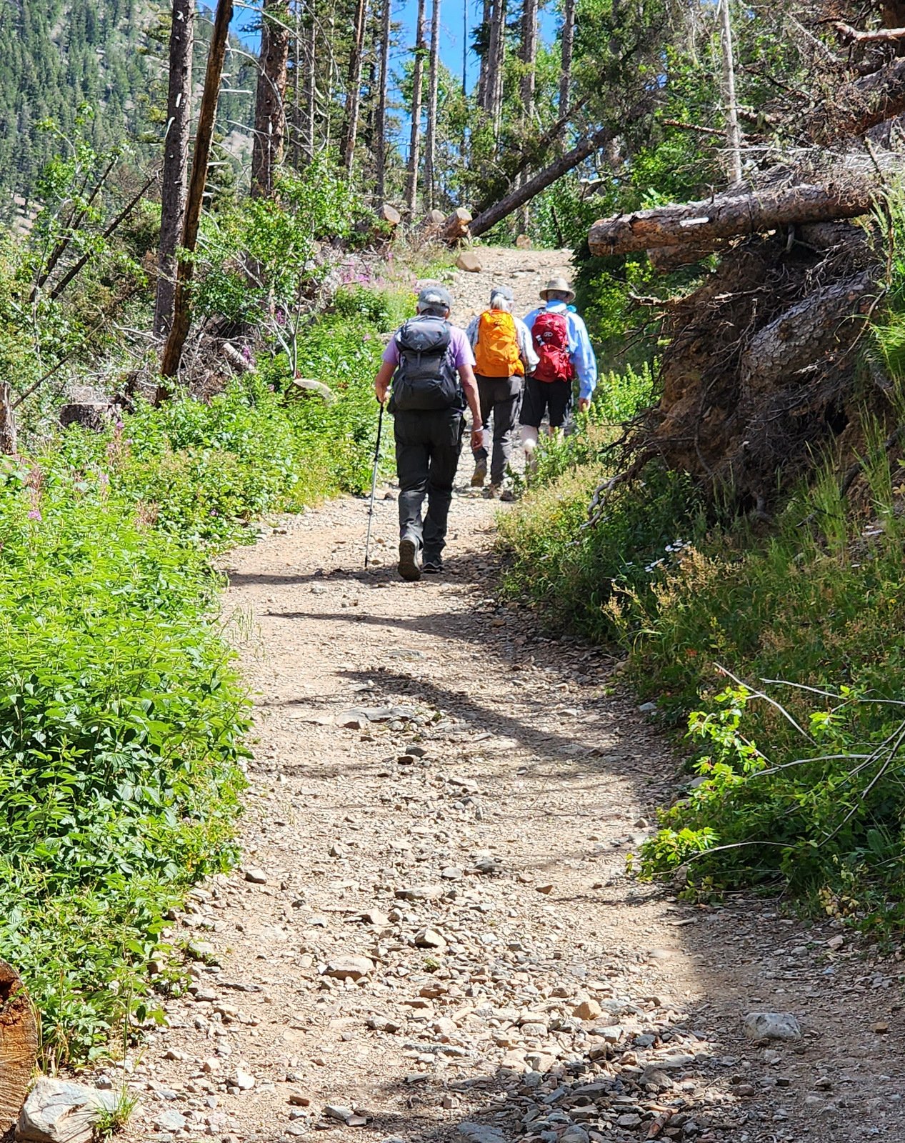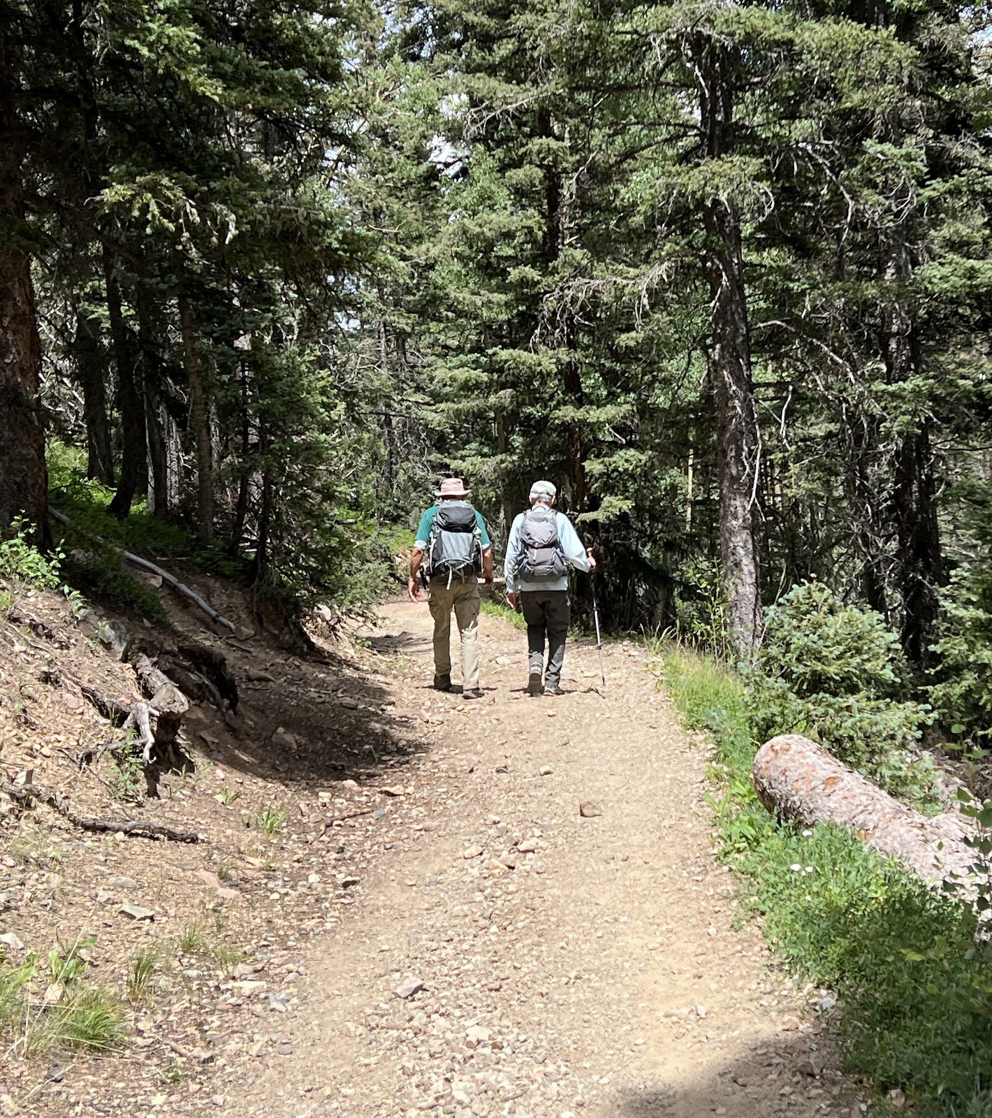 the really hot summer temperatures in Albuquerque (and Santa Fe) we headed to higher elevations, to Red River and camping in the Elephant Rock Campground. The plan – hike up the Middle Fork of the Red River to … Middle Fork Lake. Pat & I did this hike back in 2020 and in 2019 with grandson Thomas. We’ve enjoyed it and welcomed the chance to share it and two nights of camping with our friends Jay, Nancy, and Bo from Santa Fe.