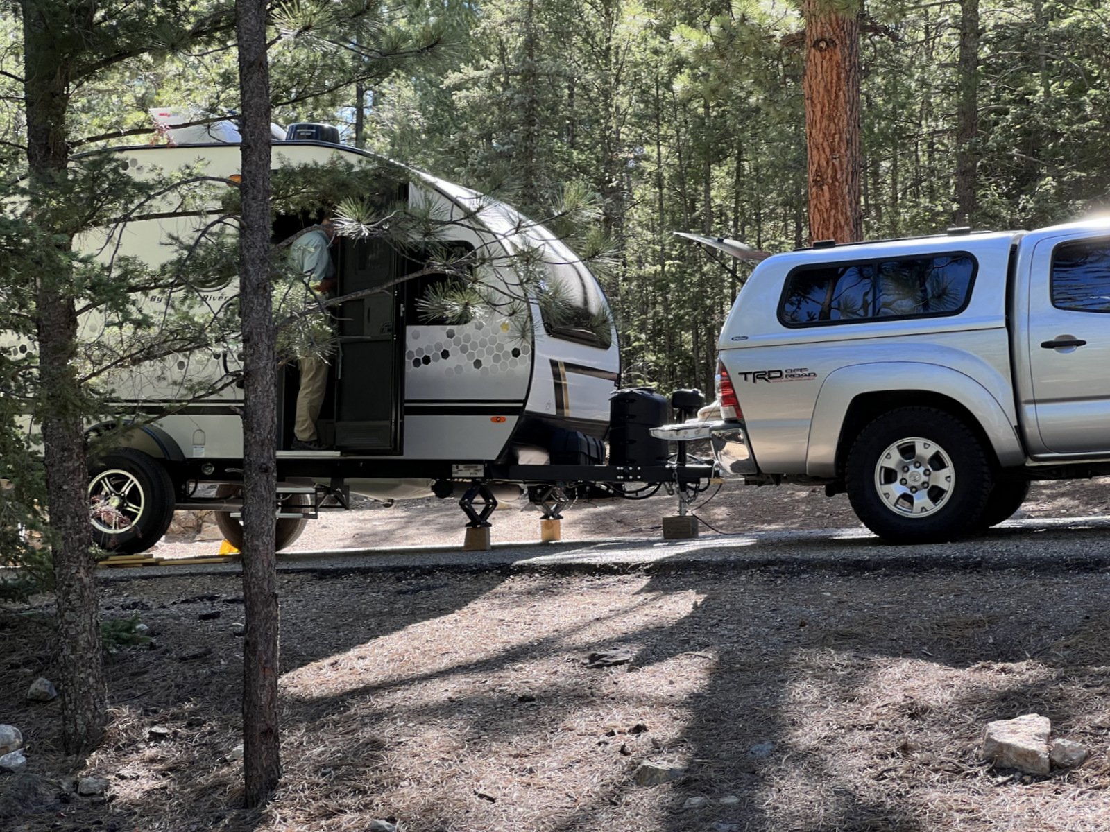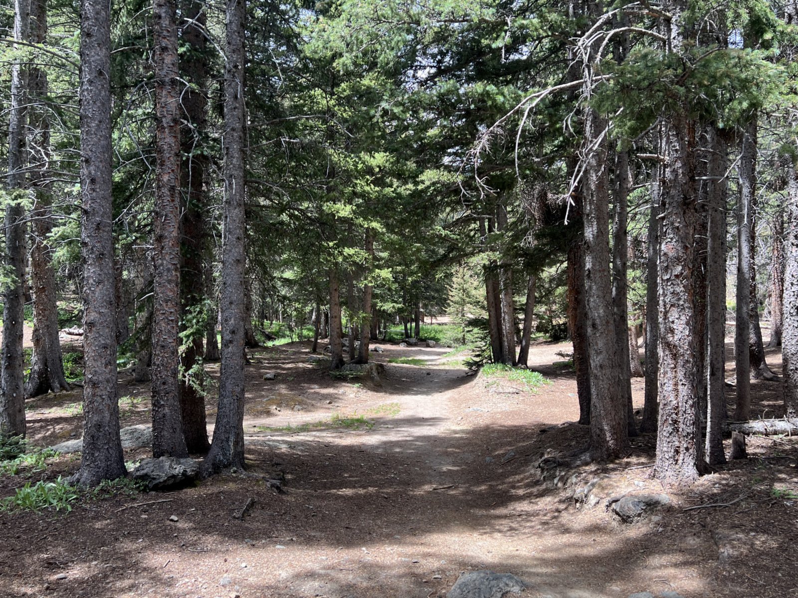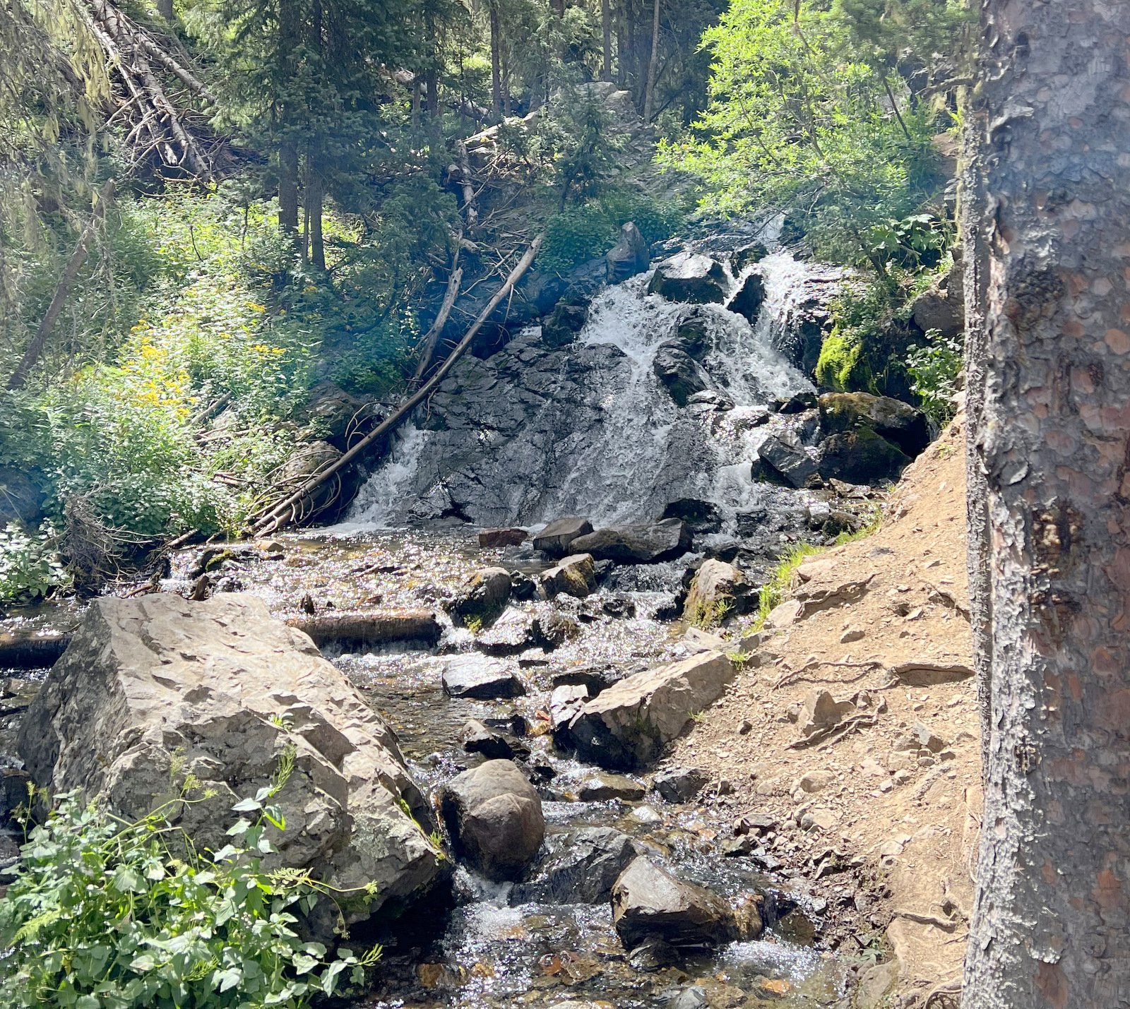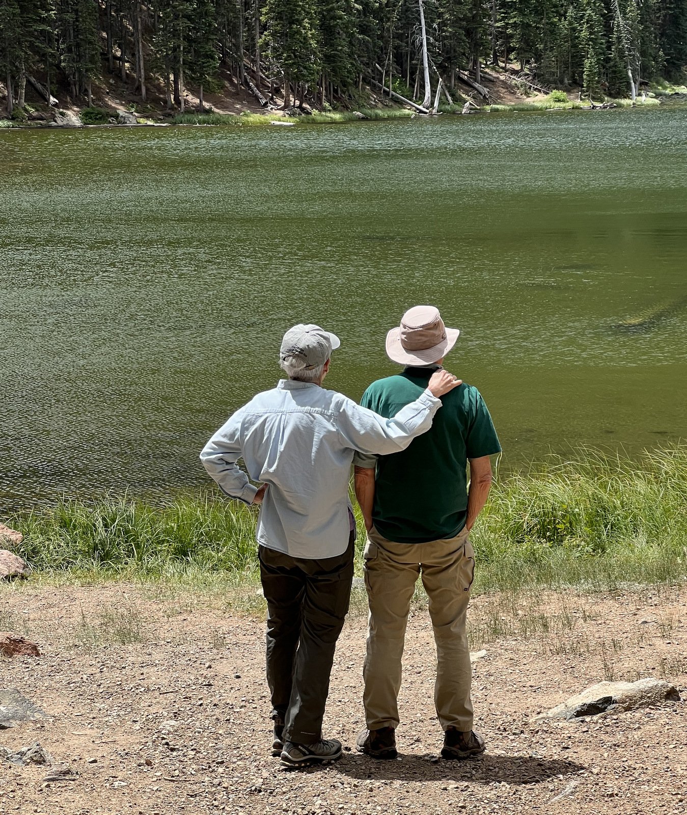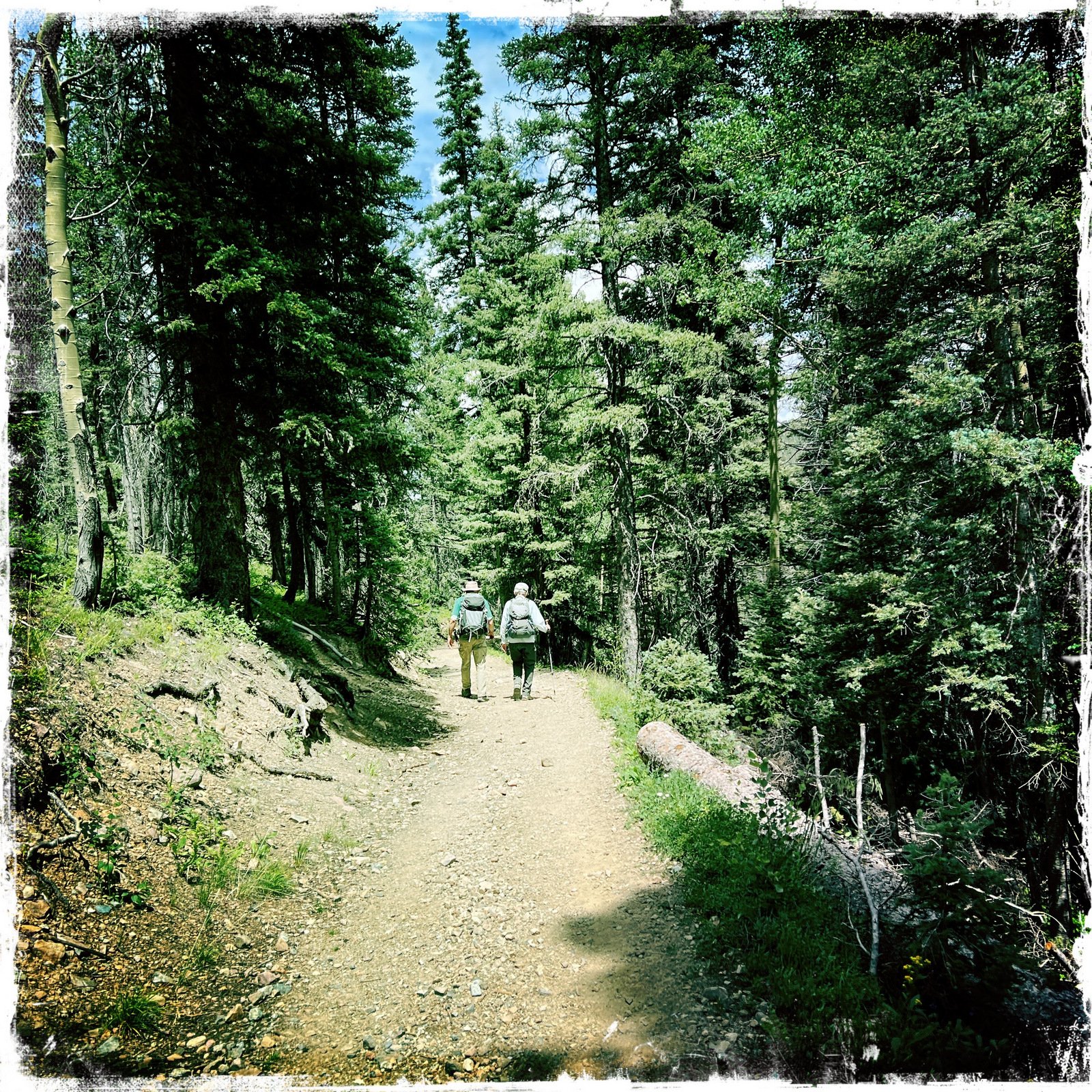 the really hot summer temperatures in Albuquerque (and Santa Fe) we headed to higher elevations, to Red River and camping in the Elephant Rock Campground. The plan – hike up the Middle Fork of the Red River to … Middle Fork Lake. Pat & I did this hike back in 2020 and in 2019 with grandson Thomas. We’ve enjoyed it and welcomed the chance to share it and two nights of camping with our friends Jay, Nancy, and Bo from Santa Fe.