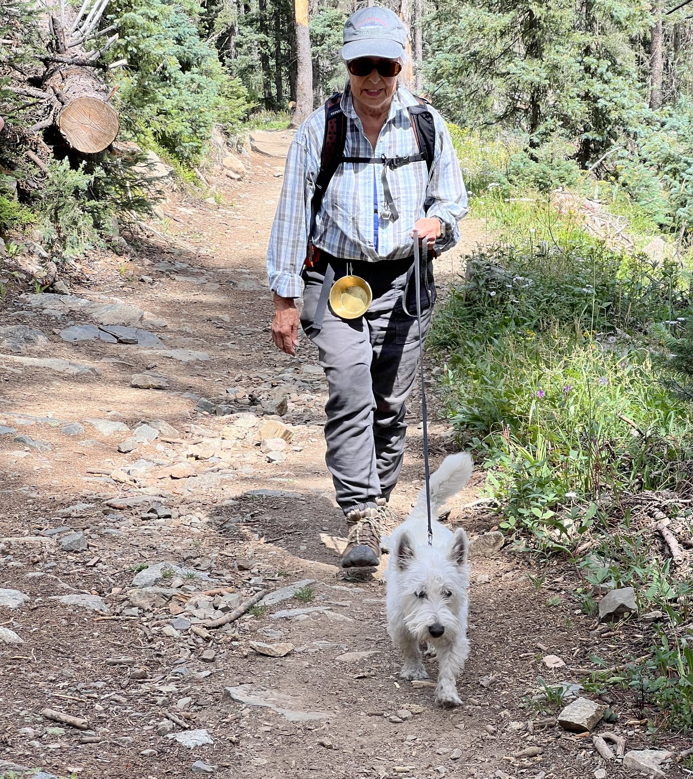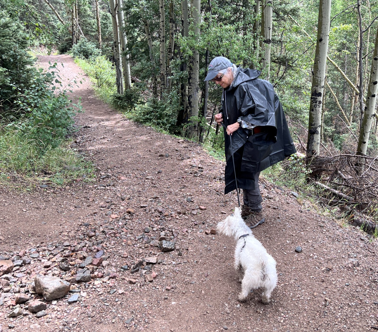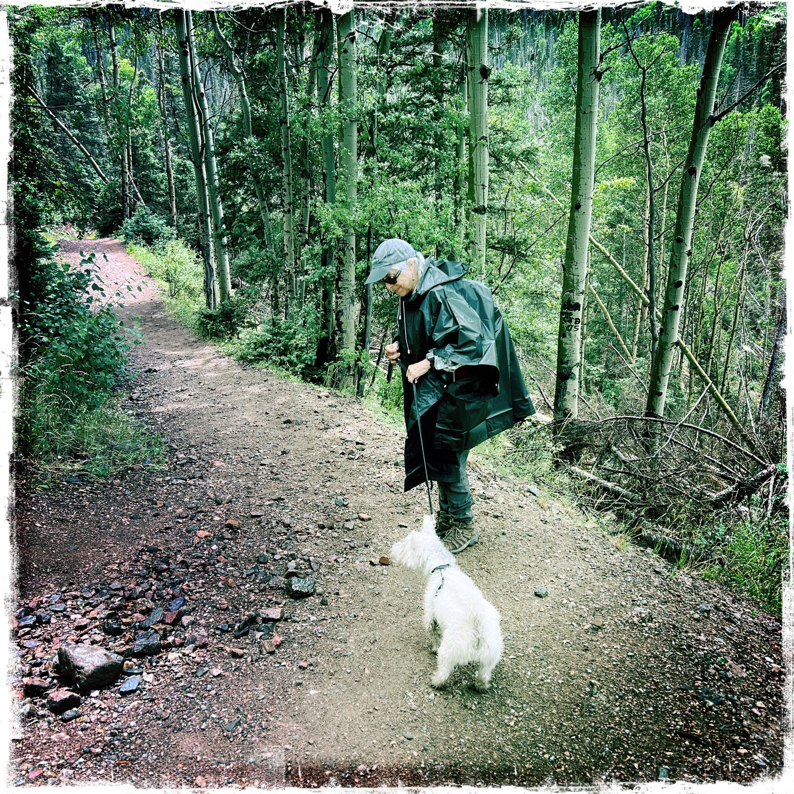Jay here: Each switchback was an opportunity to stop in the shade before tackling the next leg. Not a bad way to hike unless you’ve got something to prove — we’re done with that. When the wind amped up it was like a classic science experiment. Warm air blows across cold water and voila, air conditioning! We’ve hiked in rain and snow before, but tiny hail pellets were a first. Bo is definitely gaining real hiking experience but his fur was mighty soggy at hike’s end. He may need his own poncho.