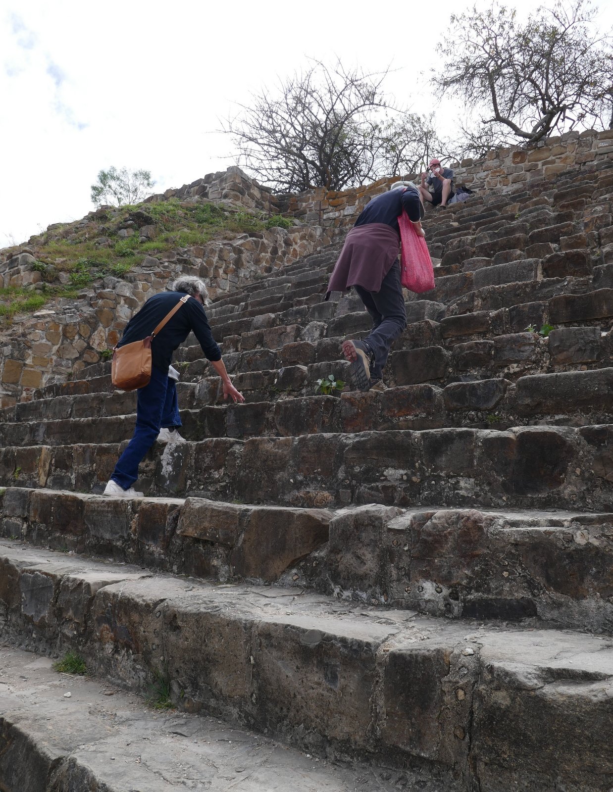 During our visit to Oaxaca this year, we returned to Monte Albán with our friend Addie. Again were impressed with the size of the site and of the buildings. So we walked only 1.7 miles..but we faced some elevation gain – the “steps” up to the top of the pyramids were challenging. We were told on a previous visit that the rise of each step is so great that one must keep one’s head down as one climbs up. We confirmed that to be the case. Oh, and descending requires even more concentration to be safe.