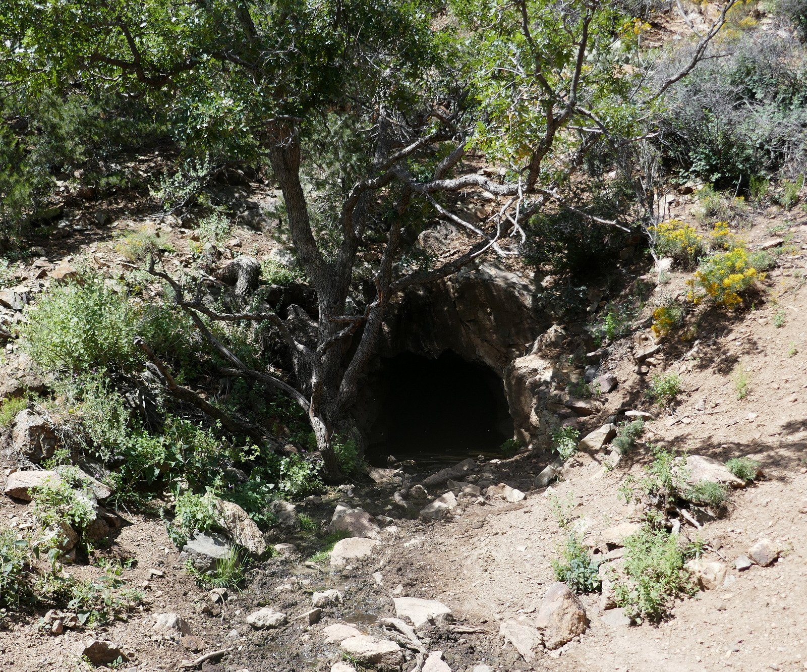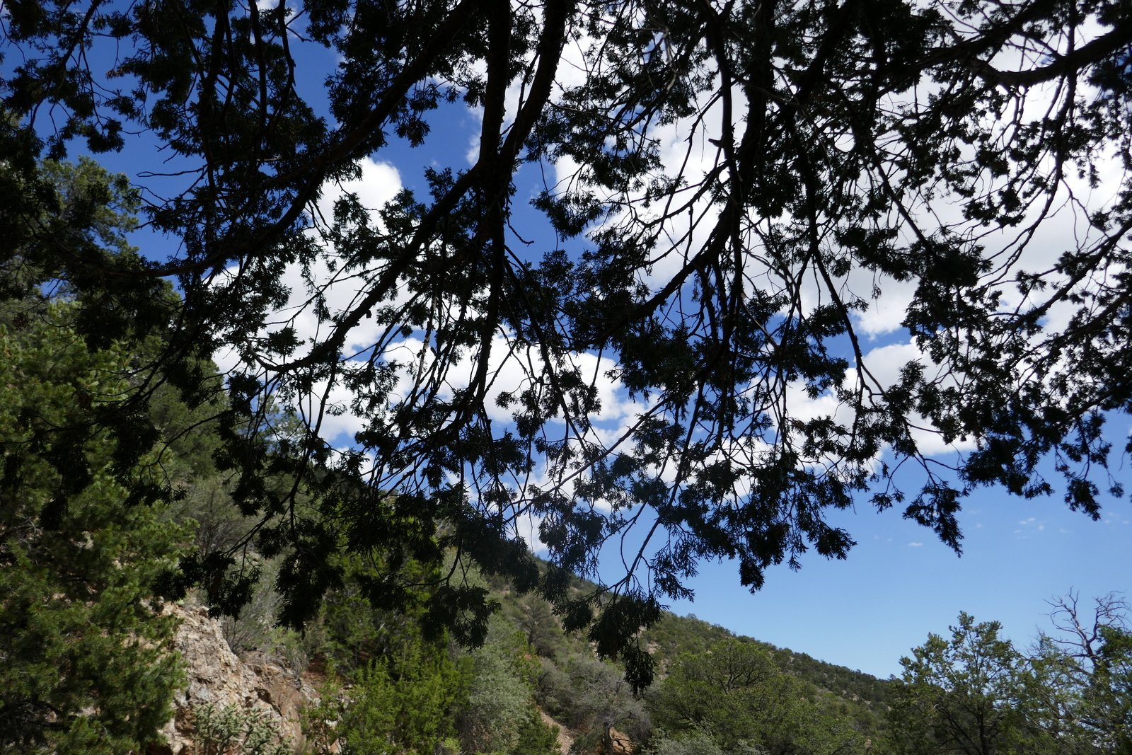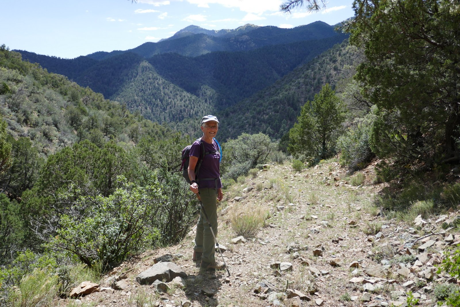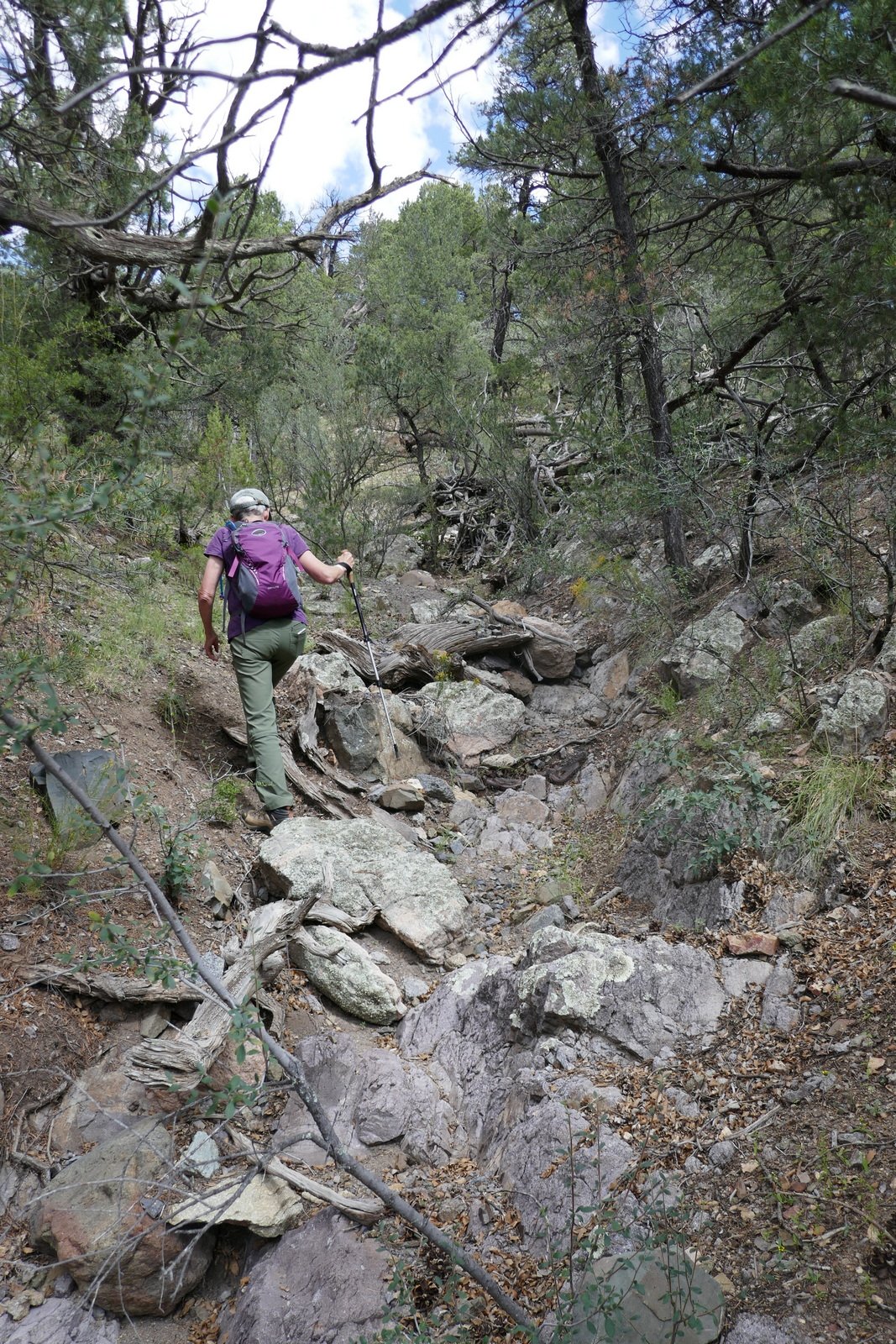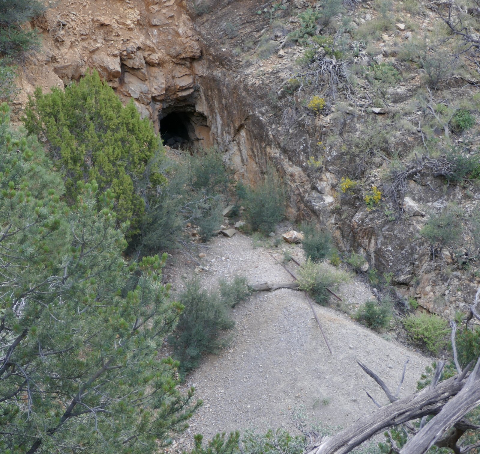 This is our second hike in the Magdalena Mountains during a 3-night stay in the campground in our R-Pod camper.  The first day we did the Mesa Trai l#15 hike. We planned to stay only two nights, taking a “short hike” before heading home.  But looking at opportunities near the campground, on the Topo maps (courtesy USTopo on our Android tablet), we noticed springs and -mines- up Fork Canyon, on a two-track leaving the campground.  Since that sounded interesting, we headed out for a “short” hike.