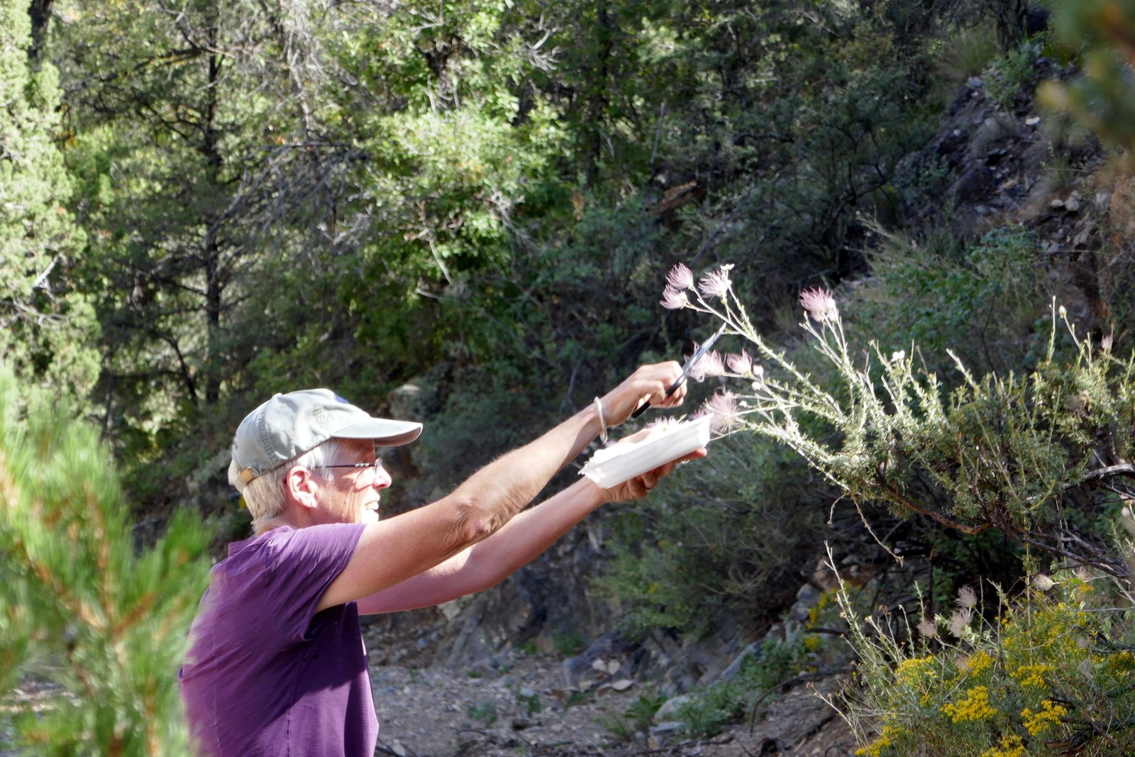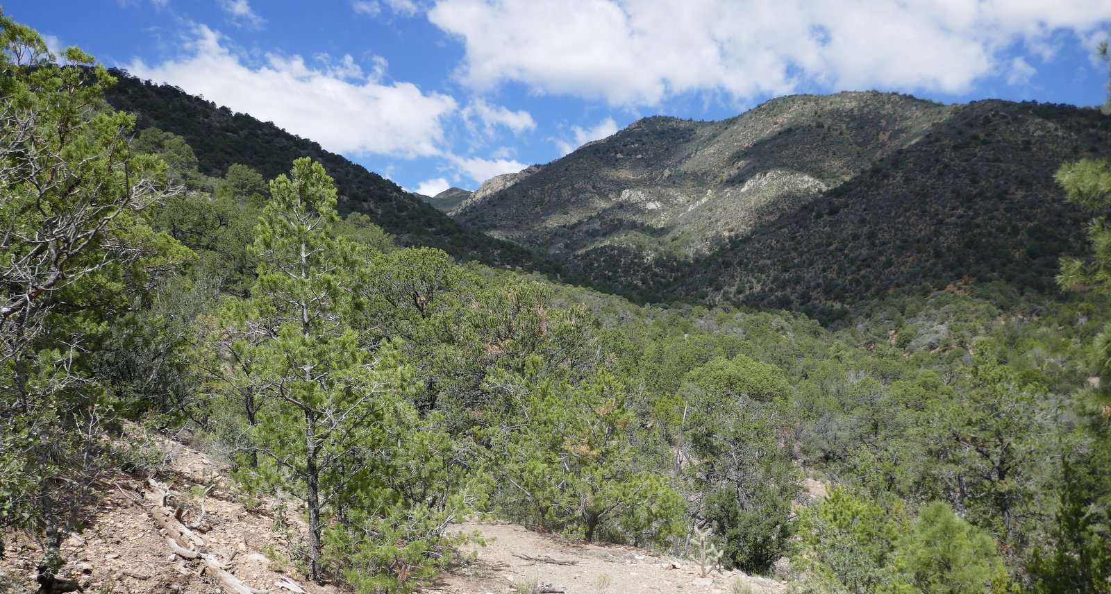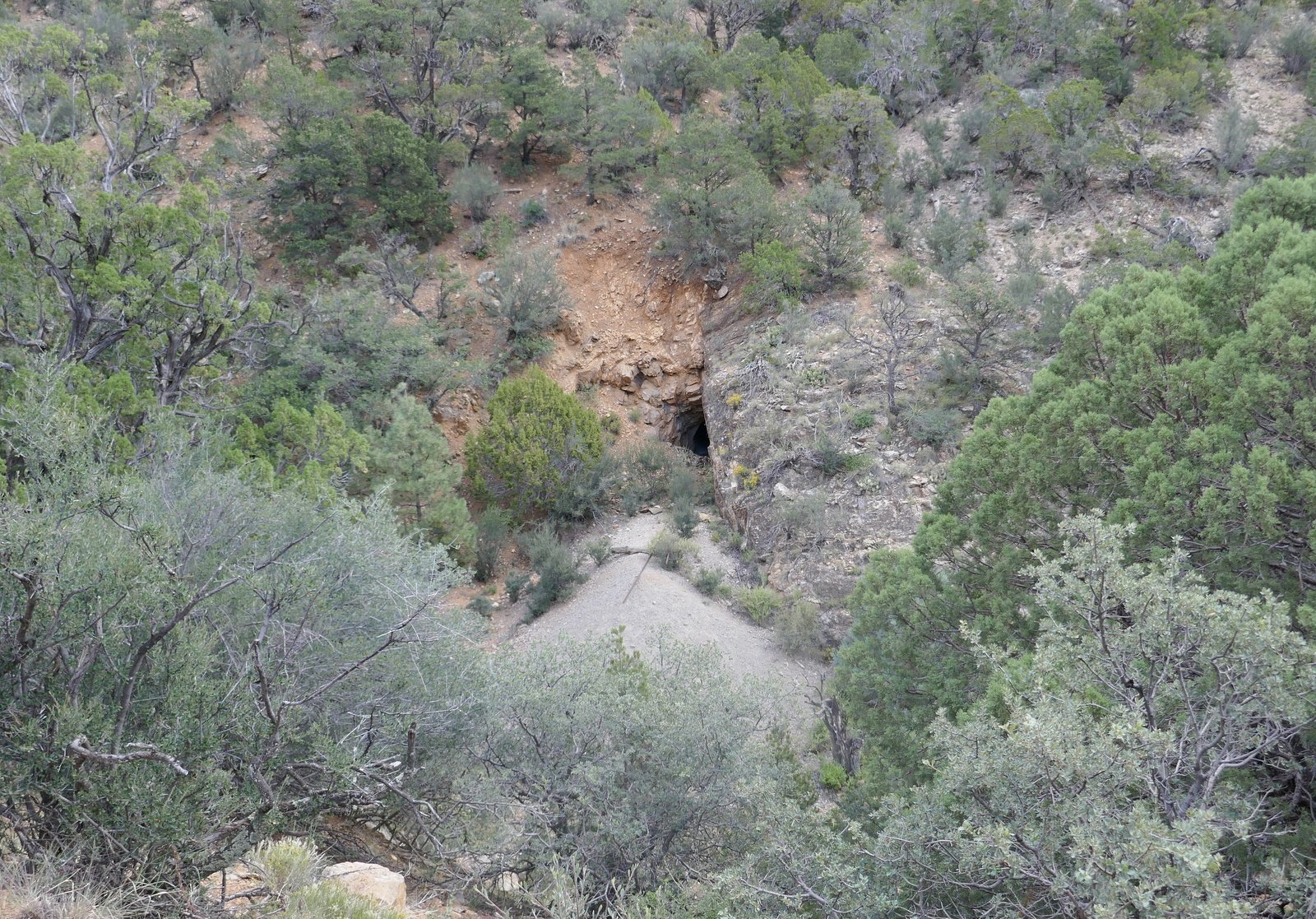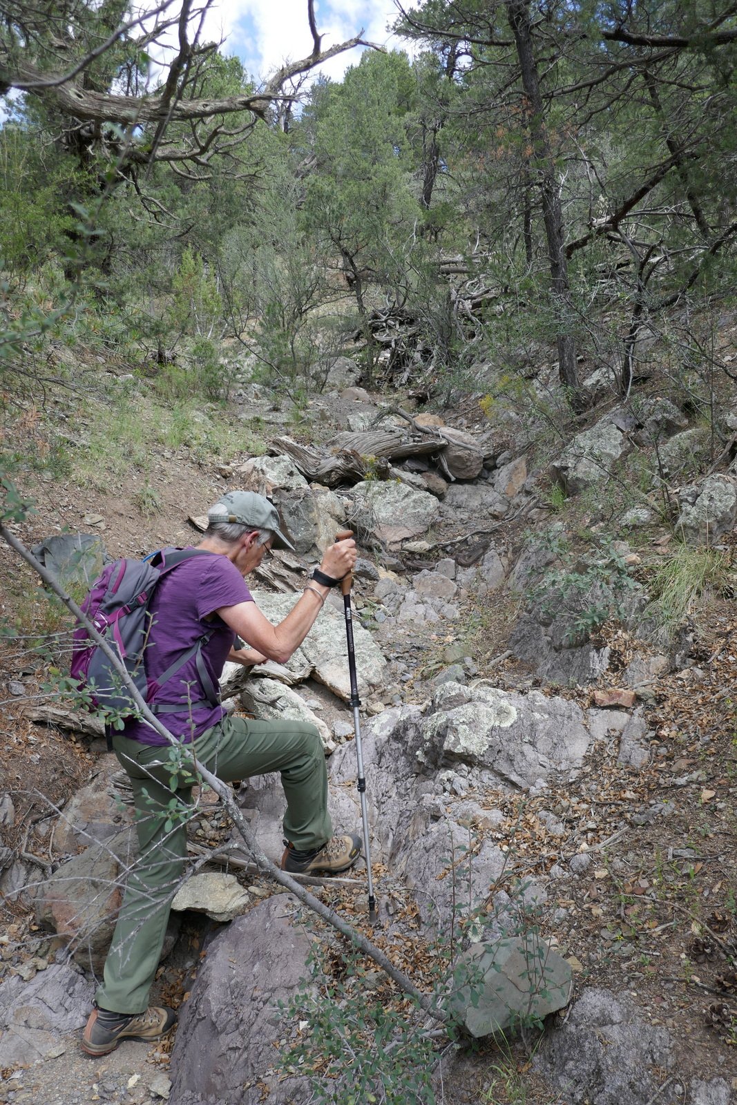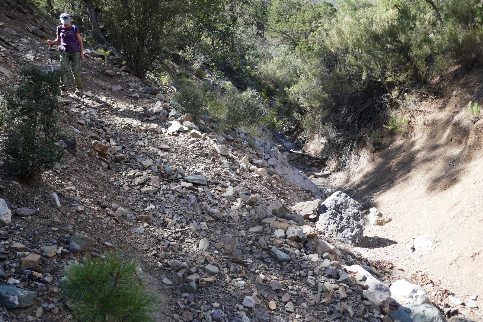 This is our second hike in the Magdalena Mountains during a 3-night stay in the campground in our R-Pod camper.  The first day we did the Mesa Trai l#15 hike. We planned to stay only two nights, taking a “short hike” before heading home.  But looking at opportunities near the campground, on the Topo maps (courtesy USTopo on our Android tablet), we noticed springs and -mines- up Fork Canyon, on a two-track leaving the campground.  Since that sounded interesting, we headed out for a “short” hike.