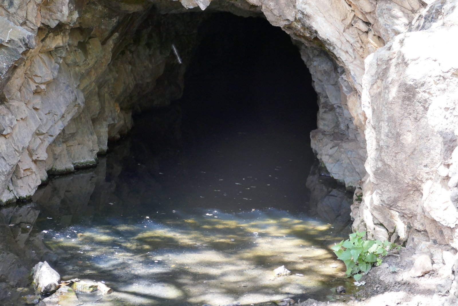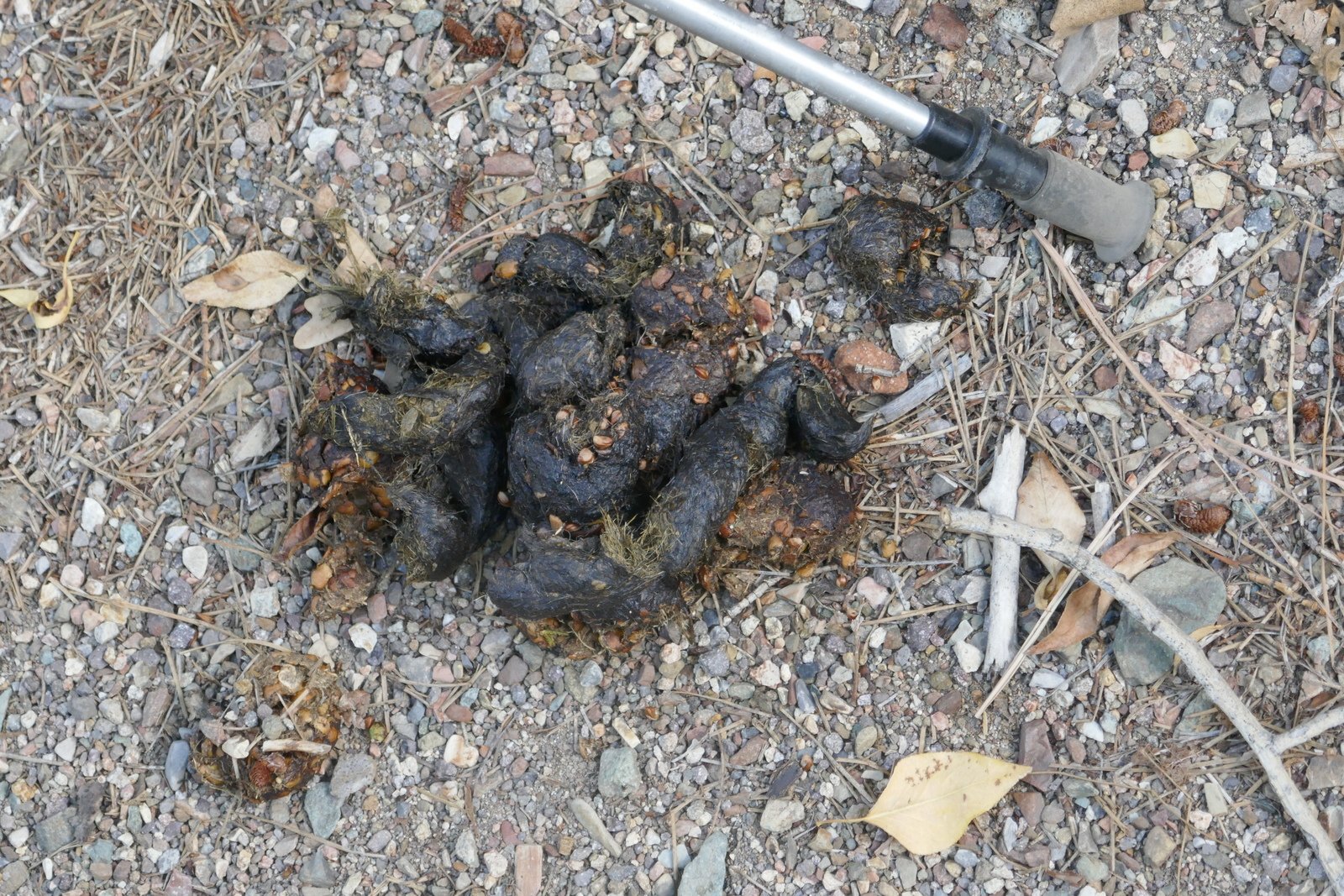 About 2.7 miles into the hike, back on a sometimes rough two-track (apparently this provided access to the mines), we spied the first mine, on the far wall of the canyon below the two-track – a cave with tailings.  We continued on up the canyon to the second mine site, finding a large cave with standing water in its entrance.  And .. many tracks in the mud along with droppings – we surmised that this was a gathering place for elk. The return to the campsite was a most pleasant part of the hike, stopping to admire the flowers and a view across Water Canyon of the outcrops that make it’s eastern cliffs (and encountering some droppings which we concluded were bear scat).