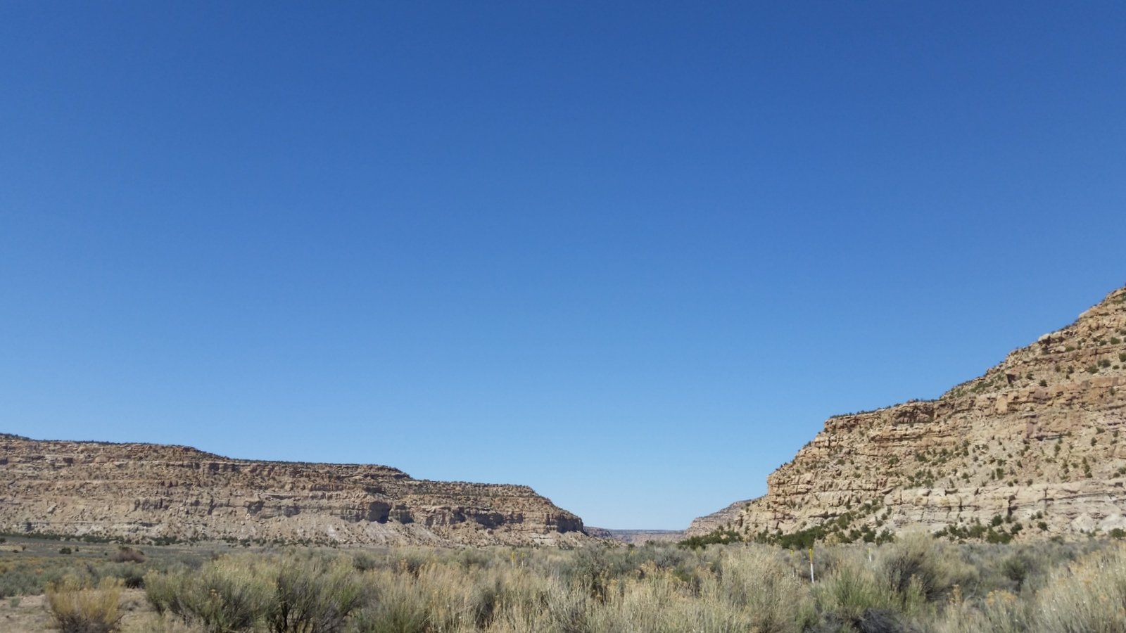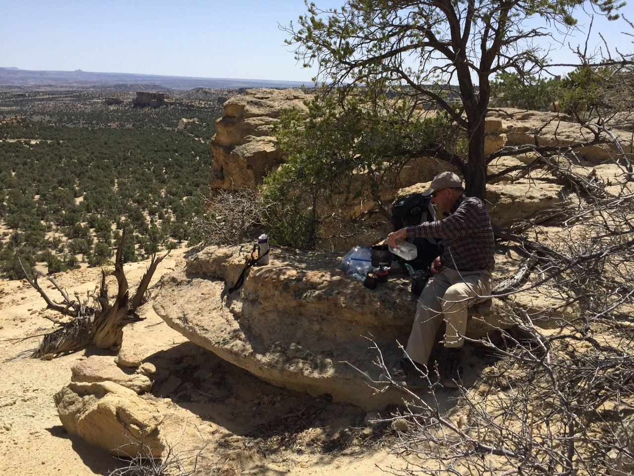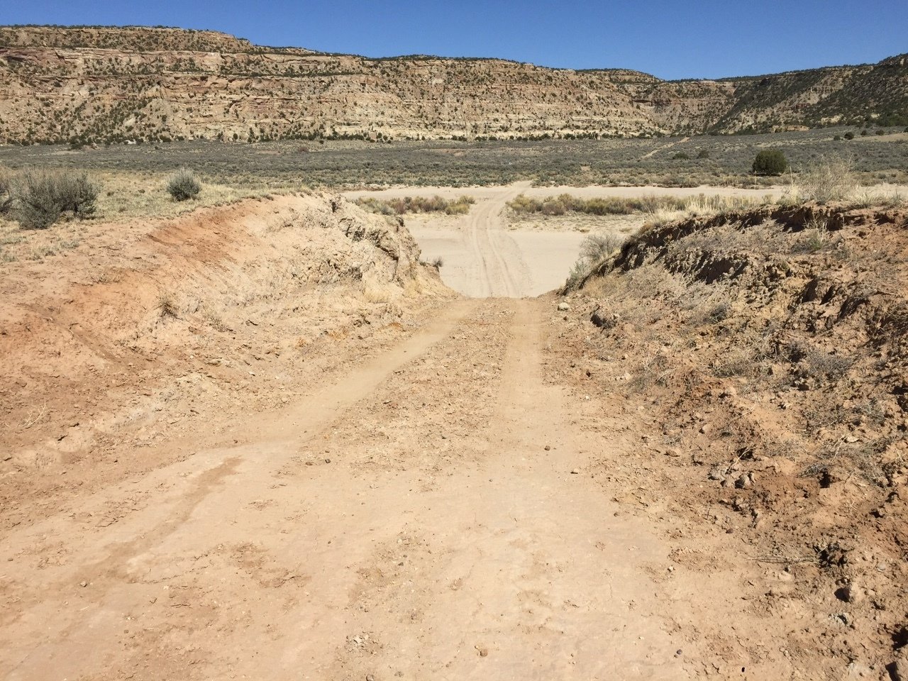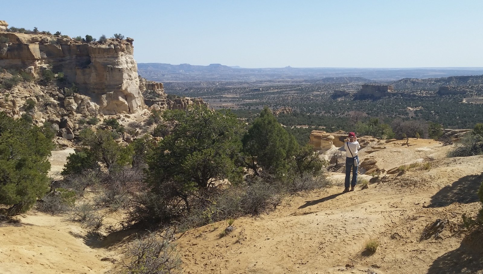 So, it was on US 550 going west, passing through Cuba to Counselor (barely a wide spot in the road), and turning north on NM 403, a 50+ mile unpaved road that runs the length of Largo Canyon. ‘Tis a two lane, well graded road most of the time, thanks to it’s use by the oil and gas industry (this is ‘their’ territory). Flanked on both sides with mesas 50′ up to maybe 150′ in height, with many side canyons going off to the left and right. ‘Twas our plan to visit at least one of the Pueblitos (see reference to GoogleEarth file below); it soon became apparent that most of the Pueblitos are located on the top of the mesas. We identified one for which it appeared a road ascended to the mesa top not far off or NM 403: Kin-Yazhi Pueblito. We were able to crest the mesa, but the road towards the Pueblito was blocked, leaving us with a 1.7 mile hike. Uncertain about details of our plan for the remainder of the trip, we passed on the hike – next time.