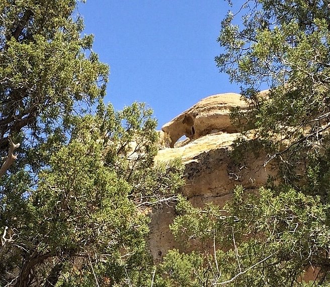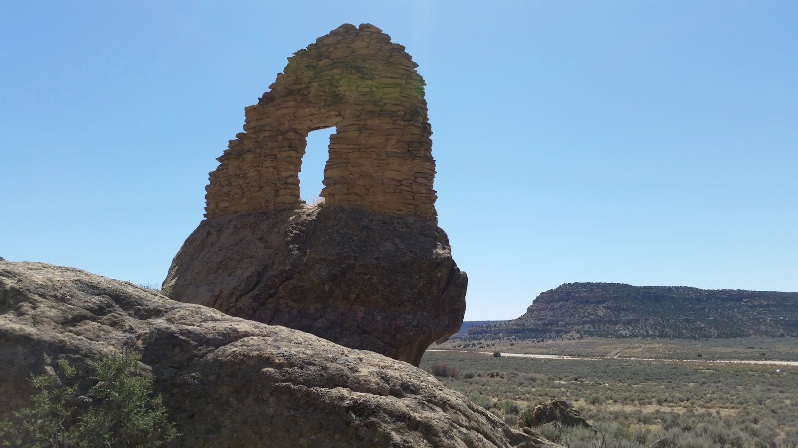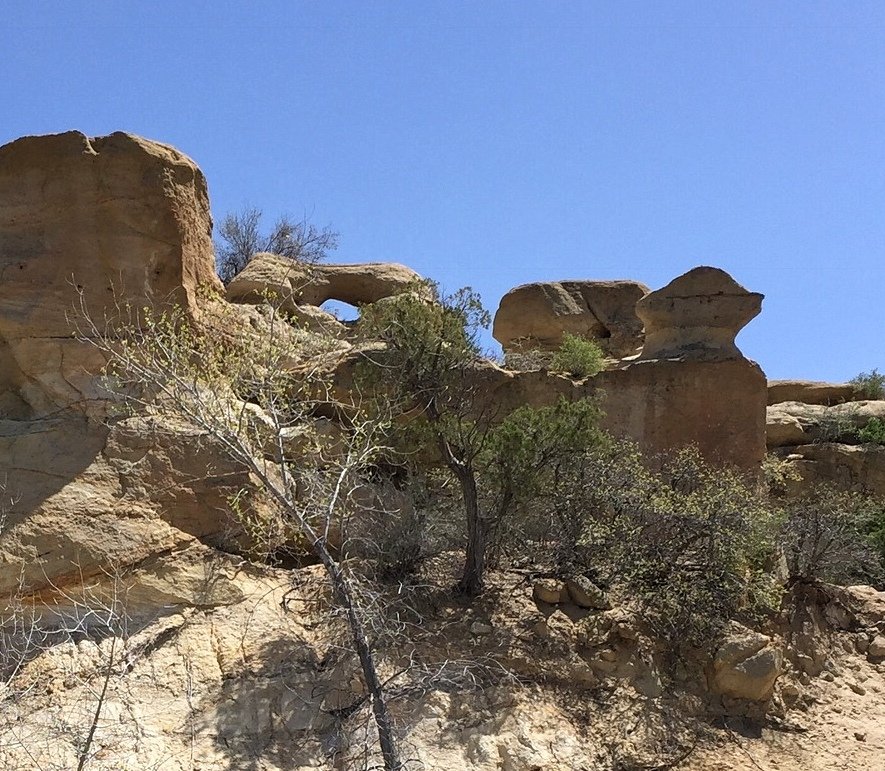 From there we started out for home, but taking a short side trip to check out the miniature Natural Arches that have been located throughout the area (see the link below). We chose a side road off of NM 173 that led to 3 or 4 arches (according to the map). Parking at the perimeter of a gas well pad, we wandered around looking up at the rock face, and found them, small bridges over an opening to the sky beyond. After a small lunch, we hit the road, choosing to go ‘cross country’ on NM 537 through the Jicarilla Apache Indian Reservation. This road makes for a pleasant drive through forested hills, a change from the desert environment of Largo Canyon. Then home via US 550 – we’ll return for more exploring, particularly in Largo Canyon.