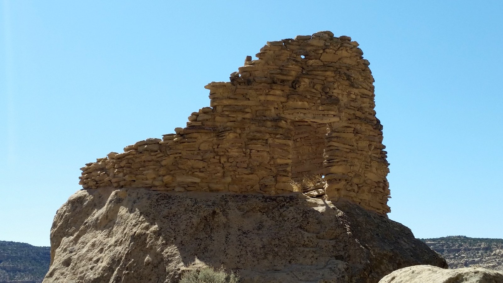 Continuing north on NM 403 we found a Pueblito that was at the base of one of the mesas: Foothold Pueblito. Taking a 3 mile diversion up Palluche Wash, we then turned onto a two-track that would take us to the Pueblito. There was a moment of surprise when we looked down the two-track as it descended a -steep- embankment, then crossed 150 yards of sand in the bottom of the Wash. It was -dry- however, so with 4-wheel drive engaged, we crossed easily. And found our way to the Foothold Pueblito – quite interesting, as it sits atop a very large, rectangular rock at the base of Superior Mesa. It was then on to Farmington for the night at Casa Blanca Inn & Suites.