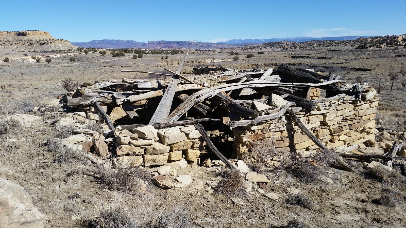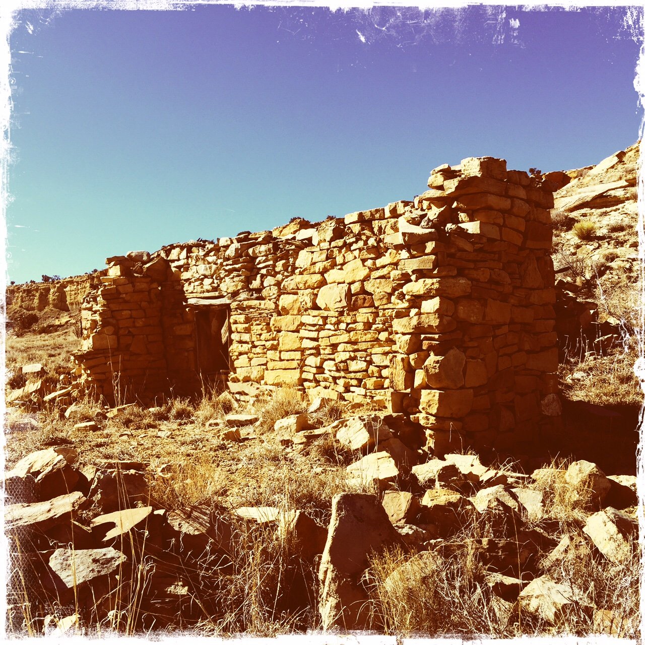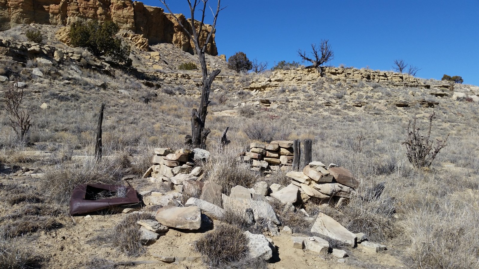 Parking just off Cabezon Road, we headed east to the entrance of the canyon, crossing a 10′ deep arroyo with frozen water where the sun doesn’t shine. Rounding the north eastern point of the mesa, we encountered a partially collapsed rock building, dug partially into the west face of the canyon. The wood supports of the roof had collapsed onto a table in the middle of the approximately 15′ square room, but windows and doors were still in place. In the area were other signs of habitation, including what we think must have been a small corral with a smaller rock structure. (See photos below.)