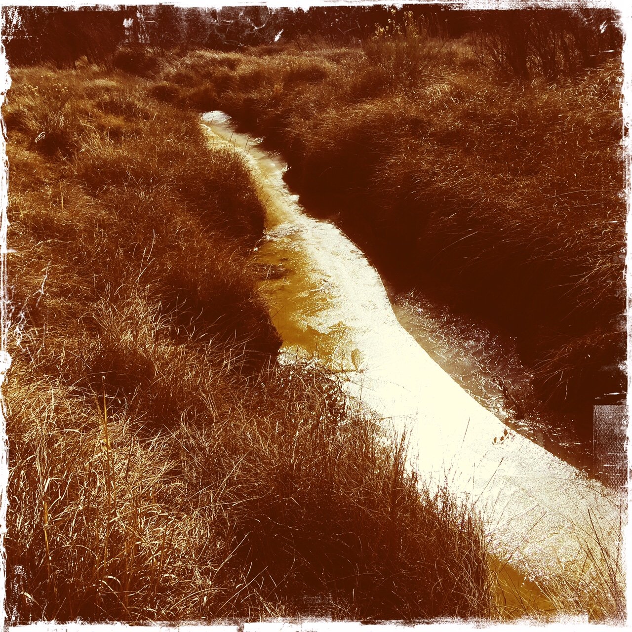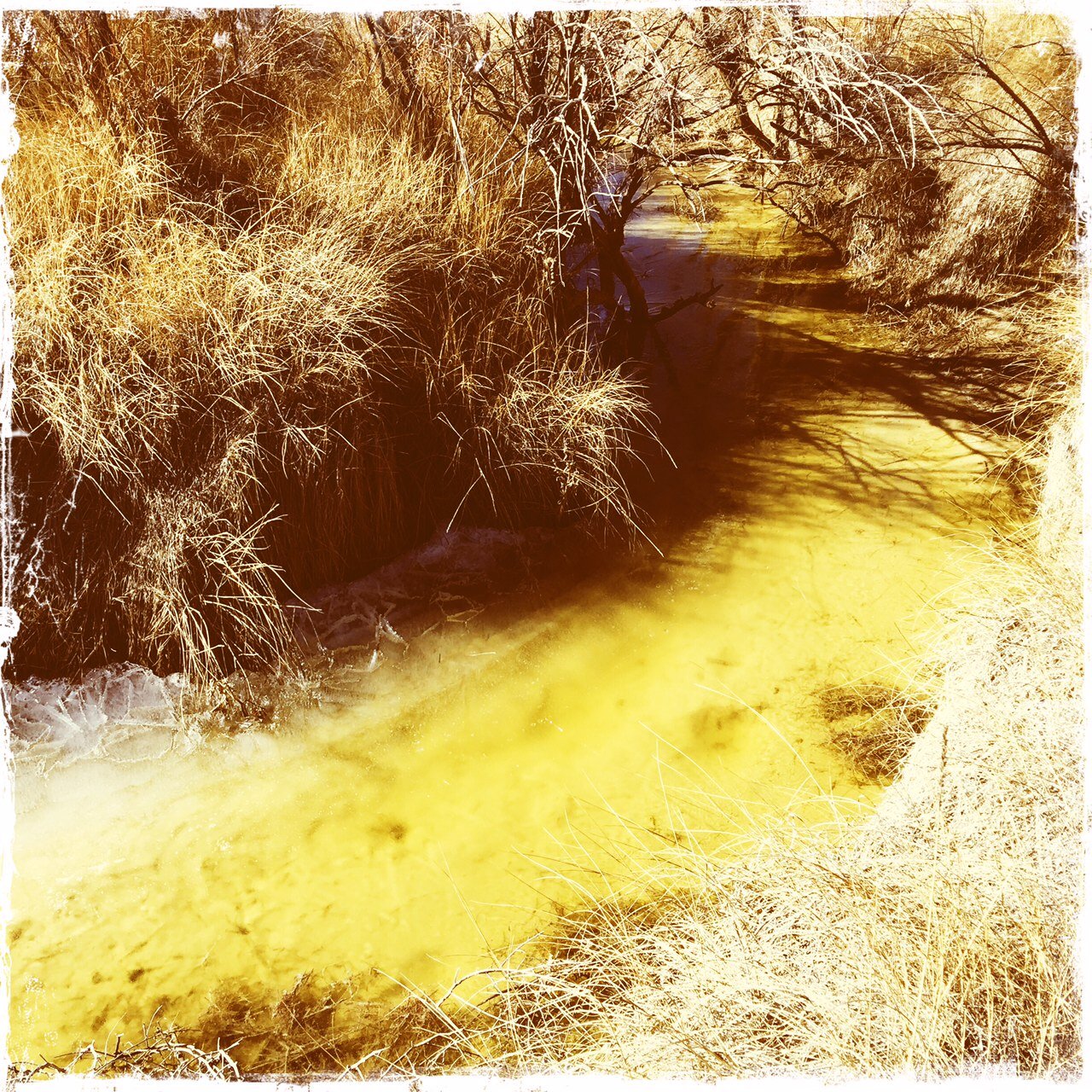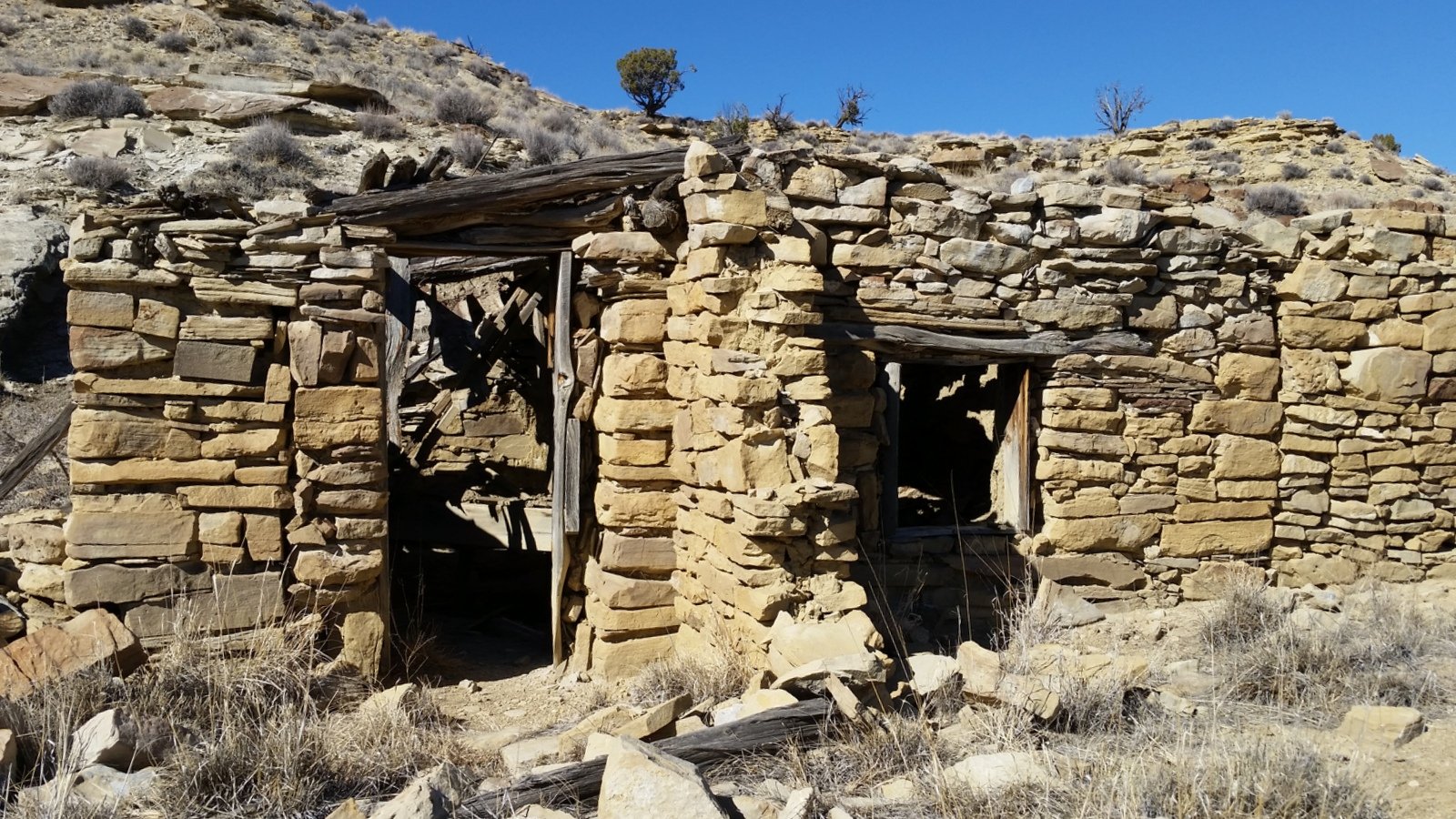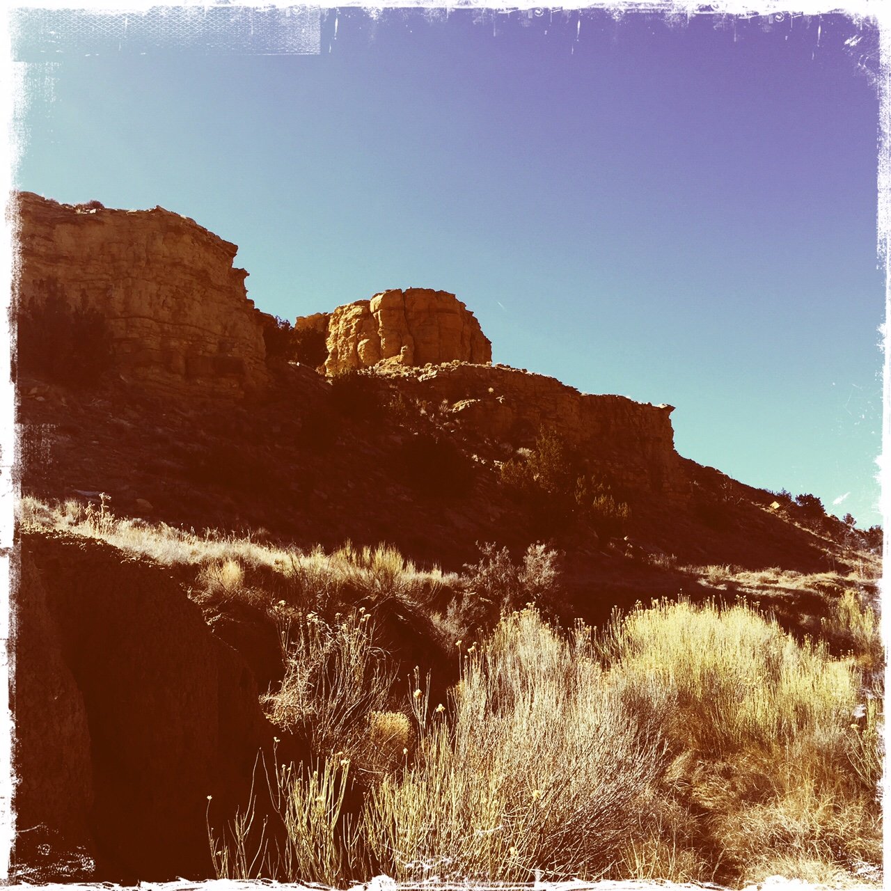 Parking just off Cabezon Road, we headed east to the entrance of the canyon, crossing a 10′ deep arroyo with frozen water where the sun doesn’t shine. Rounding the north eastern point of the mesa, we encountered a partially collapsed rock building, dug partially into the west face of the canyon. The wood supports of the roof had collapsed onto a table in the middle of the approximately 15′ square room, but windows and doors were still in place. In the area were other signs of habitation, including what we think must have been a small corral with a smaller rock structure. (See photos below.)