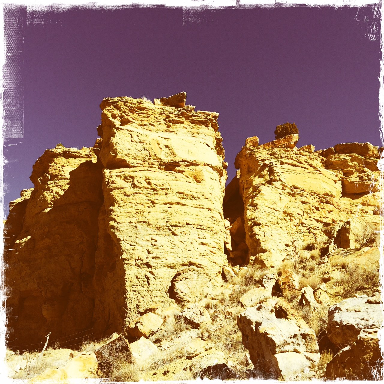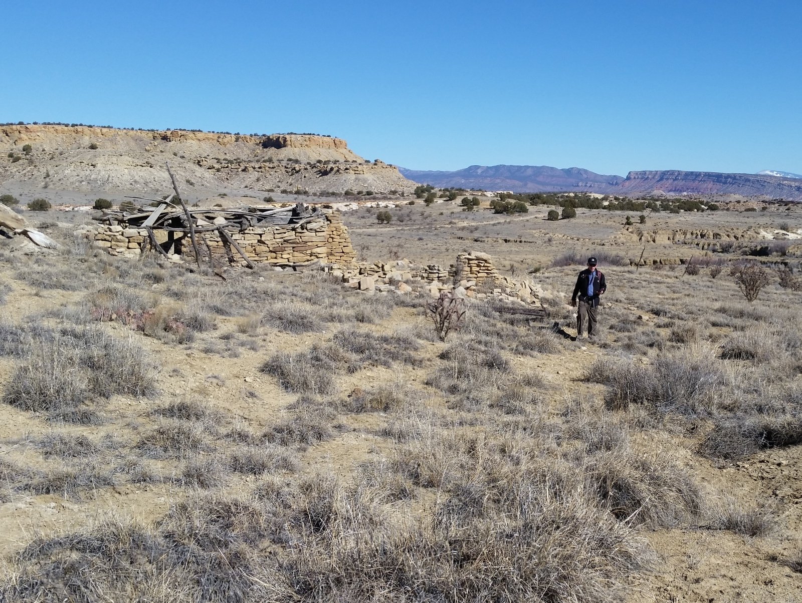 Jay here: What a surprising hike. Guess that’s what happens when you make your own trail — you never know what to expect. Cowpaths were abundant through much of the hike until we got up on top of the mesa and that helped in the early going. Coming upon the old stacked stone building was quite a surprise. Crawling under well maintained barbed wire fencing wasn’t too onerous but if we had to do it more than twice it would have gotten old. The kissing caprock will definitely require a return visit in later afternoon hours to really capture the uniqueness of the geology there.