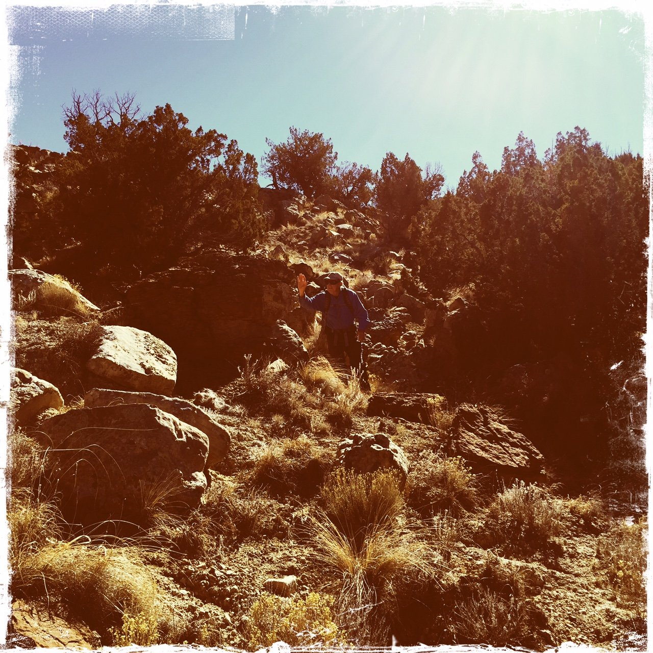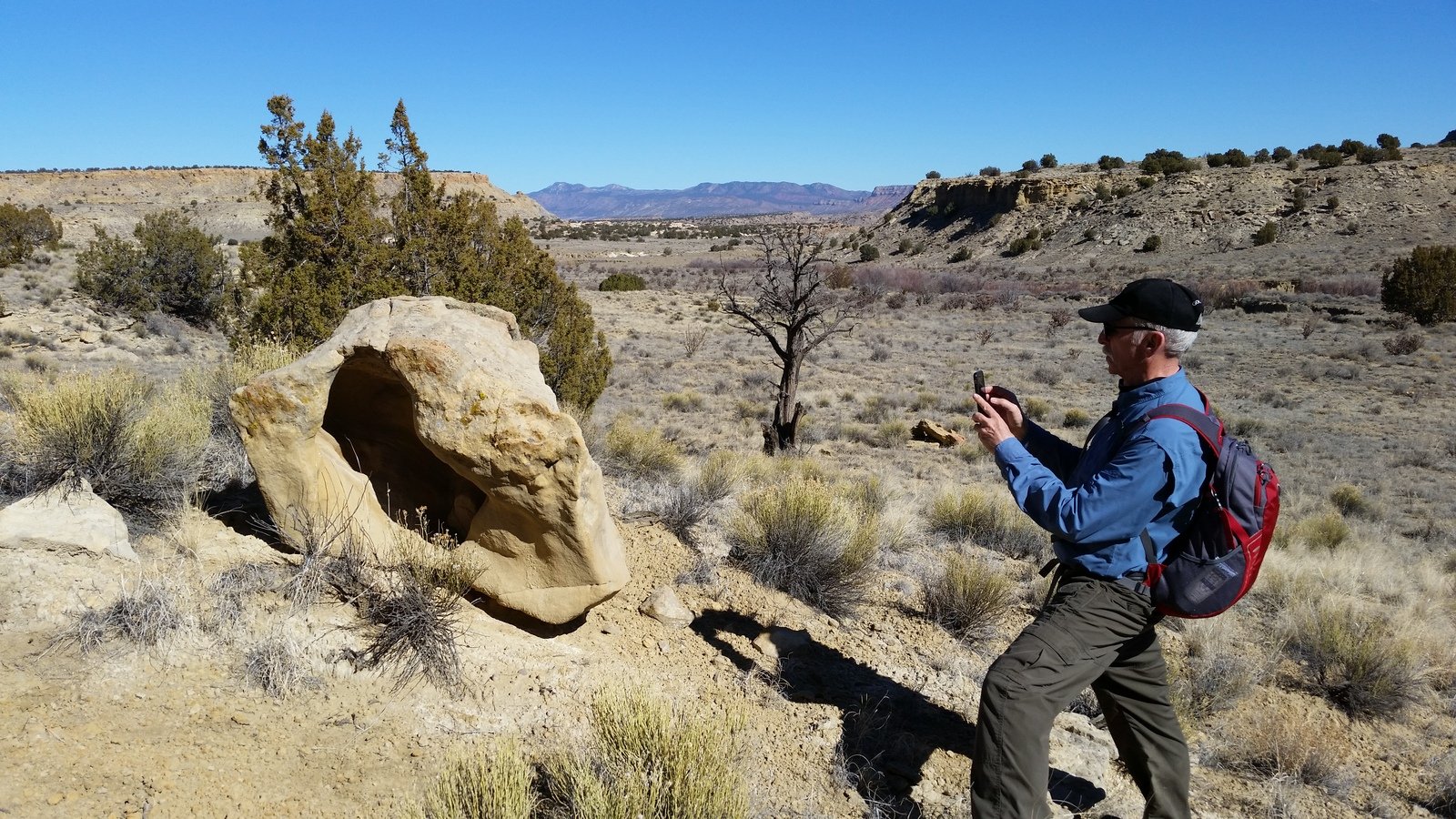 Having exhausted the hiking tracks from others, we’re setting off on our own in the Ojito Wilderness area. This time we explored a prominent mesa south of Cabezon Road and the boundary of the Wilderness. Using an exploration via Google Earth,we selected from 3 potentially interesting areas, a southward track up a canyon that splits the mesa, then across the top to descend to a “prospect” marked on the Topo maps (“prosect”: a potential mine before a claim is made?).