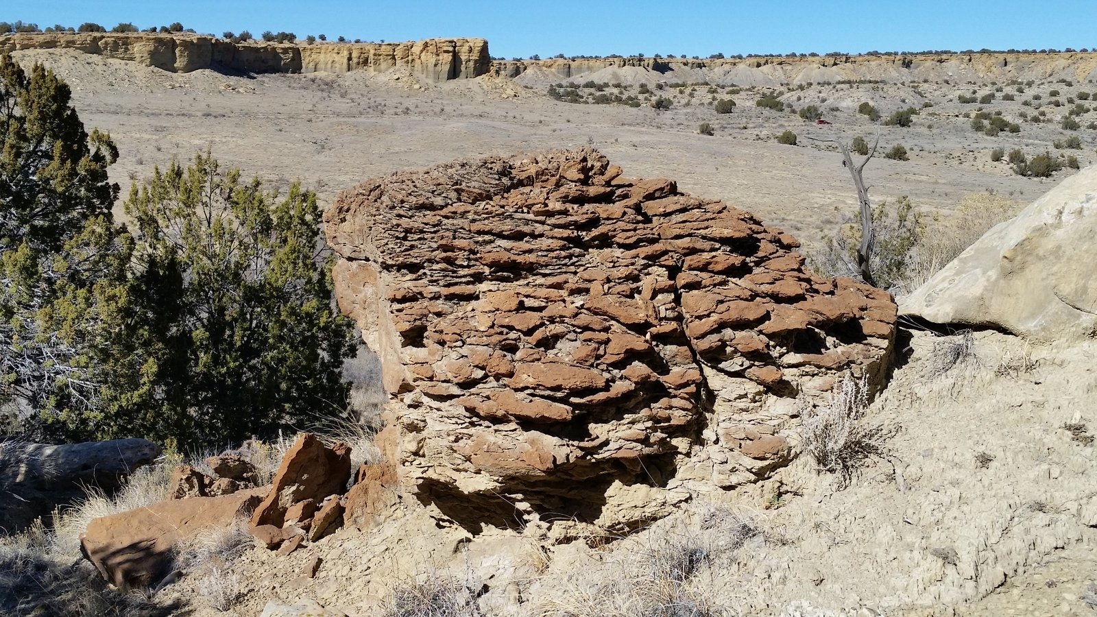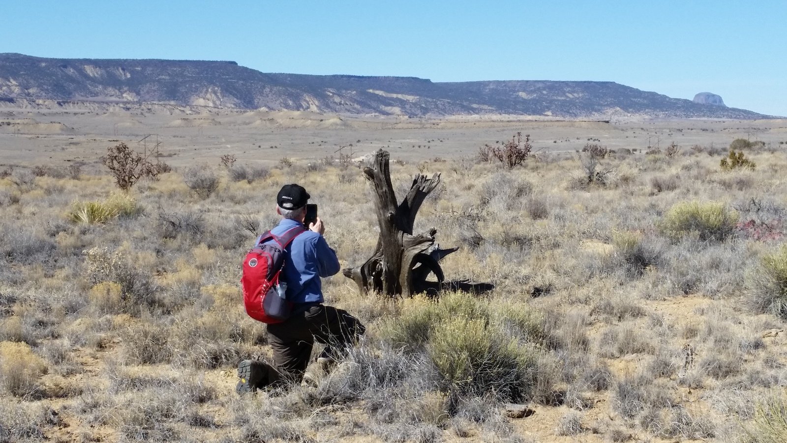 View to the North — Ojito Mesa South Hike.Jay.02/05/2017 – Exploring a mesa south of Cabezon Road and the Ojito Wilderness. In the background: Bernalillito Mesa, Hoodoo Pines, and Dinosaur Dig (previous hikes). And on the horizon, the Nacimiento Mountains, east of US 550 on the way from San Ysidro to Cuba. (Get the .KML file below into GoogleEarth to take the “tour”.)