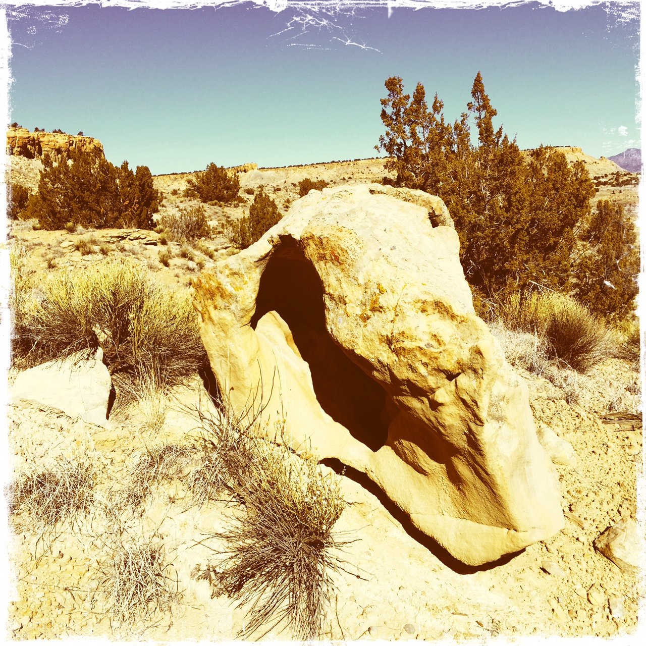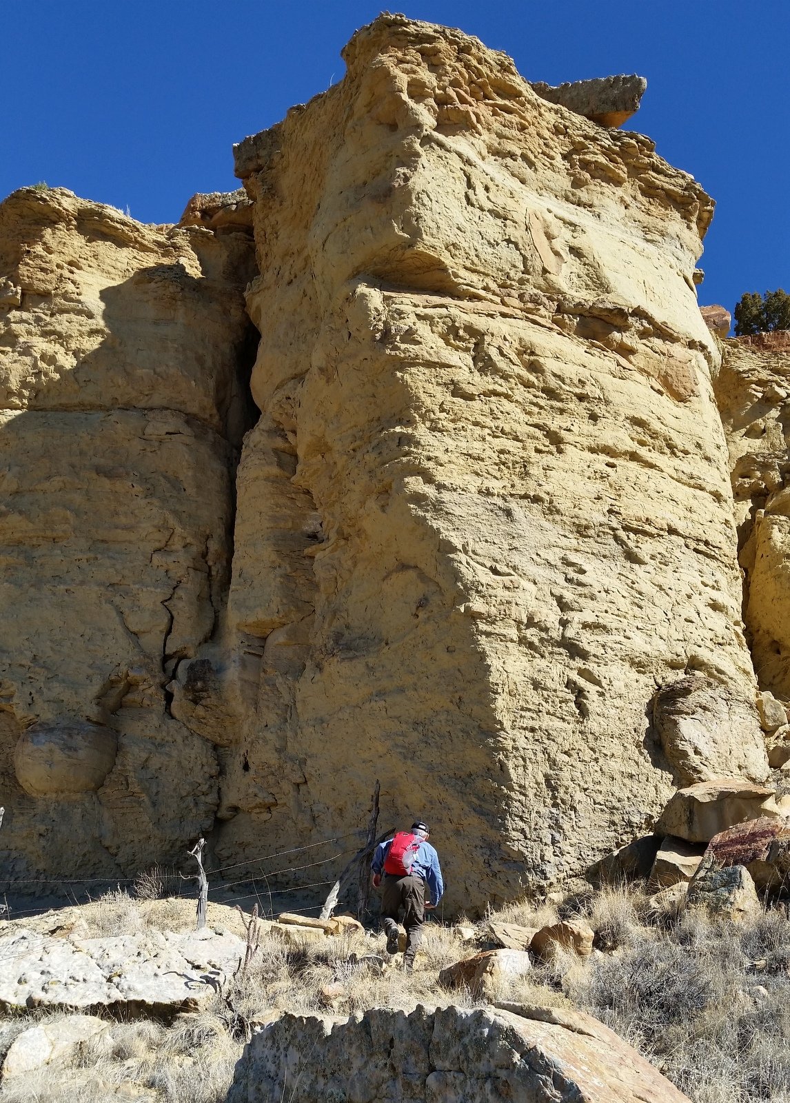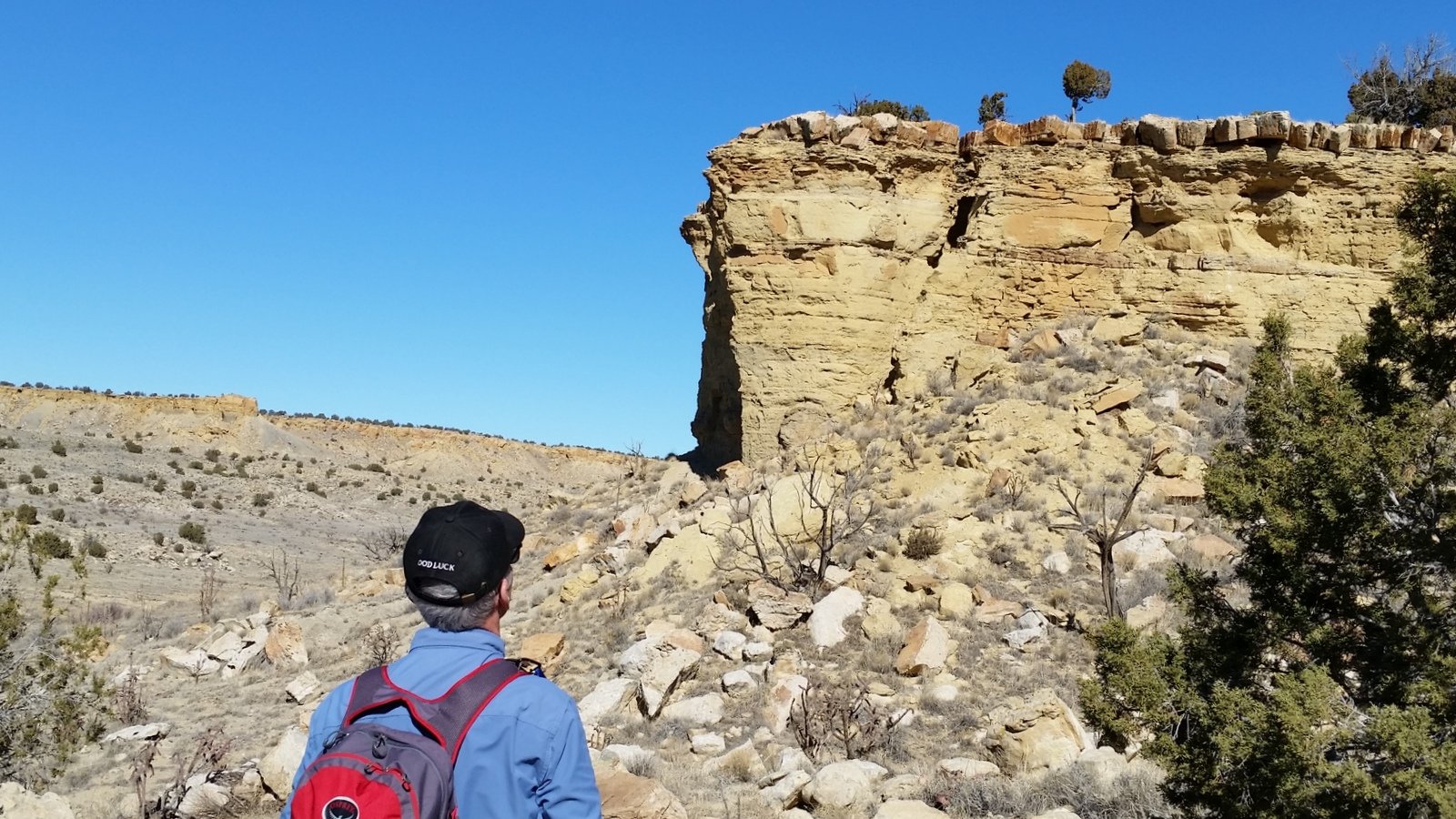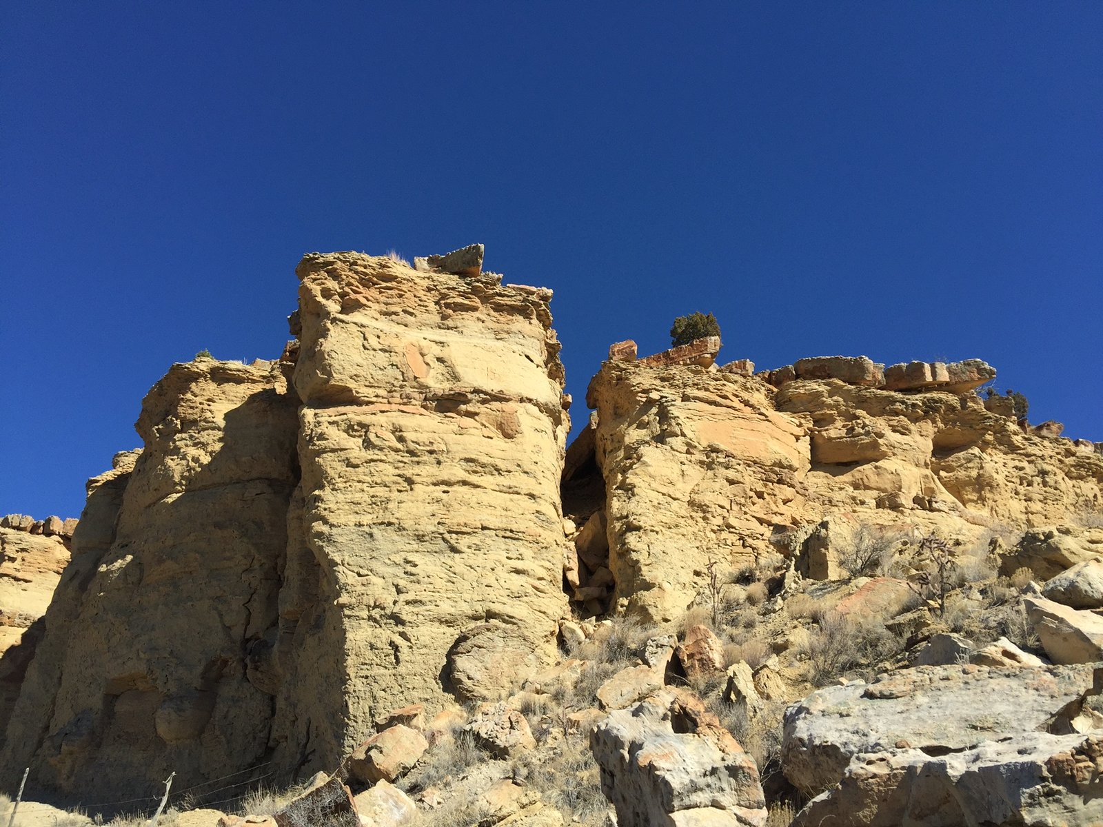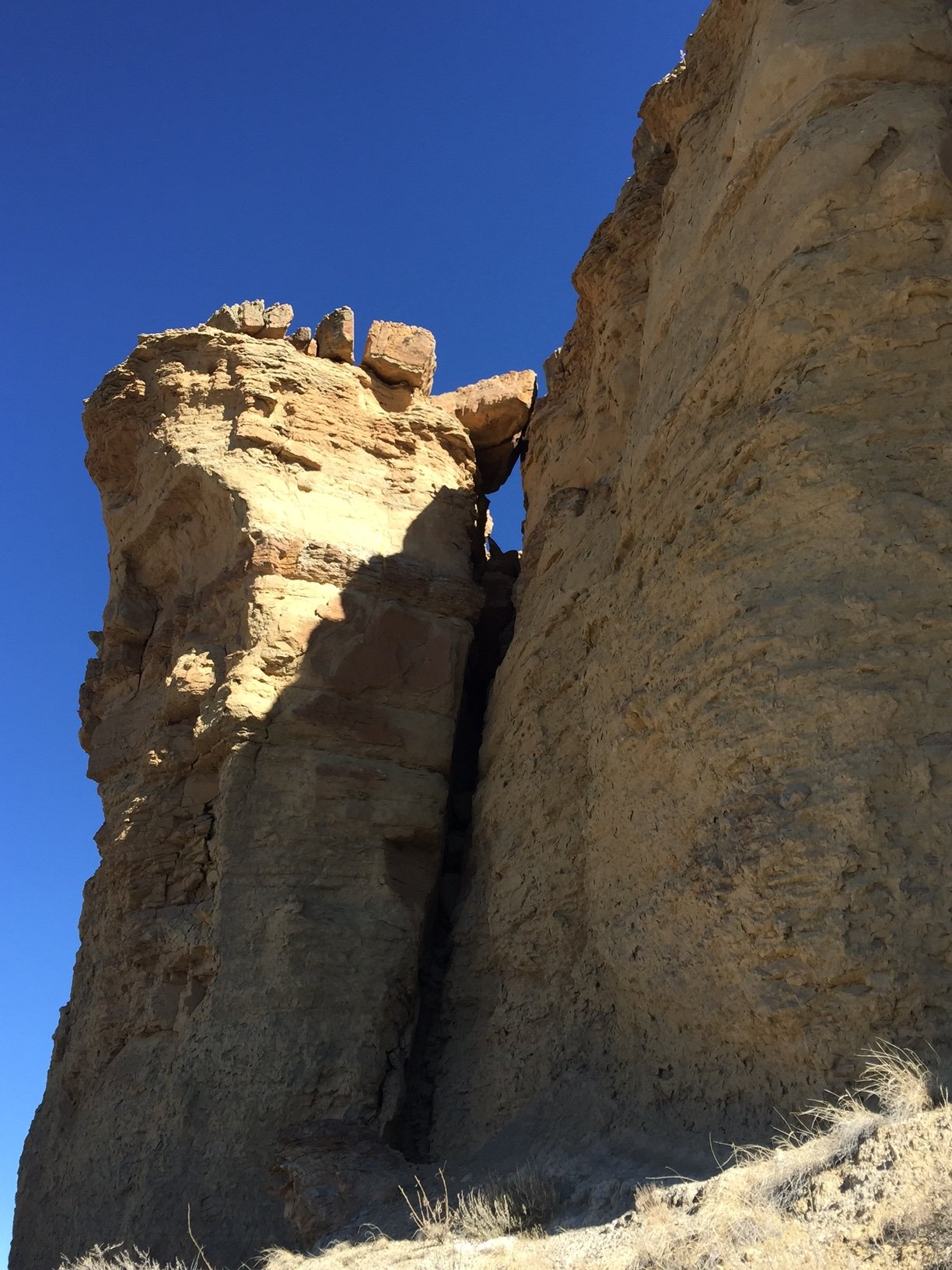 Using “US Topo Maps”, an App that I carry on my Smartphone and Tablet, we navigated to the “prospect”. We found what looked like an old excavation: a hole and an adjacent mound of soil, and figured we had found it. The descent off of the mesa was a bit steep but easy. At the bottom we encountered another fence, decided to get across it by going through the space between the canyon wall and the last fence post. Now standing beneath a 100’+ sheer wall, we marveled at it’s overhang and the large clefts in its face, the result of water running between cracks in the caprock that washed out a “split” in the cliff. And looking up at one of these we were amazed to see daylight through the back of the cleft, behind a bridge formed by two “kissing” sections of the caprock. (See photos below.)