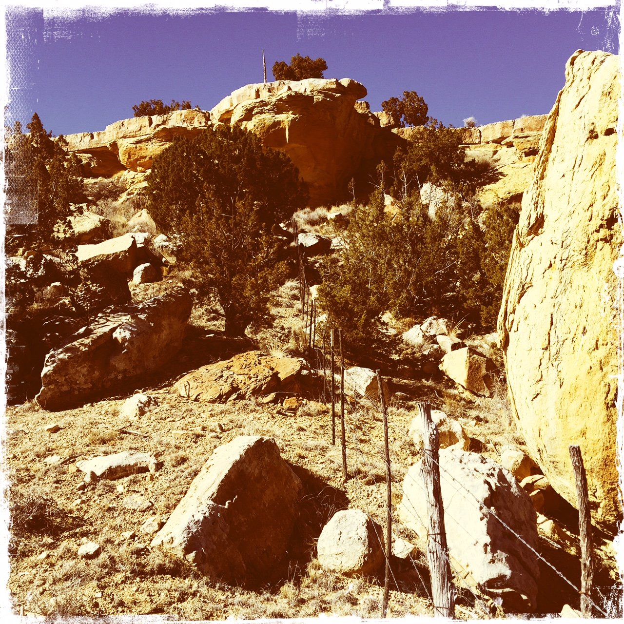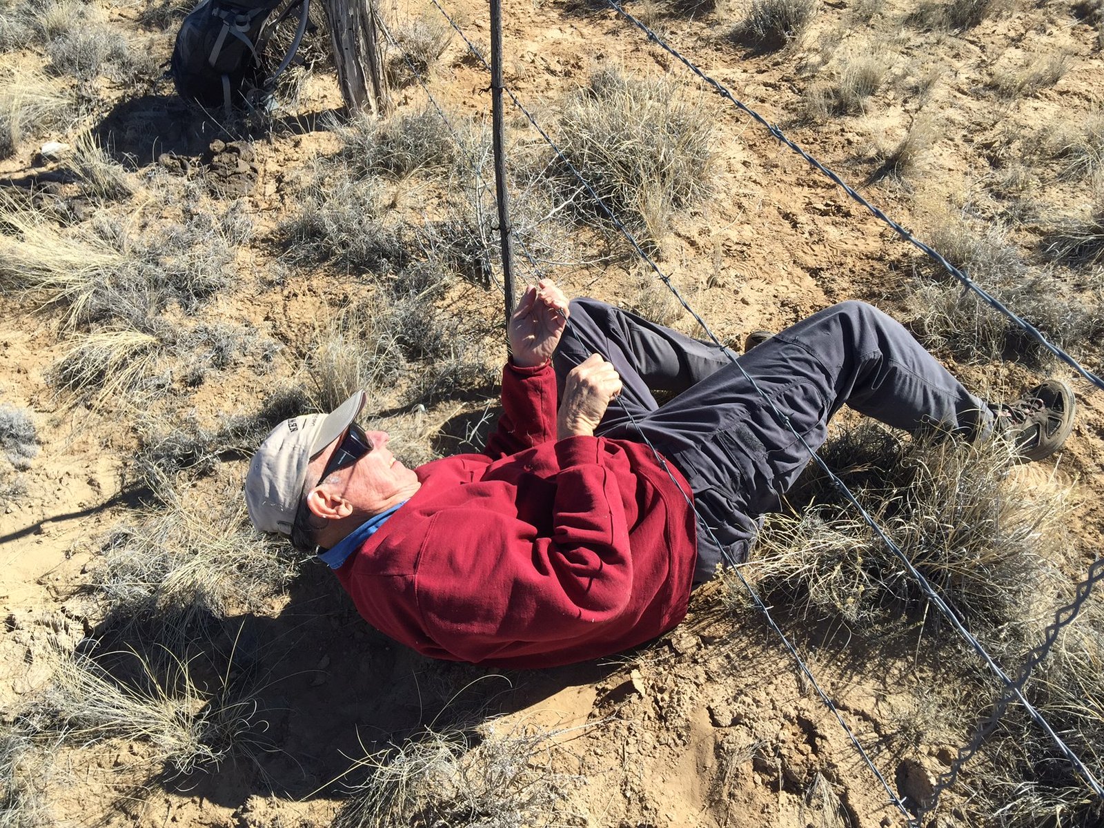 We continued south in the canyon, beneath 100′ t0 150′ walls of the west side of the mesa. The ground was largely dirt, with rocks nearer the canyon walls Overall the hiking was easy (especially when we could follow the numerous cattle trails). We encountered one of the best-built barbed wire fences we’ve seen, very tight wire not allowing one to make enough space to slip through – we ended up crawling under the bottom wire. When the slope up to the mesa top became easy, we ascended to very open, generally flat, and nearly level terrain; oh, we had to cross that fence again.